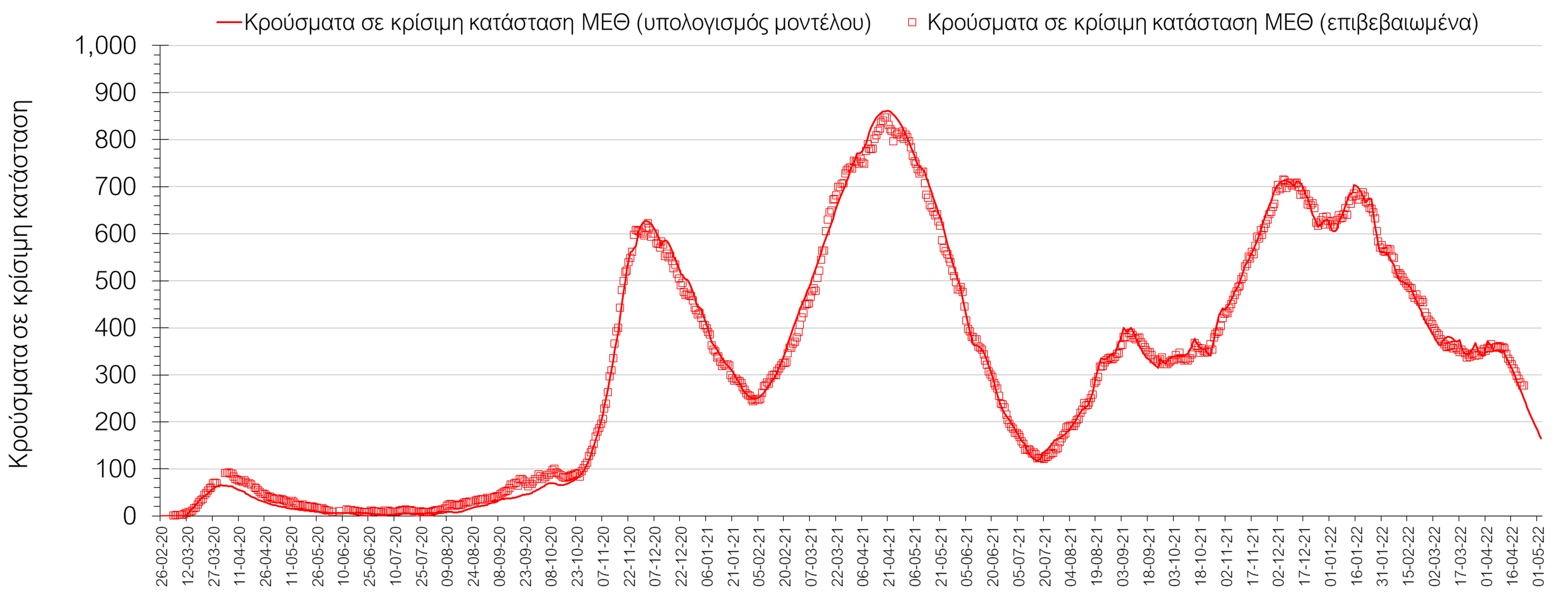 Όσον αφορά στους ασθενείς σε κρίσιμη κατάσταση (διασωληνωμένοι σε ΜΕΘ), ο αριθμός είναι πρακτικά ίδιος σε σχέση με Μεγάλη Παρασκευή (277 από 278). Η καμπύλη εξέλιξης του αριθμού των ασθενών που νοσηλεύονται σε κλίνες ΜΕΘ με βάση τις προσομοιώσεις της πλατφόρμας CORE, παρουσιάζεται στο Σχήμα 1, των ασθενών που νοσηλεύονται σε απλές κλίνες στο Σχήμα 2, ενώ η εκτίμησή μας για την πορεία των θανάτων ανά ημέρα παρουσιάζεται στο Σχήμα 3.