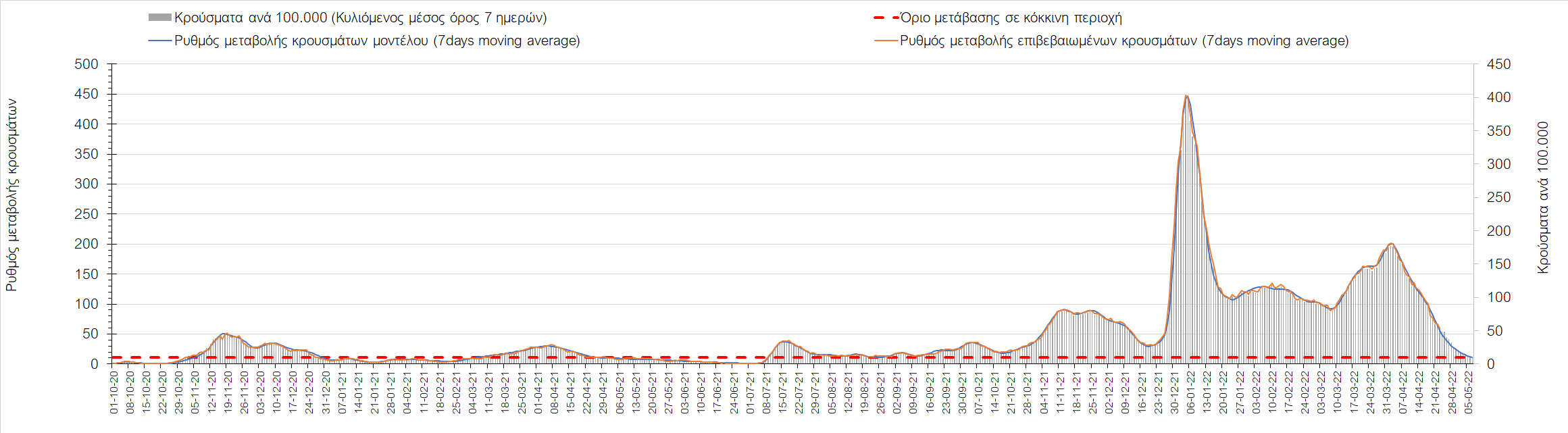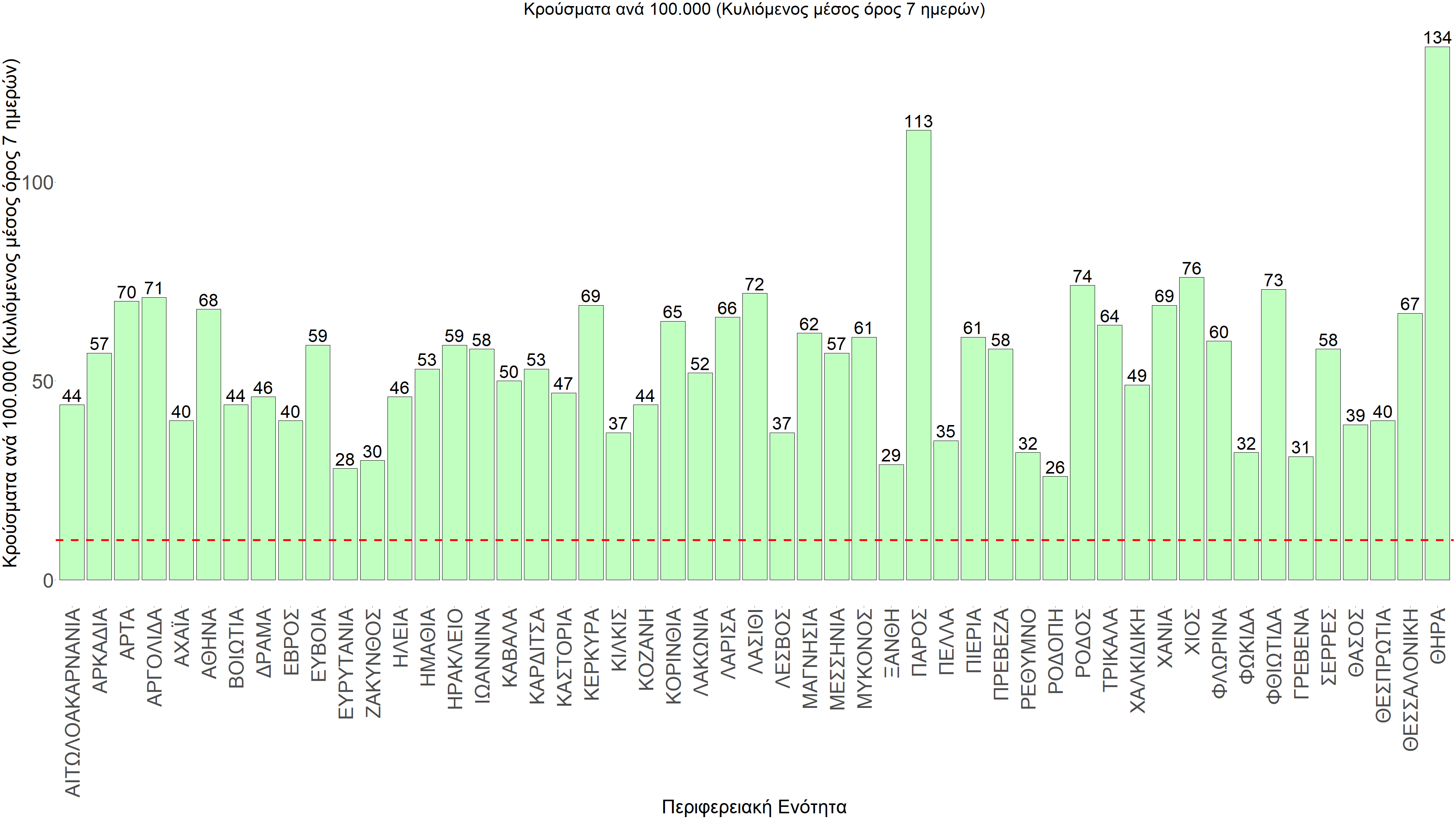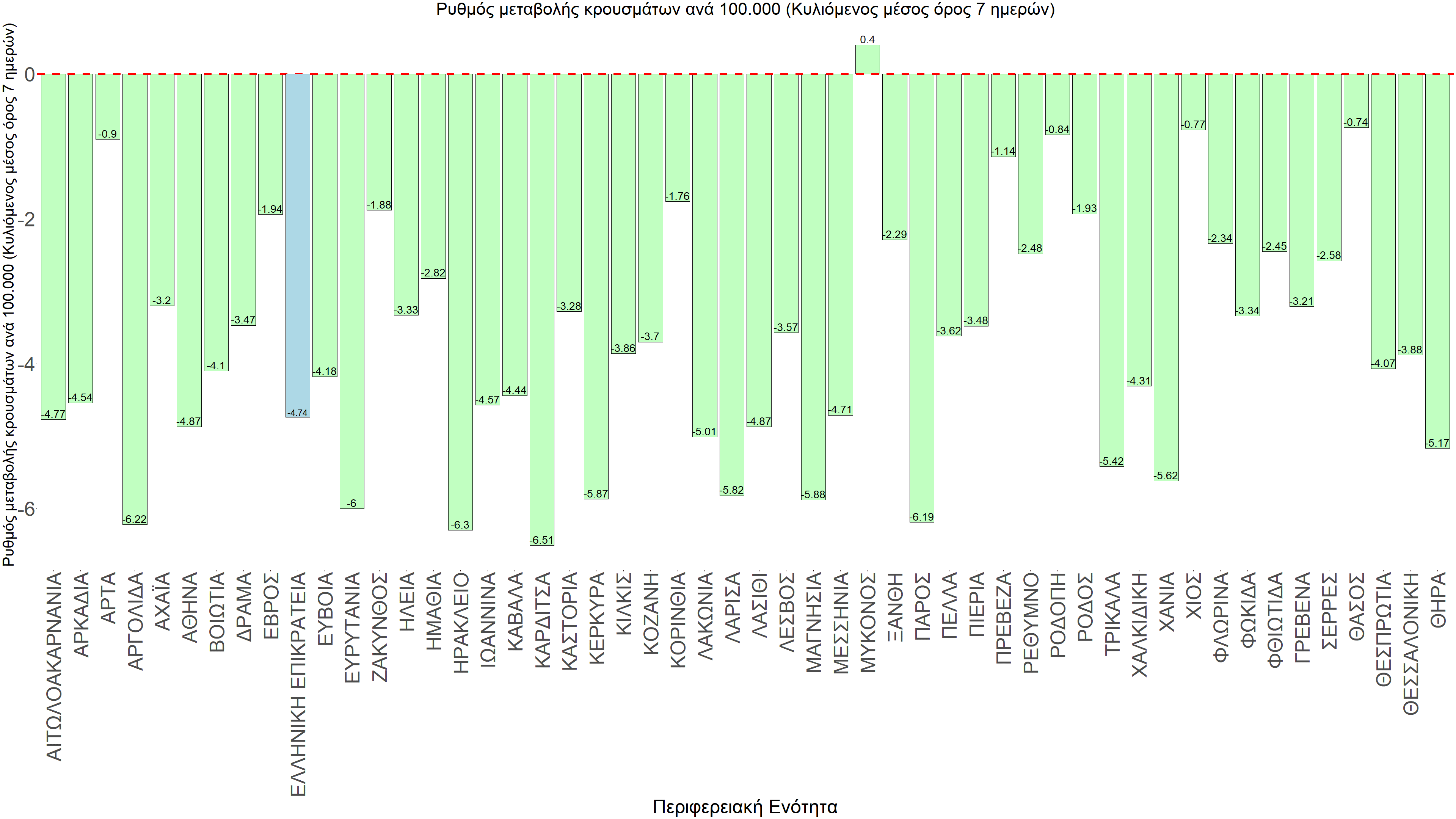 Η αποτύπωση των τάσεων στις επιμέρους περιοχές, παρουσιάζεται στο Σχήμα 61, όπου παρουσιάζεται ο ρυθμός μεταβολής των νέων κρουσμάτων ανά 100.000 κατοίκους (κυλιόμενος μέσος όρος 7 ημερών) των επιμέρους περιοχών. Θετικές τιμές του ρυθμού μεταβολής υποδηλώνουν άνοδο, ενώ αρνητικές τιμές υποδηλώνουν πτωτική πορεία.