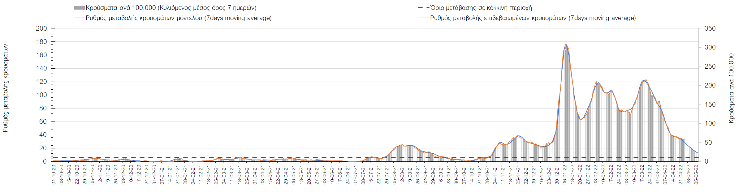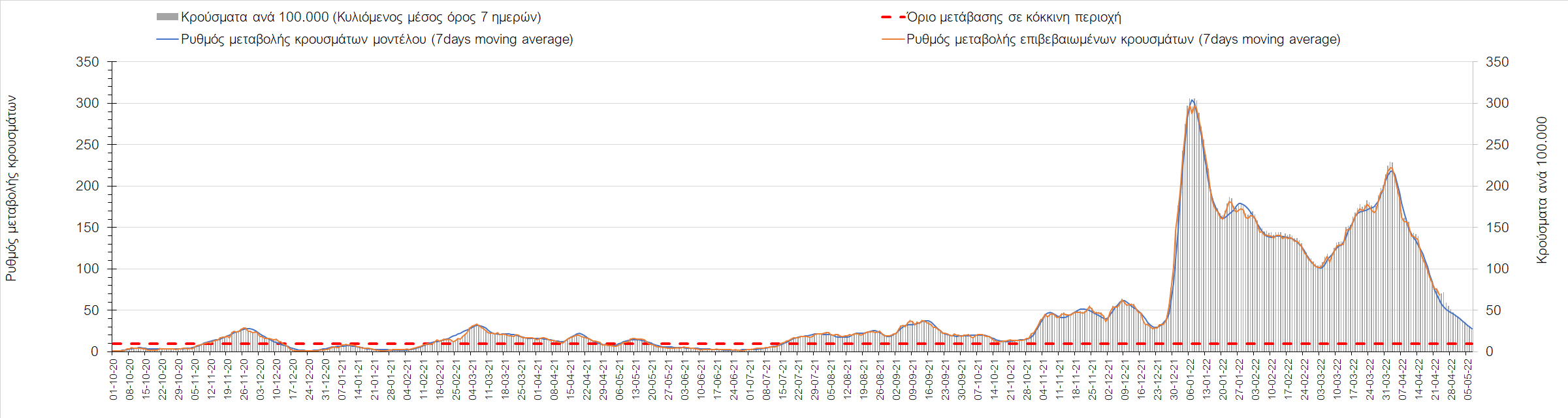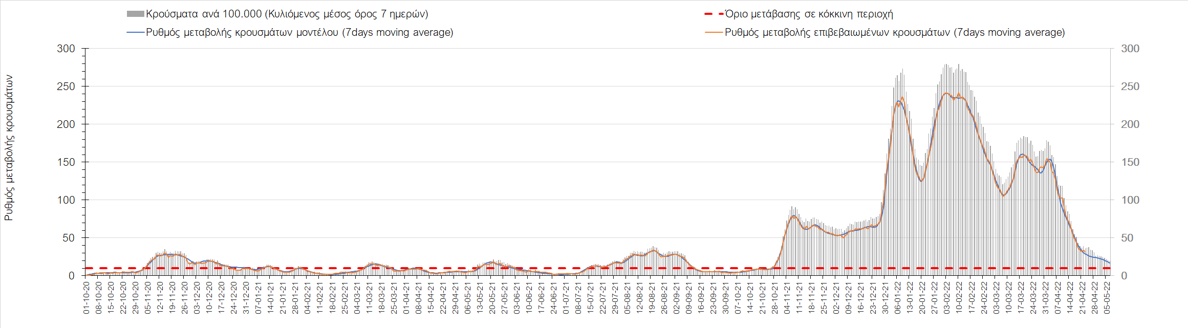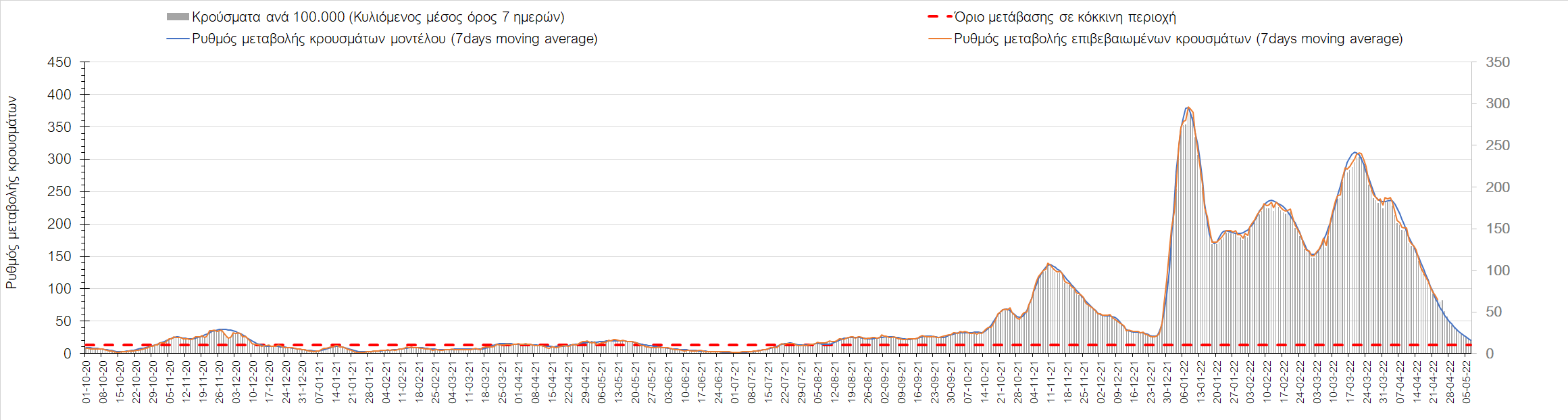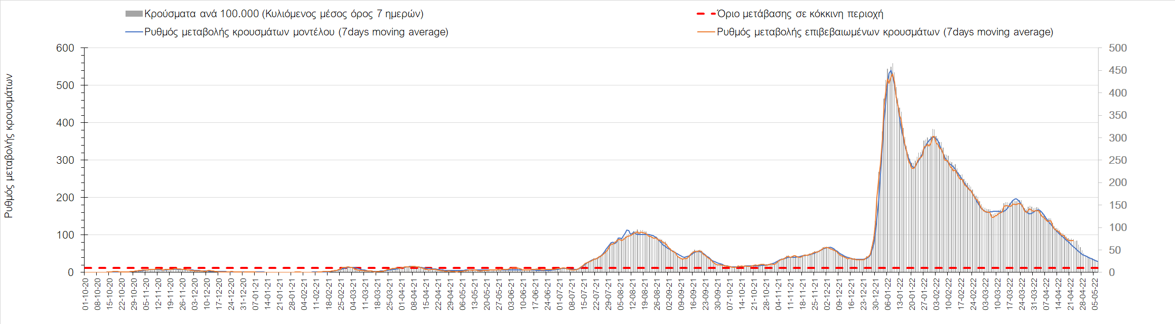 Πλέον, η συνολική ανοσία στον πληθυσμό, τόσο τεχνητή, όσο και φυσική μετά από νόσηση, τα πολλά τεστ (αν και μειωμένα σε σχέση με τις προηγούμενες εβδομάδες) καθώς και η άνοδος της θερμοκρασίας συντελούν πλέον στη συστηματική αποκλιμάκωση της πανδημίας.