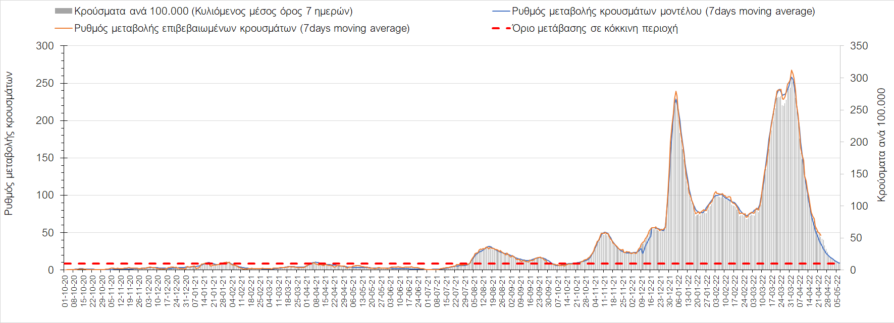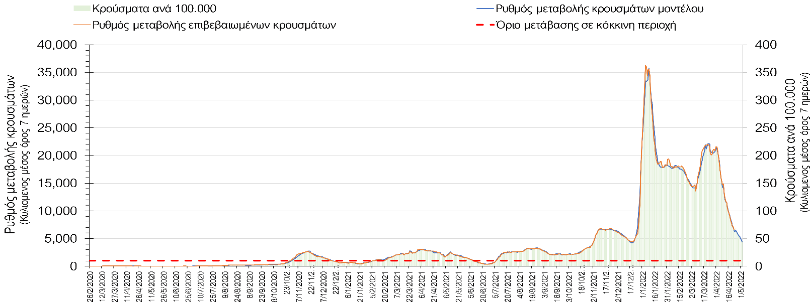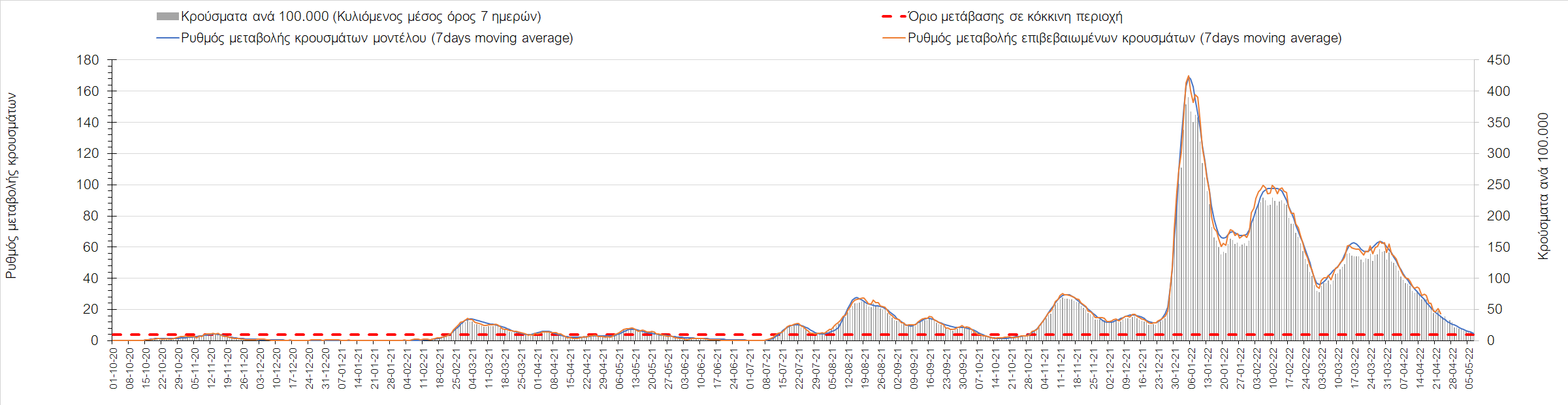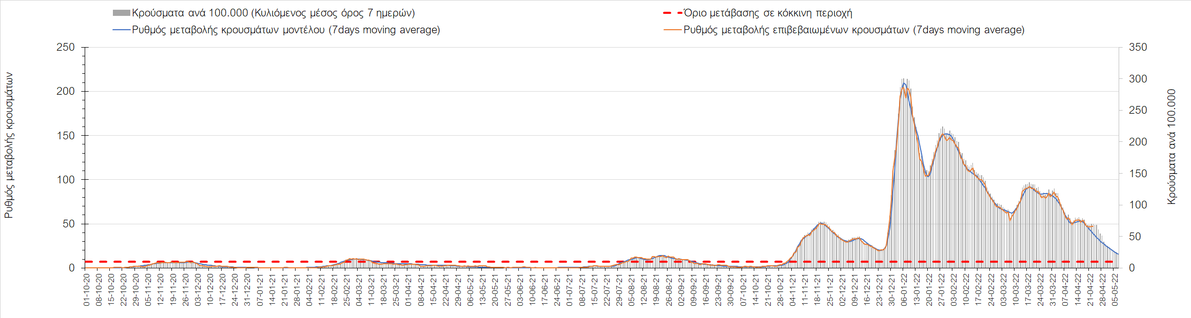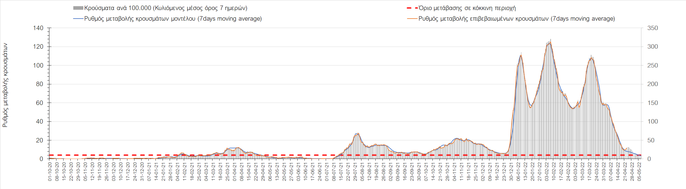 Πλέον, η συνολική ανοσία στον πληθυσμό, τόσο τεχνητή, όσο και φυσική μετά από νόσηση, τα πολλά τεστ (αν και μειωμένα σε σχέση με τις προηγούμενες εβδομάδες) καθώς και η άνοδος της θερμοκρασίας συντελούν πλέον στη συστηματική αποκλιμάκωση της πανδημίας.