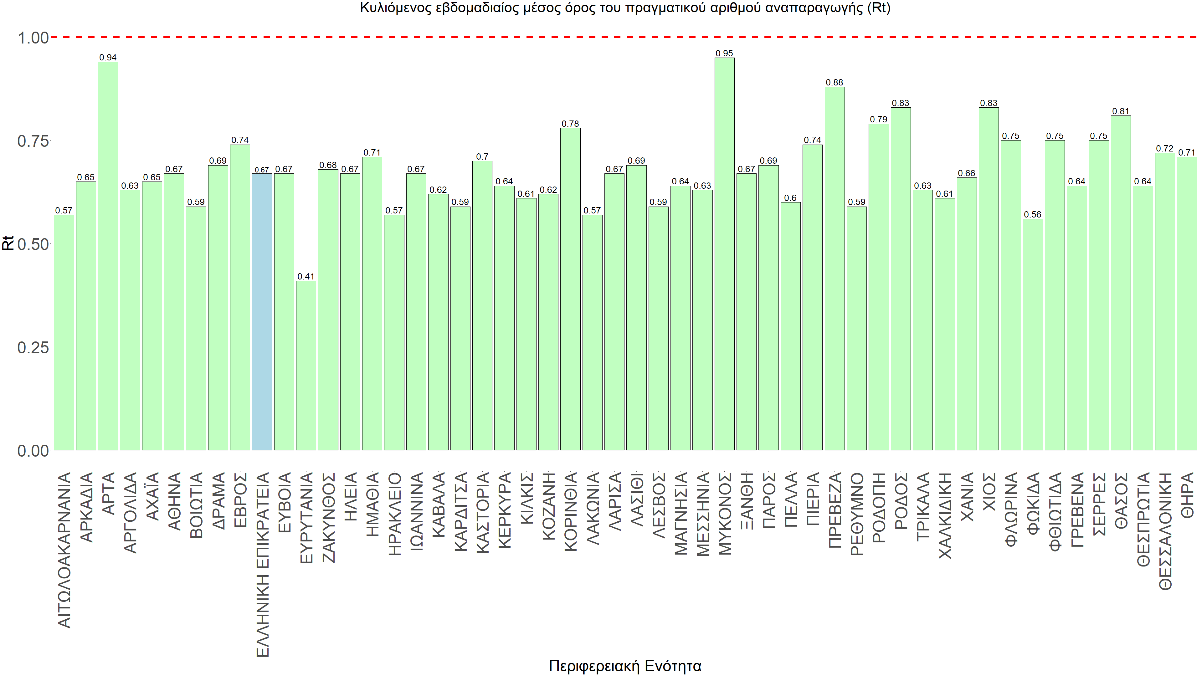 O πραγματικός αριθμός αναπαραγωγής Rt ανά περιφερειακή ενότητα της χώρας παρουσιάζεται στο Σχήμα 58.