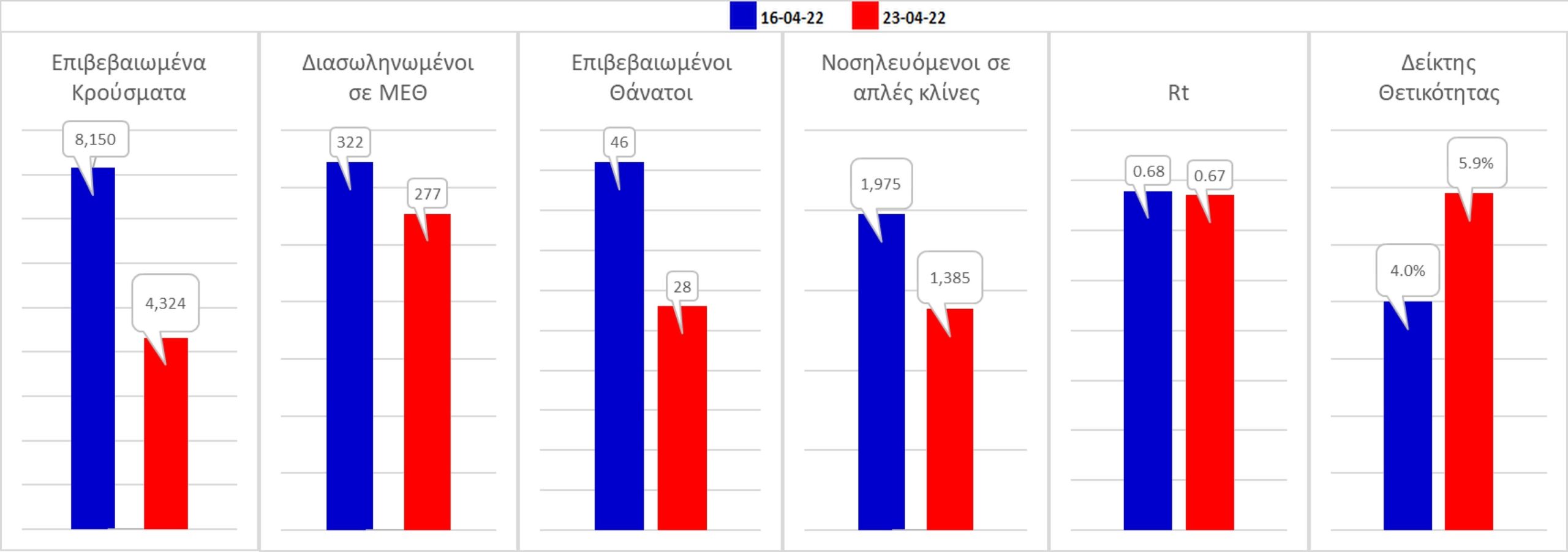 Σχήμα 59. Συγκριτικά αποτελέσματα της επιδημιολογικής εικόνας του σημερινού Σαββάτου (23/04/2022) σε σχέση με το προηγούμενο (16/04/2022)