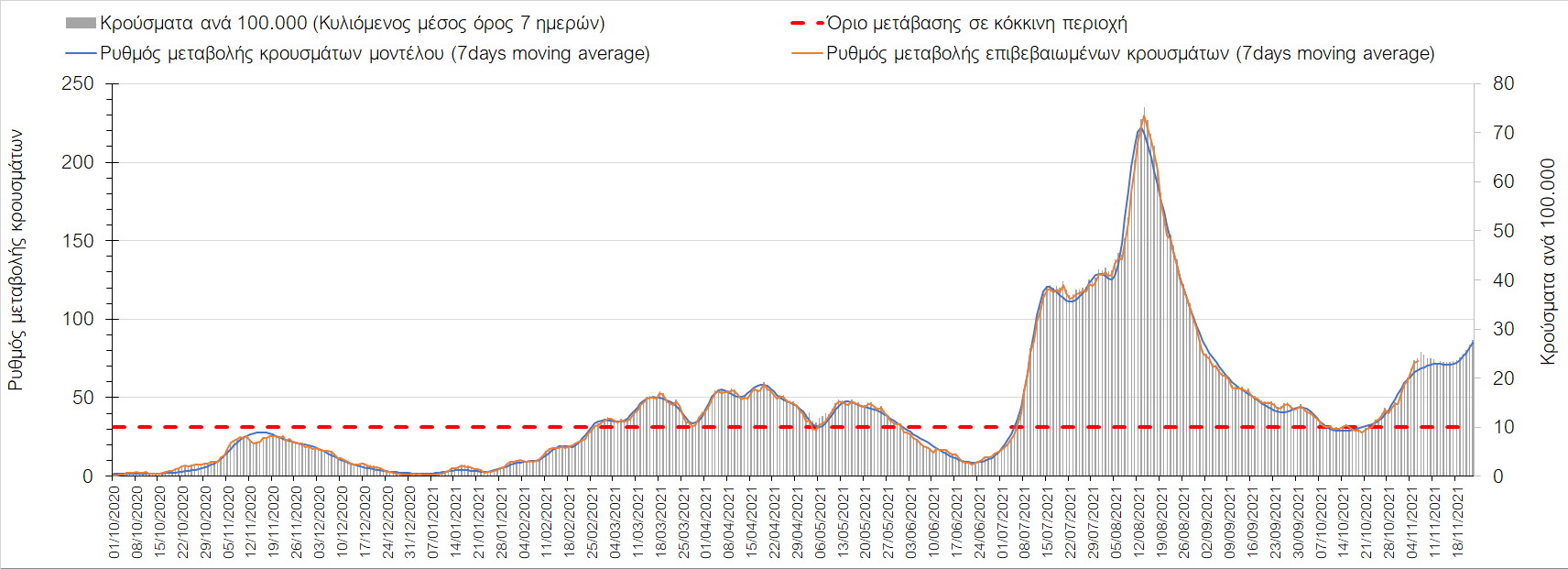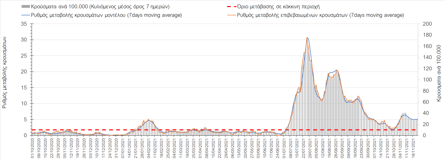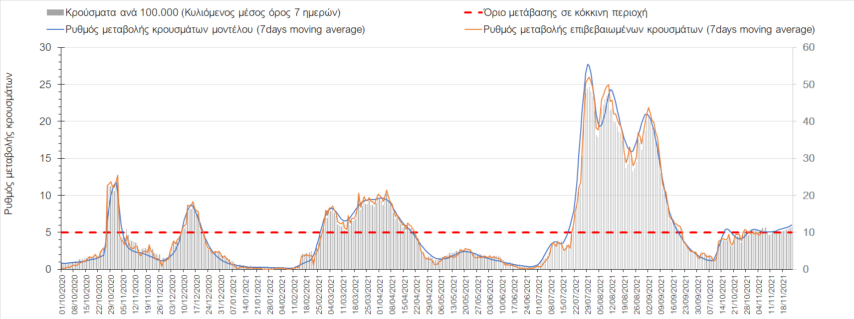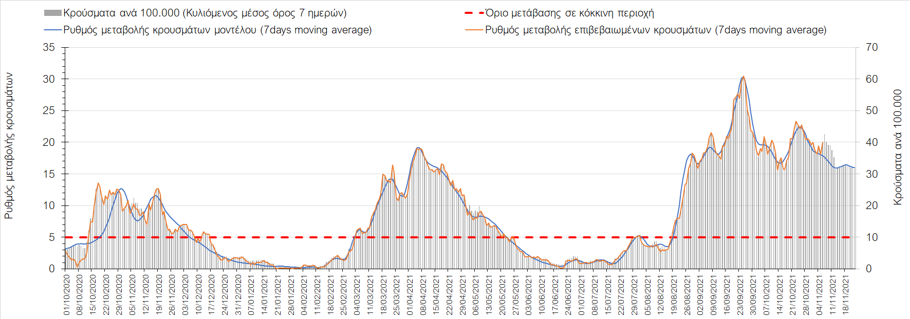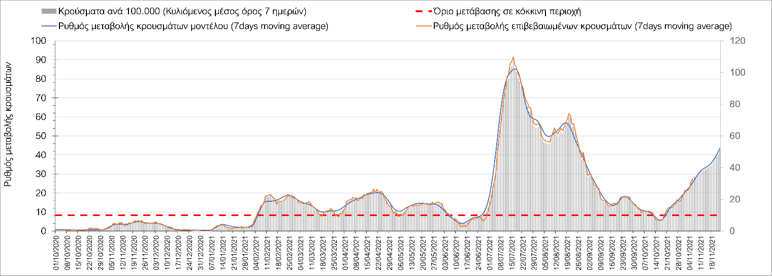 Συνολικά η ανοδική τάση των τελευταίων ημερών αντικατοπτρίζεται και από τον ημερήσιο αριθμό των κρουσμάτων (κυλιόμενος μέσος όρος 7 ημερών), ο οποίος ξεπέρασε τα 5800 (5877). Γενικά την τελευταία εβδομάδα παρατηρείται ακόμη εντονότερη αύξηση του αριθμού των κρουσμάτων (κυλιόμενος μέσος όρος 7 ημερών) που ξεκίνησε την προηγούμενη, κάτι που αναμέναμε να συμβεί μετά τα μέσα Οκτώβρη. Εφιστούμε την προσοχή στην αναγκαία αύξηση του αριθμού των self-test, ο οποίος έχει μειωθεί σε περίπου 300.000 από 400.000 ημερησίως που ήταν μέχρι και πριν 4 εβδομάδες (μέσος όρος 7 ημερών), ενώ με βάση το υπάρχον τείχος ανοσίας (φυσικό και επίκτητο μέσω εμβολιασμών), έχει υπολογιστεί ότι αύξηση τους στις 600.000 θα συντελέσει σε διαχειρίσιμη επιδημιολογική εικόνα στους επόμενους μήνες. Επίσης παρατηρείται το φαινόμενο, όπου περιφέρειες που είχαν περιέλθει σε αποκλιμάκωση, να επανέρχονται σε ανοδική τάση, ακολουθώντας την ανοδική πορεία της όμορης περιφέρειας που ήταν ήδη σε ανοδική τροχιά, με εμφανές παράδειγμα τη Λάρισα και τις υπόλοιπες περιοχές της Θεσσαλίας, ιδιαίτερα τη Μαγνησία τα Τρίκαλα αρχικά και την Καρδίτσα τώρα. Με δεδομένη την πτώση της θερμοκρασίας των επομένων ημερών και την περαιτέρω επιτάχυνση της ανόδου των κρουσμάτων, καλό θα ήταν να υπάρξει έλεγχος στις διαπεριφερειακές μετακινήσεις, με έλεγχο είτε του πιστοποιητικού εμβολιασμού ή δηλωμένου rapid-test ή πιστοποιητικού νόσησης τους τελευταίους 6 μήνες, στα διόδια και στις εξόδους των πόλεων, έτσι ώστε να μειώνονται όσο το δυνατόν περισσότερο οι πιθανότητες μετάδοσης του ιού μεταξύ των όμορων περιφερειών. Επίσης σε περιοχές όπως οι τρεις παραπάνω και η Δράμα, η Ημαθία και η Ξάνθη που εμφανίζουν συνεχή και ταχεία αύξηση της διασποράς του SARS-CoV-2 στην κοινότητα θα ήταν καλό να επιβληθεί αυστηρότερη τήρηση των μέτρων προστασίας με υποχρεωτική τήρηση της απόστασης των 2 μέτρων και χρήση της μάσκας (ΚΝ94, ΚΝ95 ή διπλή μάσκα) παντού.
