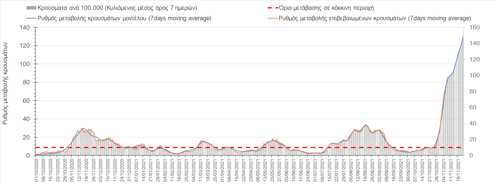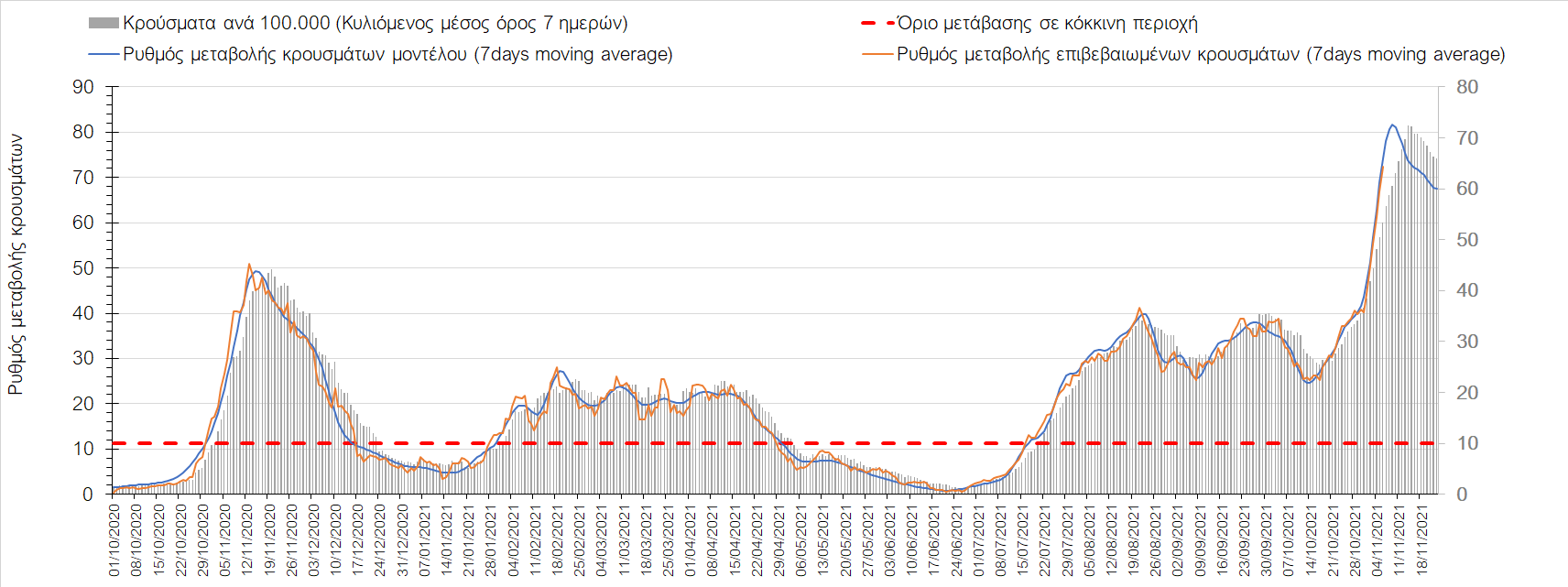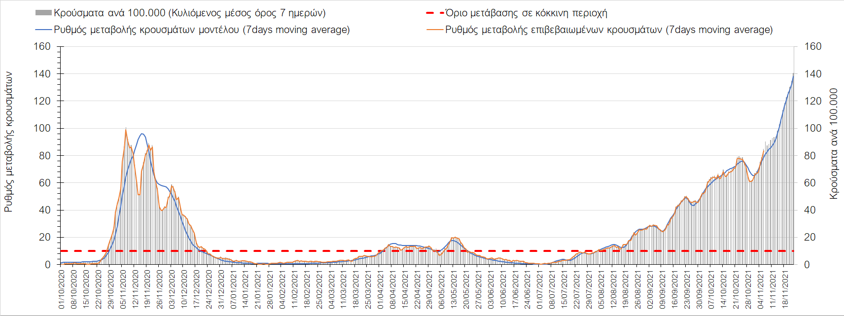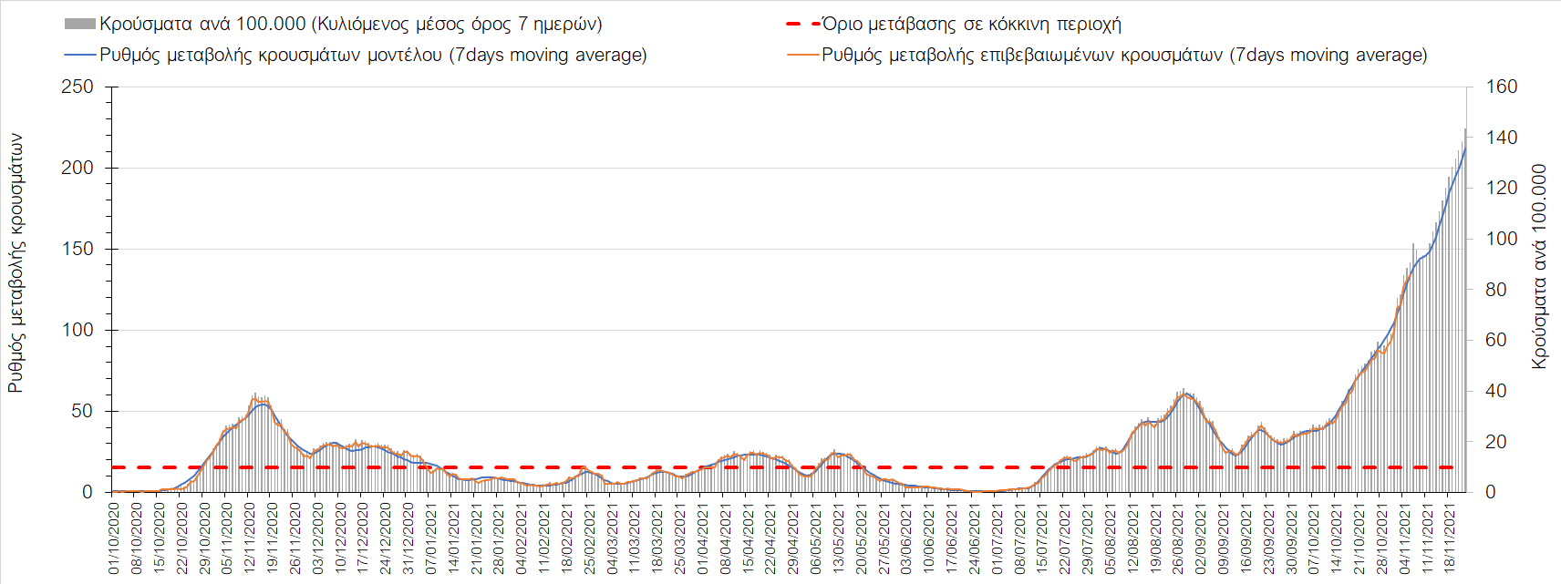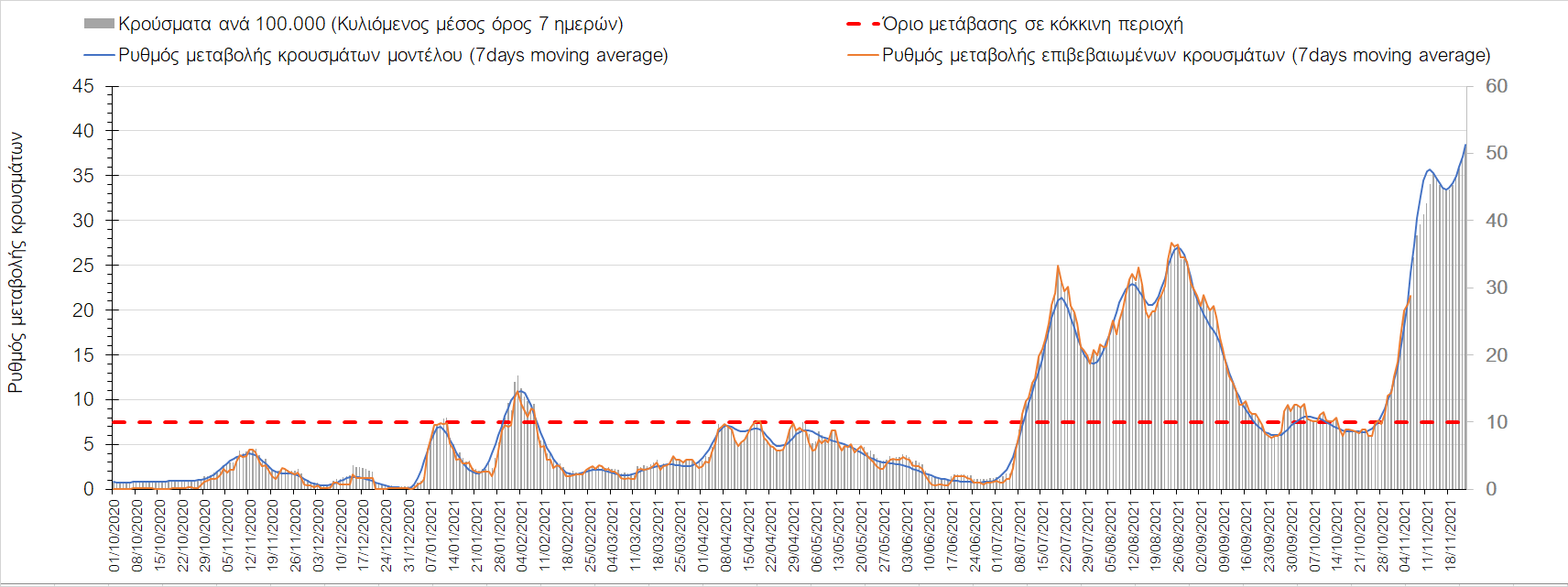 Συνολικά η ανοδική τάση των τελευταίων ημερών αντικατοπτρίζεται και από τον ημερήσιο αριθμό των κρουσμάτων (κυλιόμενος μέσος όρος 7 ημερών), ο οποίος ξεπέρασε τα 5800 (5877). Γενικά την τελευταία εβδομάδα παρατηρείται ακόμη εντονότερη αύξηση του αριθμού των κρουσμάτων (κυλιόμενος μέσος όρος 7 ημερών) που ξεκίνησε την προηγούμενη, κάτι που αναμέναμε να συμβεί μετά τα μέσα Οκτώβρη. Εφιστούμε την προσοχή στην αναγκαία αύξηση του αριθμού των self-test, ο οποίος έχει μειωθεί σε περίπου 300.000 από 400.000 ημερησίως που ήταν μέχρι και πριν 4 εβδομάδες (μέσος όρος 7 ημερών), ενώ με βάση το υπάρχον τείχος ανοσίας (φυσικό και επίκτητο μέσω εμβολιασμών), έχει υπολογιστεί ότι αύξηση τους στις 600.000 θα συντελέσει σε διαχειρίσιμη επιδημιολογική εικόνα στους επόμενους μήνες. Επίσης παρατηρείται το φαινόμενο, όπου περιφέρειες που είχαν περιέλθει σε αποκλιμάκωση, να επανέρχονται σε ανοδική τάση, ακολουθώντας την ανοδική πορεία της όμορης περιφέρειας που ήταν ήδη σε ανοδική τροχιά, με εμφανές παράδειγμα τη Λάρισα και τις υπόλοιπες περιοχές της Θεσσαλίας, ιδιαίτερα τη Μαγνησία τα Τρίκαλα αρχικά και την Καρδίτσα τώρα. Με δεδομένη την πτώση της θερμοκρασίας των επομένων ημερών και την περαιτέρω επιτάχυνση της ανόδου των κρουσμάτων, καλό θα ήταν να υπάρξει έλεγχος στις διαπεριφερειακές μετακινήσεις, με έλεγχο είτε του πιστοποιητικού εμβολιασμού ή δηλωμένου rapid-test ή πιστοποιητικού νόσησης τους τελευταίους 6 μήνες, στα διόδια και στις εξόδους των πόλεων, έτσι ώστε να μειώνονται όσο το δυνατόν περισσότερο οι πιθανότητες μετάδοσης του ιού μεταξύ των όμορων περιφερειών. Επίσης σε περιοχές όπως οι τρεις παραπάνω και η Δράμα, η Ημαθία και η Ξάνθη που εμφανίζουν συνεχή και ταχεία αύξηση της διασποράς του SARS-CoV-2 στην κοινότητα θα ήταν καλό να επιβληθεί αυστηρότερη τήρηση των μέτρων προστασίας με υποχρεωτική τήρηση της απόστασης των 2 μέτρων και χρήση της μάσκας (ΚΝ94, ΚΝ95 ή διπλή μάσκα) παντού.