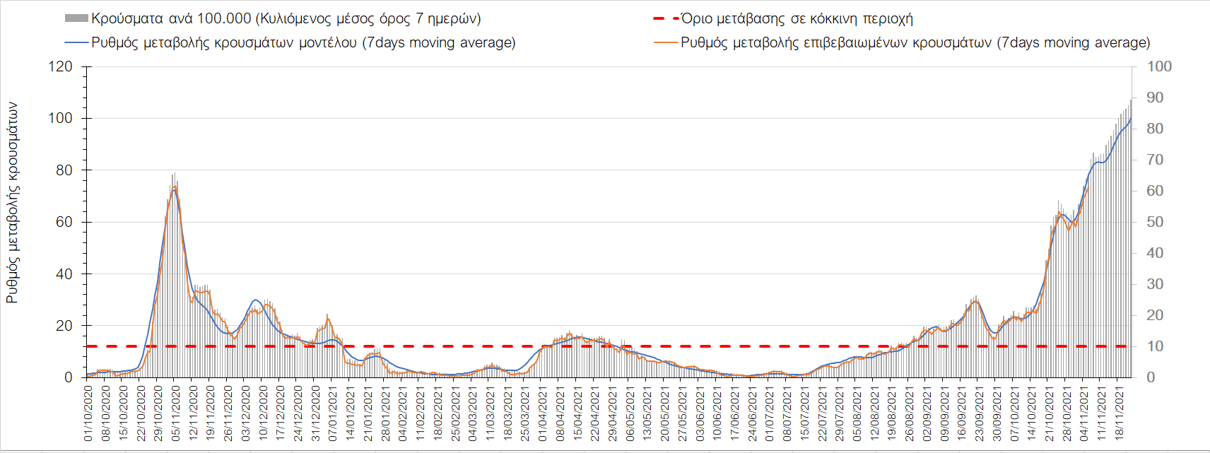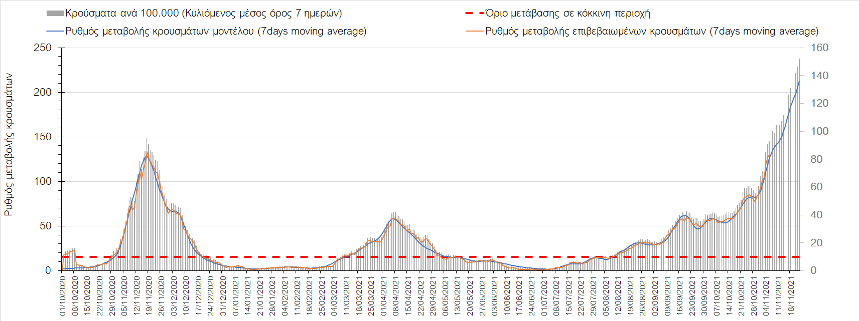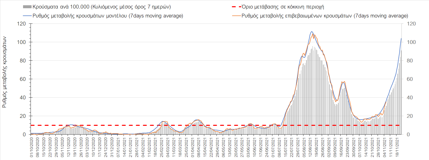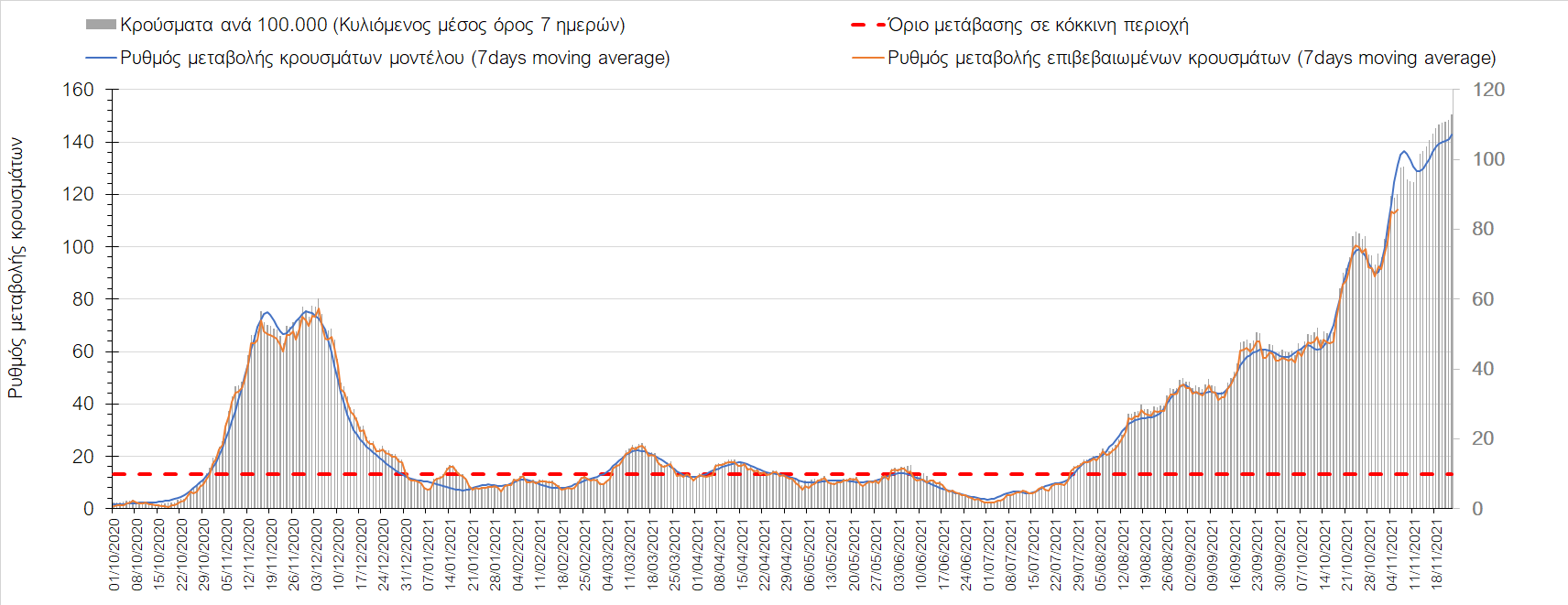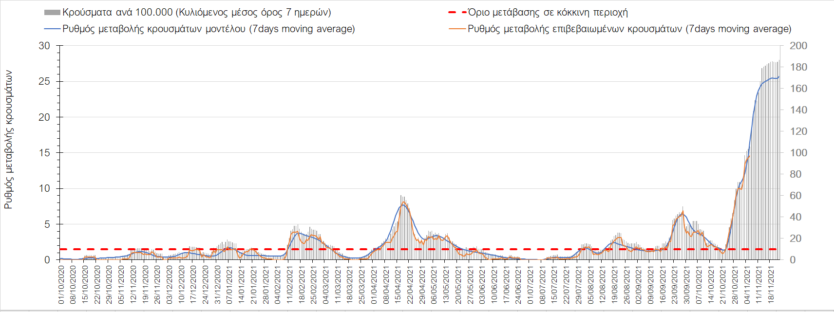 Συνολικά η ανοδική τάση των τελευταίων ημερών αντικατοπτρίζεται και από τον ημερήσιο αριθμό των κρουσμάτων (κυλιόμενος μέσος όρος 7 ημερών), ο οποίος ξεπέρασε τα 5800 (5877). Γενικά την τελευταία εβδομάδα παρατηρείται ακόμη εντονότερη αύξηση του αριθμού των κρουσμάτων (κυλιόμενος μέσος όρος 7 ημερών) που ξεκίνησε την προηγούμενη, κάτι που αναμέναμε να συμβεί μετά τα μέσα Οκτώβρη. Εφιστούμε την προσοχή στην αναγκαία αύξηση του αριθμού των self-test, ο οποίος έχει μειωθεί σε περίπου 300.000 από 400.000 ημερησίως που ήταν μέχρι και πριν 4 εβδομάδες (μέσος όρος 7 ημερών), ενώ με βάση το υπάρχον τείχος ανοσίας (φυσικό και επίκτητο μέσω εμβολιασμών), έχει υπολογιστεί ότι αύξηση τους στις 600.000 θα συντελέσει σε διαχειρίσιμη επιδημιολογική εικόνα στους επόμενους μήνες. Επίσης παρατηρείται το φαινόμενο, όπου περιφέρειες που είχαν περιέλθει σε αποκλιμάκωση, να επανέρχονται σε ανοδική τάση, ακολουθώντας την ανοδική πορεία της όμορης περιφέρειας που ήταν ήδη σε ανοδική τροχιά, με εμφανές παράδειγμα τη Λάρισα και τις υπόλοιπες περιοχές της Θεσσαλίας, ιδιαίτερα τη Μαγνησία τα Τρίκαλα αρχικά και την Καρδίτσα τώρα. Με δεδομένη την πτώση της θερμοκρασίας των επομένων ημερών και την περαιτέρω επιτάχυνση της ανόδου των κρουσμάτων, καλό θα ήταν να υπάρξει έλεγχος στις διαπεριφερειακές μετακινήσεις, με έλεγχο είτε του πιστοποιητικού εμβολιασμού ή δηλωμένου rapid-test ή πιστοποιητικού νόσησης τους τελευταίους 6 μήνες, στα διόδια και στις εξόδους των πόλεων, έτσι ώστε να μειώνονται όσο το δυνατόν περισσότερο οι πιθανότητες μετάδοσης του ιού μεταξύ των όμορων περιφερειών. Επίσης σε περιοχές όπως οι τρεις παραπάνω και η Δράμα, η Ημαθία και η Ξάνθη που εμφανίζουν συνεχή και ταχεία αύξηση της διασποράς του SARS-CoV-2 στην κοινότητα θα ήταν καλό να επιβληθεί αυστηρότερη τήρηση των μέτρων προστασίας με υποχρεωτική τήρηση της απόστασης των 2 μέτρων και χρήση της μάσκας (ΚΝ94, ΚΝ95 ή διπλή μάσκα) παντού.