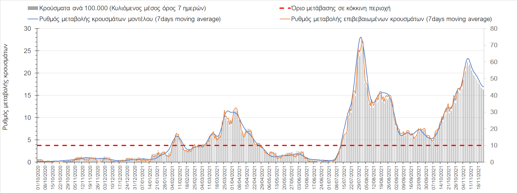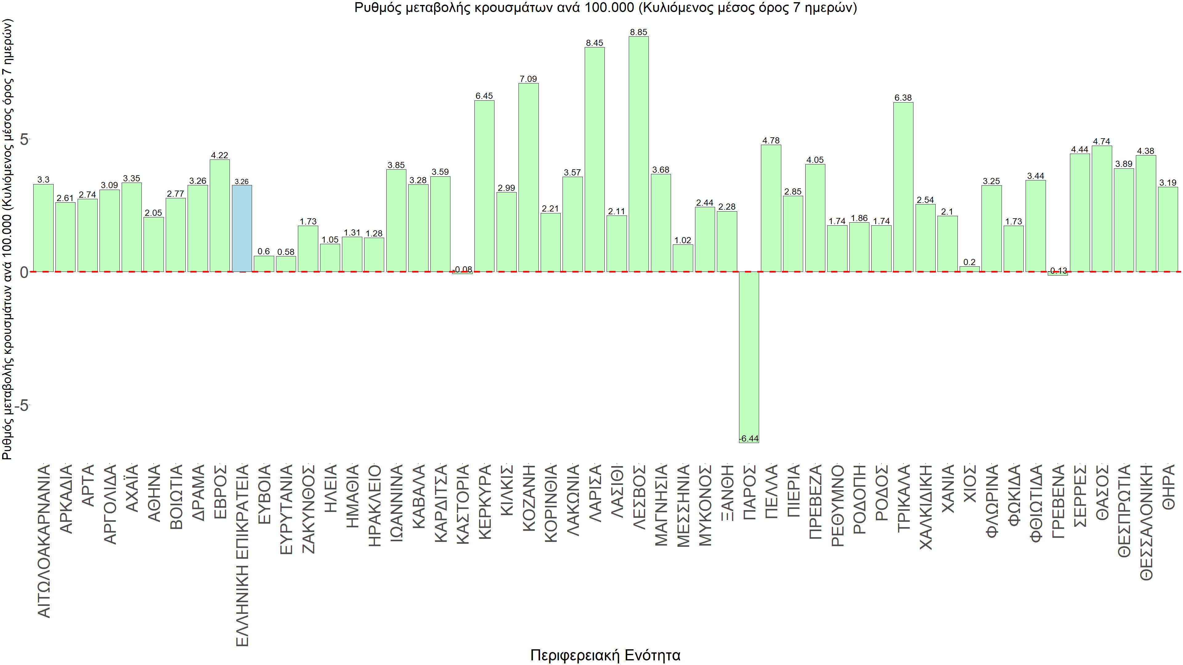 Η αποτύπωση των τάσεων στις επιμέρους περιοχές, παρουσιάζεται στο Σχήμα 61, όπου παρουσιάζεται ο ρυθμός μεταβολής των νέων κρουσμάτων ανά 100.000 κατοίκους (κυλιόμενος μέσος όρος 7 ημερών) των επιμέρους περιοχών. Θετικές τιμές του ρυθμού μεταβολής υποδηλώνουν άνοδο, ενώ αρνητικές τιμές υποδηλώνουν πτωτική πορεία. Το σχήμα αυτό είναι ιδιαίτερα κατατοπιστικό, γιατί οι τιμές που παρουσιάζονται είναι κανονικοποιημένες ως προς τον πληθυσμό, και η σύγκριση των τάσεων ανάμεσα στις επιμέρους περιοχές είναι άμεση. Με βάση και τα σημερινά δεδομένα, πολύ λίγες περιοχές της χώρα παρουσιάζουν αποκλιμάκωση της πανδημίας, πέρα από κάποιες που είναι είτε σε σταθεροποίηση (Καστοριά), είτε διανύουν διακυμάνσεις από μέρα σε μέρα (Γρεβενά).