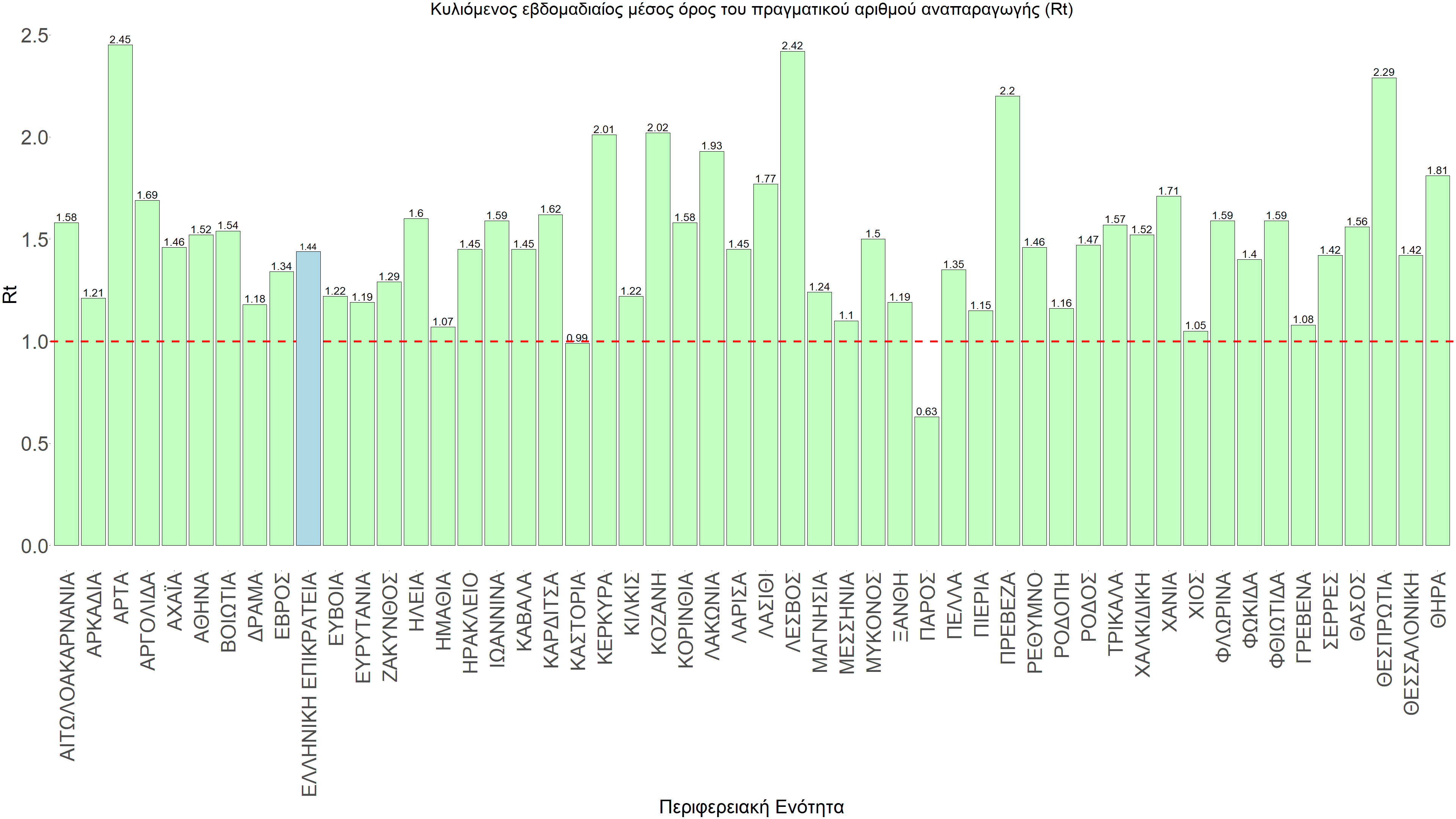 O πραγματικός αριθμός αναπαραγωγής Rt ανά περιφερειακή ενότητα της χώρας παρουσιάζεται στο Σχήμα 58.