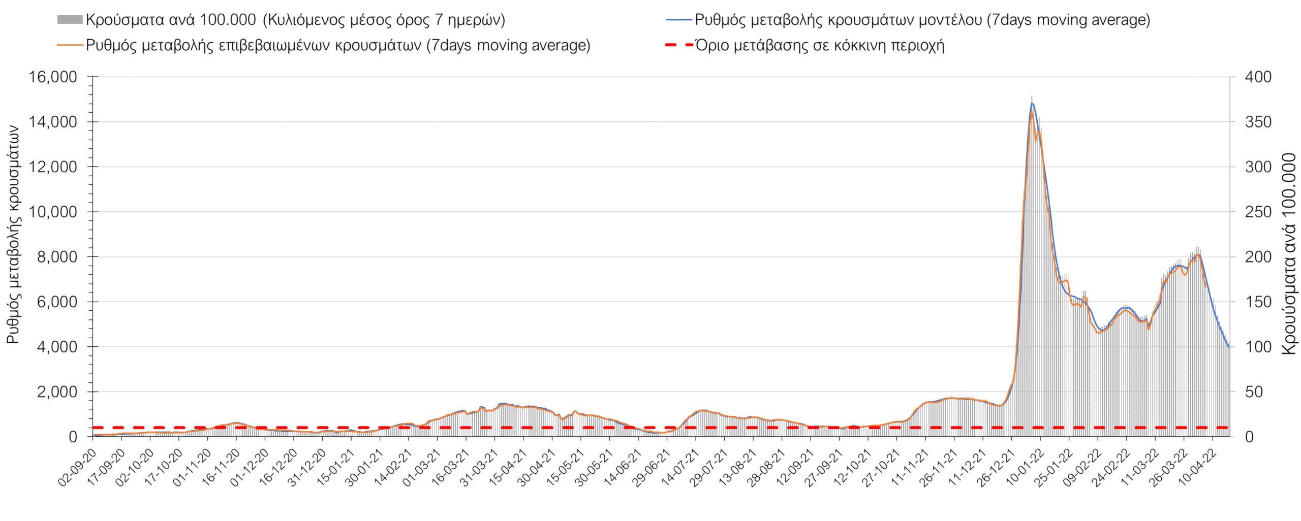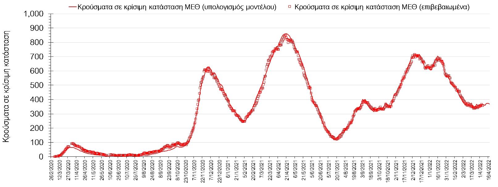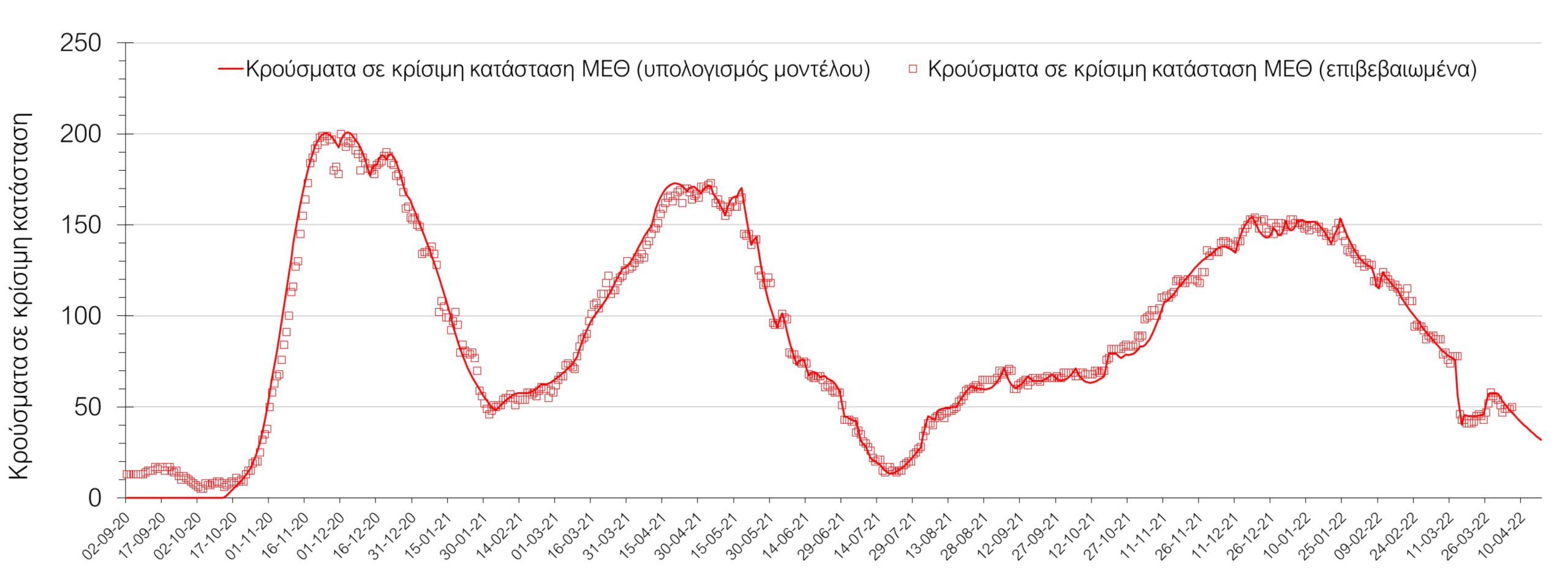 Η πορεία της μέσης εβδομαδιαίας τιμής των κρουσμάτων, καθώς και του κυλιόμενου μέσου όρου 7 ημερών του αριθμού των κρουσμάτων ανά 100.000 πληθυσμού, όπως έχουν καταγραφεί από τον ΕΟΔΥ και η αναμενόμενη πορεία τους, όπως προδιαγράφεται από την υπολογιστική πλατφόρμα CORE για την Ελληνική επικράτεια (όπως και στην Αττική και τη Θεσσαλονίκη) μέχρι τις 15 Απριλίου, αποτυπώνονται στο Σχήμα 4. Αυτή η προβλεπόμενη πορεία, που αφορά τα κρούσματα, τους νοσηλευόμενους σε απλές κλίνες, όσο και σε ΜΕΘ, καθώς επίσης και τους θανάτους, βασίζεται στις ακόλουθες παραδοχές: