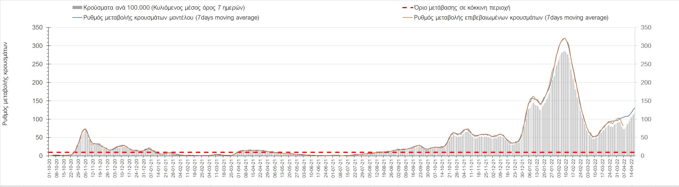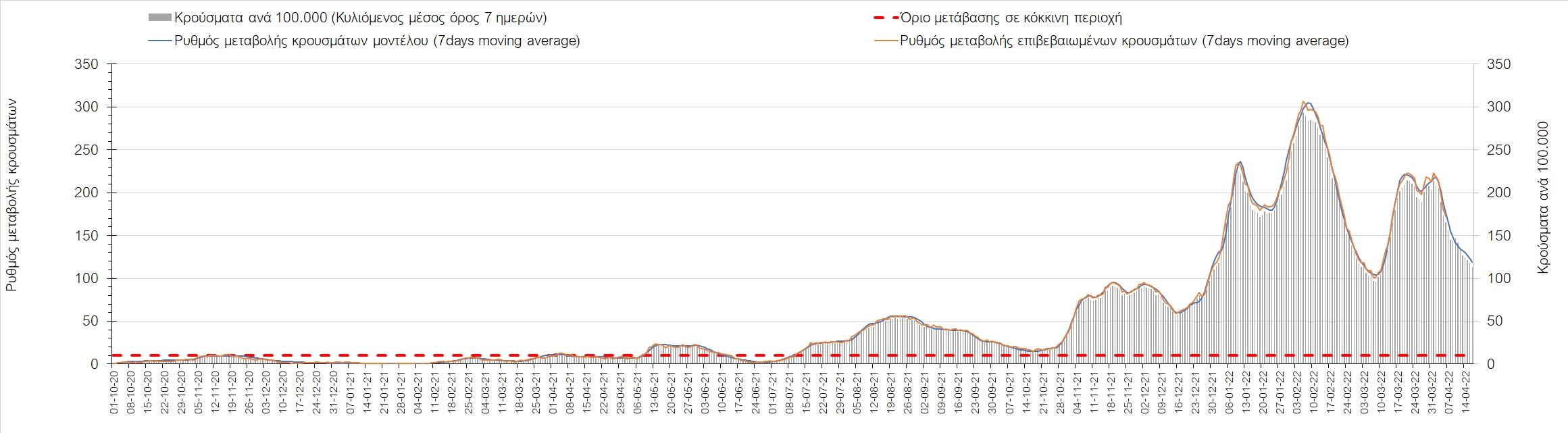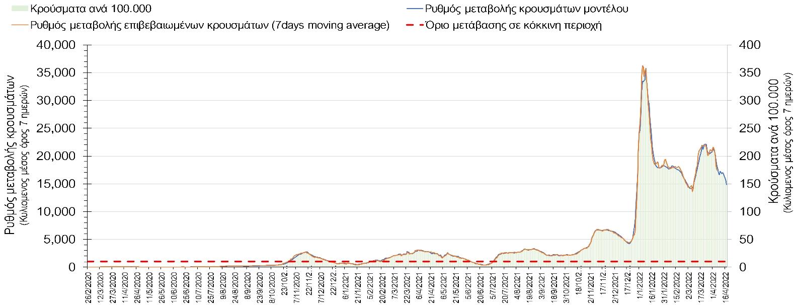 Η πορεία της μέσης εβδομαδιαίας τιμής των κρουσμάτων, καθώς και του κυλιόμενου μέσου όρου 7 ημερών του αριθμού των κρουσμάτων ανά 100.000 πληθυσμού, όπως έχουν καταγραφεί από τον ΕΟΔΥ και η αναμενόμενη πορεία τους, όπως προδιαγράφεται από την υπολογιστική πλατφόρμα CORE για την Ελληνική επικράτεια (όπως και στην Αττική και τη Θεσσαλονίκη) μέχρι τις 15 Απριλίου, αποτυπώνονται στο Σχήμα 4. Αυτή η προβλεπόμενη πορεία, που αφορά τα κρούσματα, τους νοσηλευόμενους σε απλές κλίνες, όσο και σε ΜΕΘ, καθώς επίσης και τους θανάτους, βασίζεται στις ακόλουθες παραδοχές:
