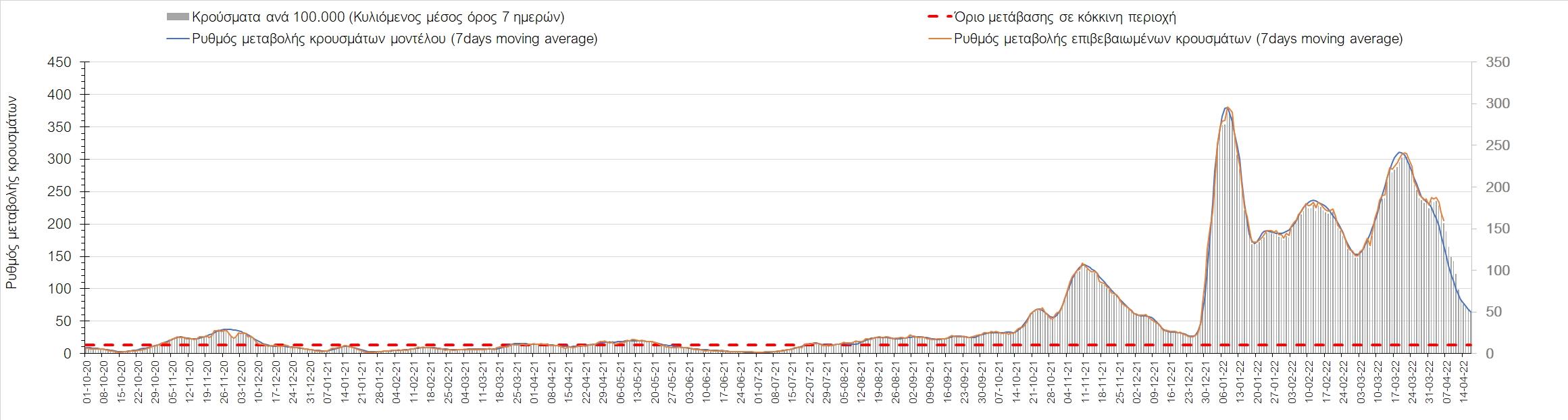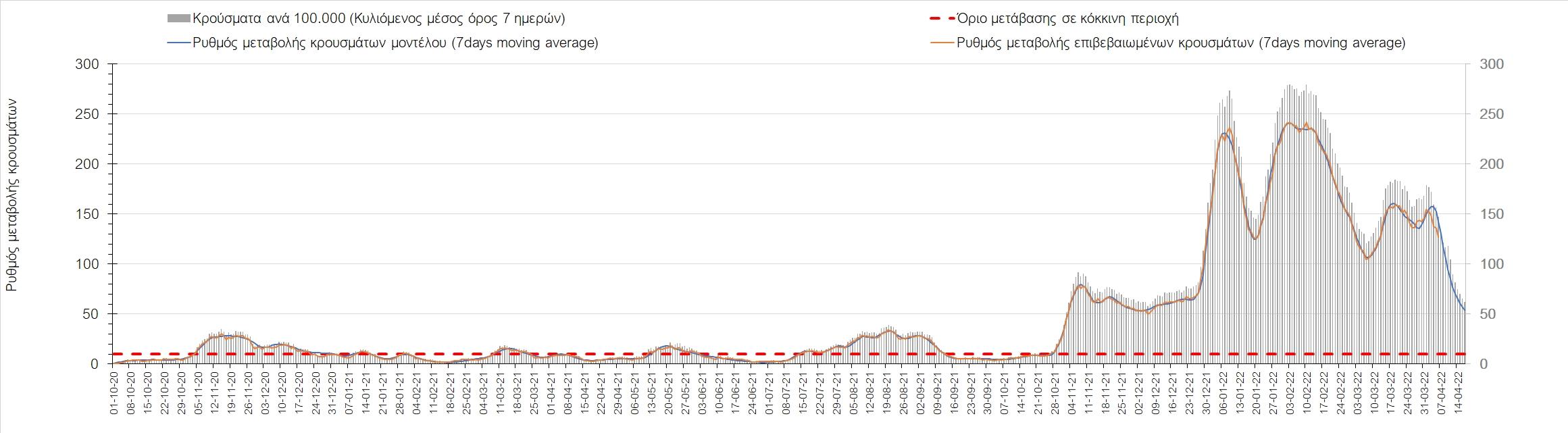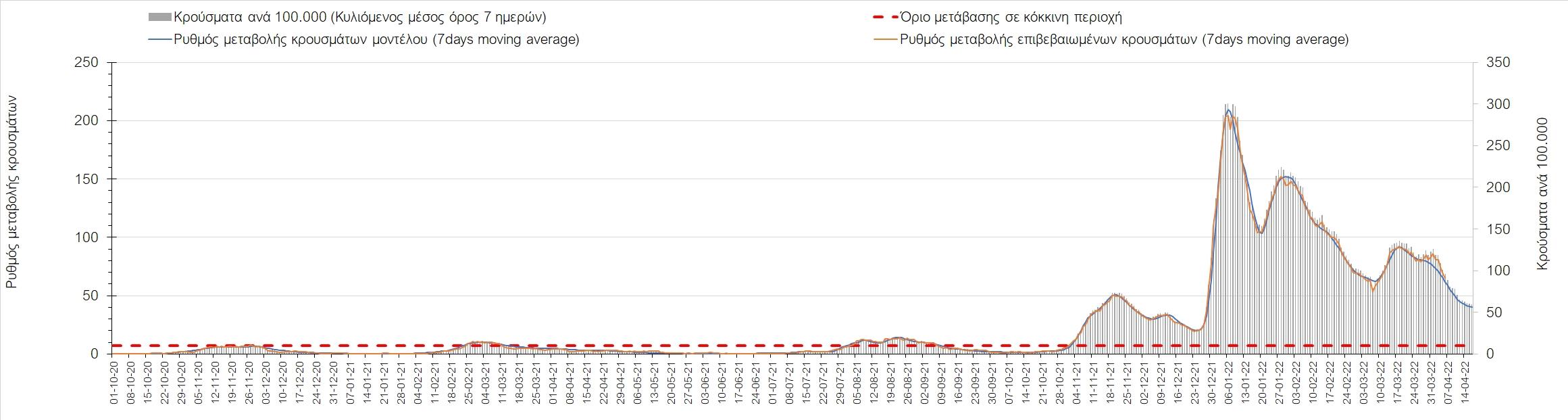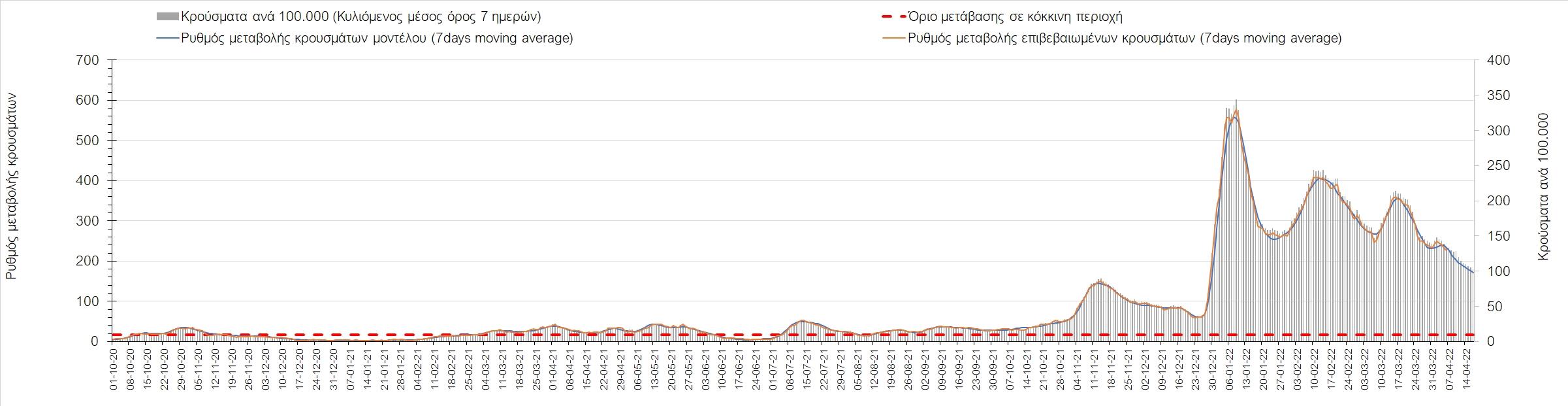 Η αποτύπωση των τάσεων στις επιμέρους περιοχές, παρουσιάζεται στο Σχήμα 61, όπου παρουσιάζεται ο ρυθμός μεταβολής των νέων κρουσμάτων ανά 100.000 κατοίκους (κυλιόμενος μέσος όρος 7 ημερών) των επιμέρους περιοχών. Θετικές τιμές του ρυθμού μεταβολής υποδηλώνουν άνοδο, ενώ αρνητικές τιμές υποδηλώνουν πτωτική πορεία.