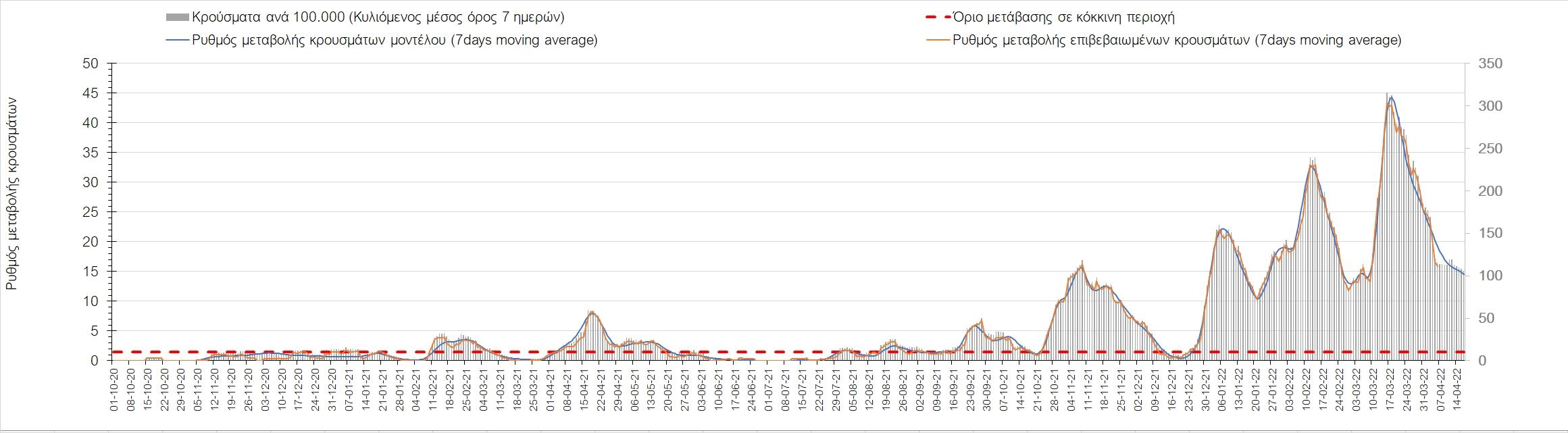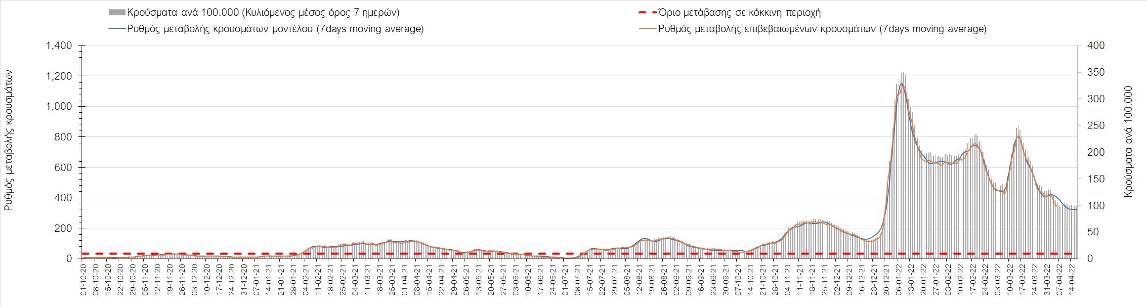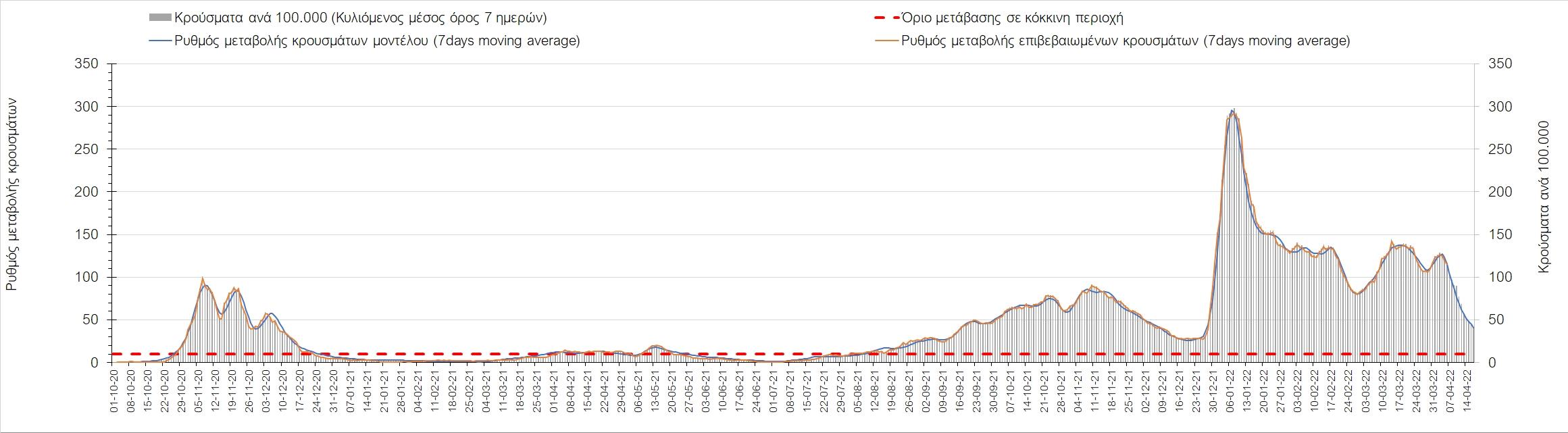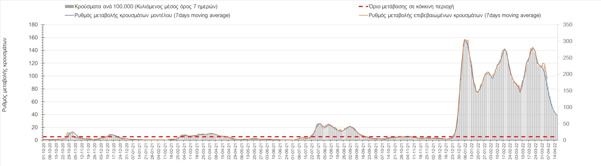 Η αποτύπωση των τάσεων στις επιμέρους περιοχές, παρουσιάζεται στο Σχήμα 61, όπου παρουσιάζεται ο ρυθμός μεταβολής των νέων κρουσμάτων ανά 100.000 κατοίκους (κυλιόμενος μέσος όρος 7 ημερών) των επιμέρους περιοχών. Θετικές τιμές του ρυθμού μεταβολής υποδηλώνουν άνοδο, ενώ αρνητικές τιμές υποδηλώνουν πτωτική πορεία.