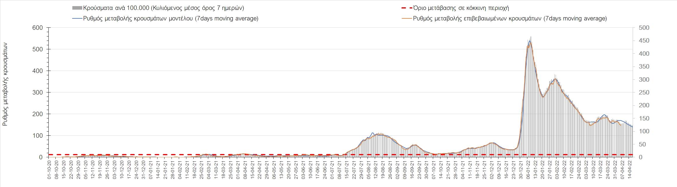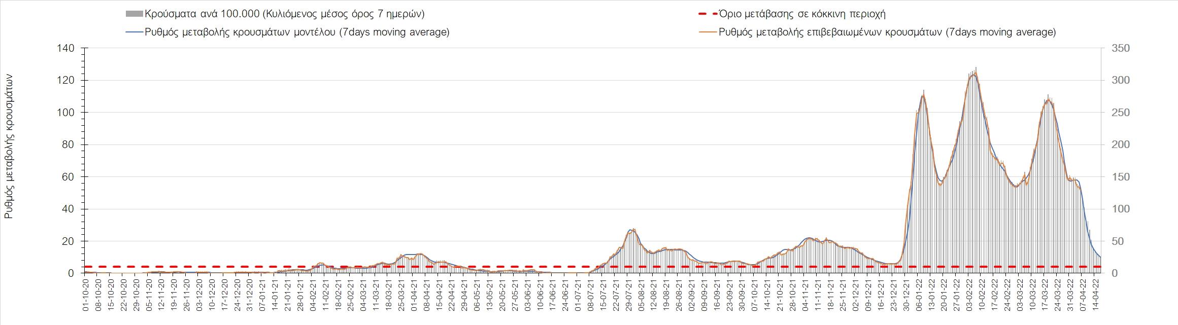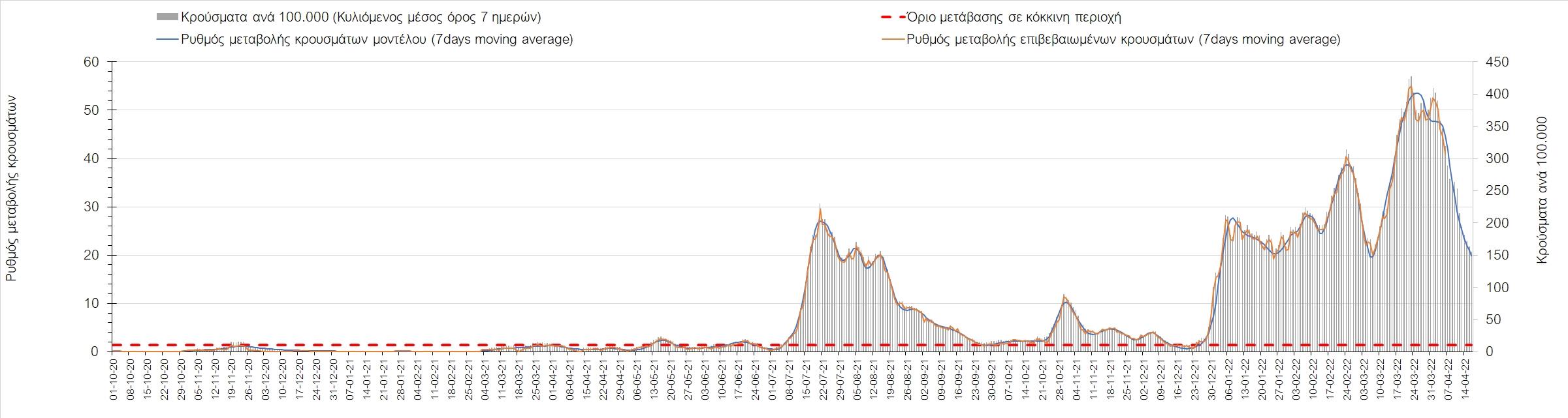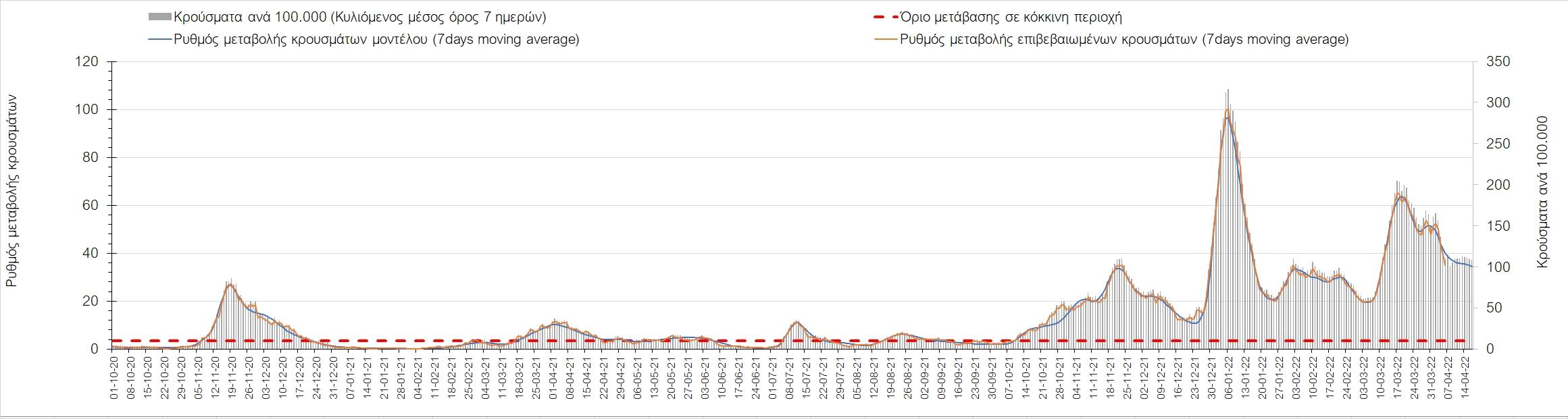 Η αποτύπωση των τάσεων στις επιμέρους περιοχές, παρουσιάζεται στο Σχήμα 61, όπου παρουσιάζεται ο ρυθμός μεταβολής των νέων κρουσμάτων ανά 100.000 κατοίκους (κυλιόμενος μέσος όρος 7 ημερών) των επιμέρους περιοχών. Θετικές τιμές του ρυθμού μεταβολής υποδηλώνουν άνοδο, ενώ αρνητικές τιμές υποδηλώνουν πτωτική πορεία.