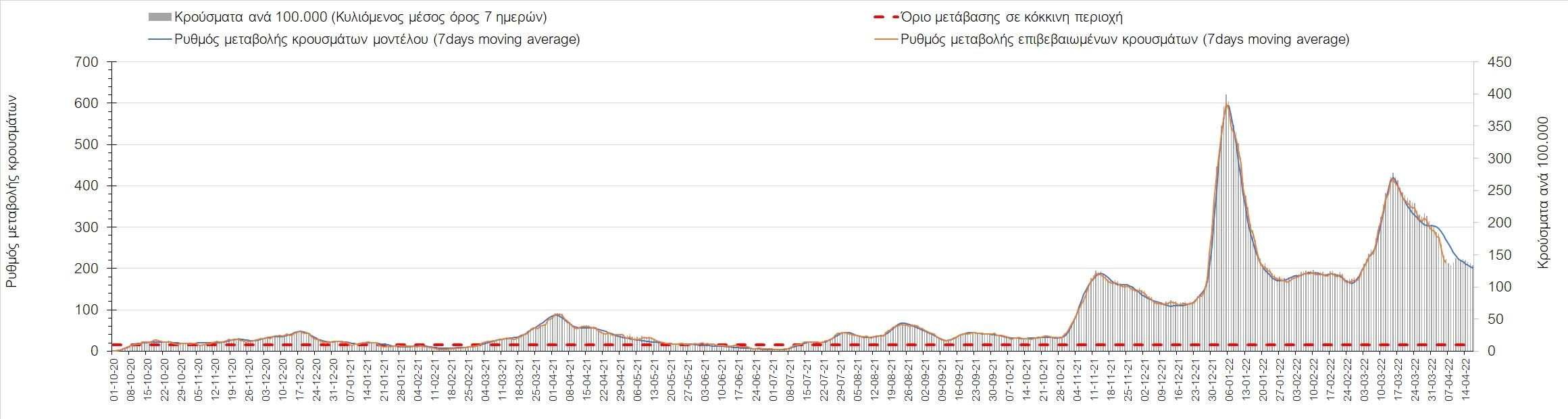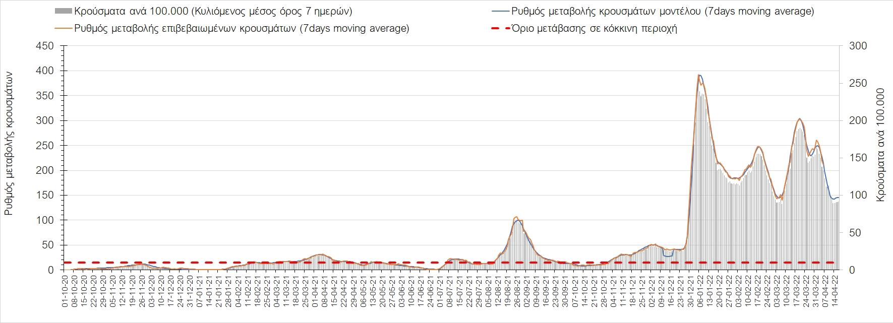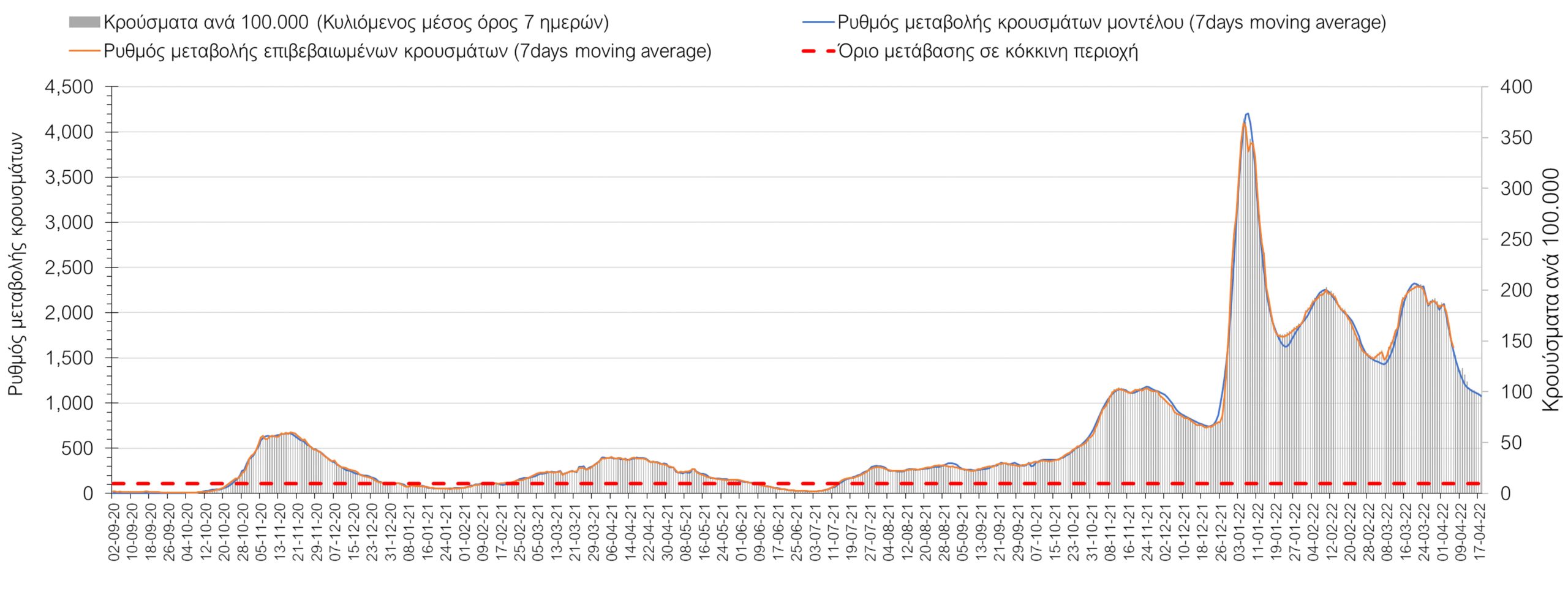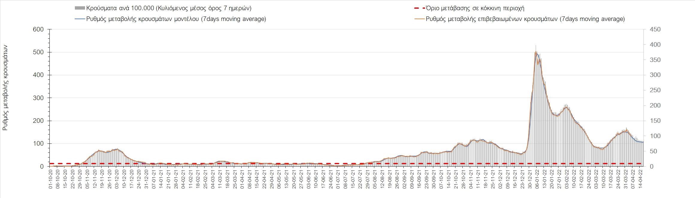 Η αποτύπωση των τάσεων στις επιμέρους περιοχές, παρουσιάζεται στο Σχήμα 61, όπου παρουσιάζεται ο ρυθμός μεταβολής των νέων κρουσμάτων ανά 100.000 κατοίκους (κυλιόμενος μέσος όρος 7 ημερών) των επιμέρους περιοχών. Θετικές τιμές του ρυθμού μεταβολής υποδηλώνουν άνοδο, ενώ αρνητικές τιμές υποδηλώνουν πτωτική πορεία.