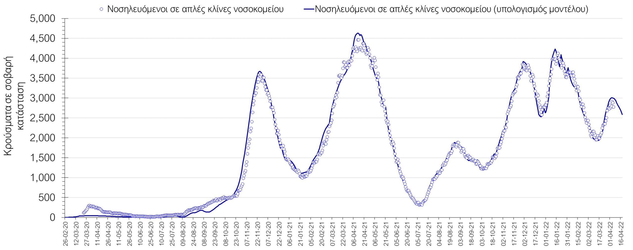 Σχήμα 2. Αριθμός κρουσμάτων σε σοβαρή κατάσταση (νοσηλευόμενοι σε απλές κλίνες) σύμφωνα με τα στοιχεία του ΕΟΔΥ και τις προβλέψεις της υπολογιστικής πλατφόρμας CORE.