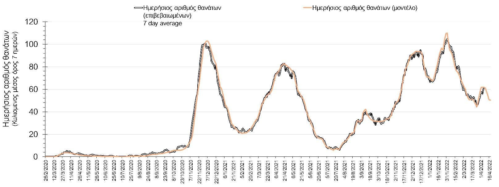 Ο αριθμός ημερήσιων θανάτων (73) που καταγράφηκε είναι ελαφρώς αυξημένος σε σχέση με την Τρίτη (70). Όπως είχαμε προβλέψει ο κυλιόμενος εβδομαδιαίος μέσος όρος που είναι 60,9 παραμένει υψηλός, και τόσο ο αριθμός, όσο και η τάση του, δε συνάδει με τον αριθμό των νοσηλειών σε κρίσιμη κατάσταση (διασωληνωμένοι σε ΜΕΘ).