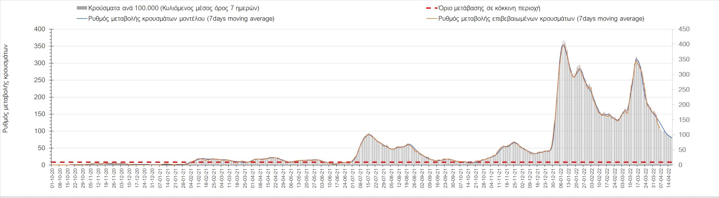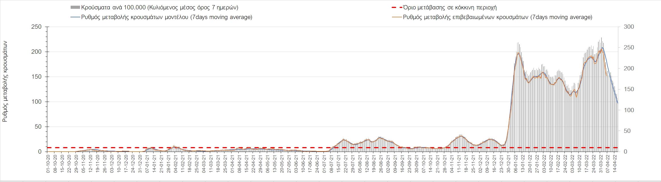 Η κάμψη της ανοδικής πορείας της προηγούμενης εβδομάδας, δείχνει να εξελίσσεται στην αναμενόμενη πτωτική πορεία και αντικατοπτρίζεται και στον ημερήσιο αριθμό των κρουσμάτων (κυλιόμενος μέσος όρος 7 ημερών), ο οποίος εμφανίζει μείωση σε σχέση με την Τρίτη και βρίσκεται κάτω από από τις 18.000 (17.472). Για να εδραιωθεί η συστηματική αποκλιμάκωση της πανδημίας, πέρα από την εφαρμογή των μέτρων (σε συνδυασμό με την σημαντική συνειδητοποίηση εκ μέρους του πληθυσμού ότι χρειάζεται προσοχή και σύνεση για την αντιμετώπιση της διασποράς της παραλλαγής Ο), θα πρέπει να στοχεύσουμε στη διατήρηση και την επέκταση της επίκτητης ανοσίας του πληθυσμού, αλλά και στον μεγάλο αριθμό των τεστ συνολικά (μοριακά, rapid και self-test) που πραγματοποιούνται καθημερινά. Για αυτό το λόγο και με δεδομένη τη μεγάλη διασπορά στα σχολεία θεωρούμε πρόωρη τη μείωση των self-test στα παιδιά σχολικής ηλικίας σε ένα μόνο την εβδομάδα από τα δύο που γίνονταν μέχρι τώρα.