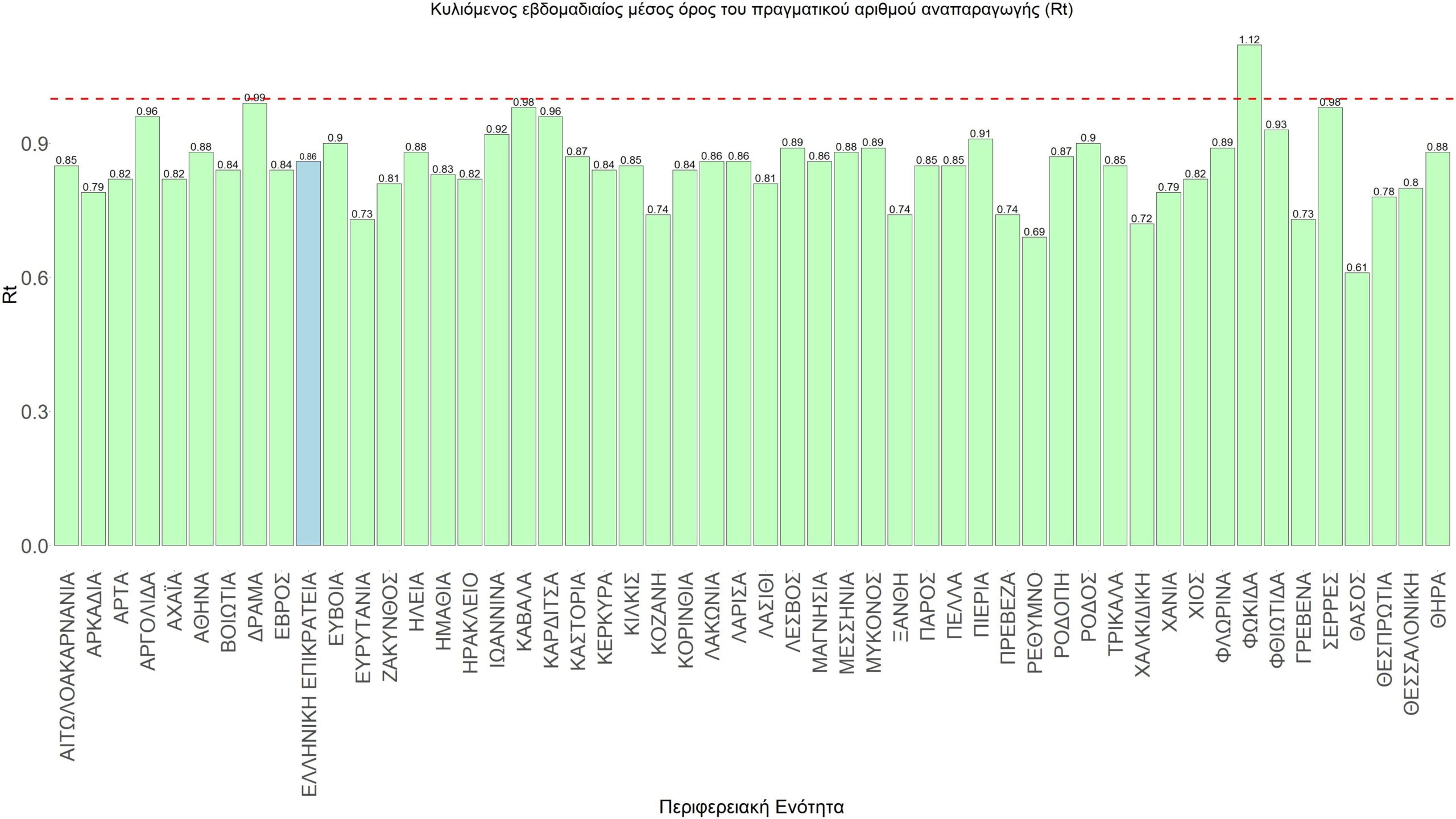 O πραγματικός αριθμός αναπαραγωγής Rt ανά περιφερειακή ενότητα της χώρας παρουσιάζεται στο Σχήμα 58.