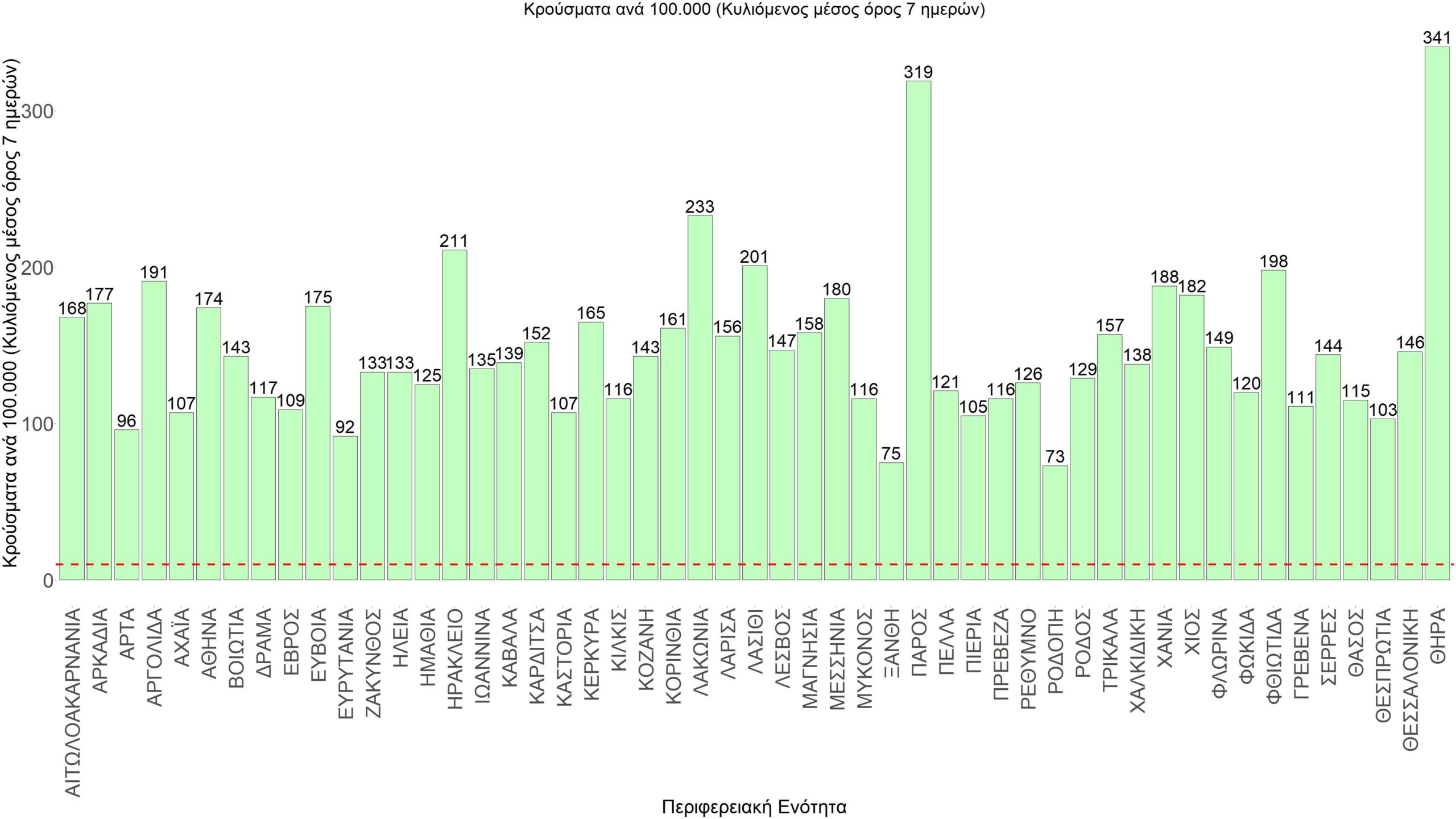 Σχήμα 60. Συγκεντρωτική εικόνα των νέων κρουσμάτων ανά 100.000 κατοίκους (κυλιόμενος μέσος όρος 7 ημερών) των επιμέρους περιοχών