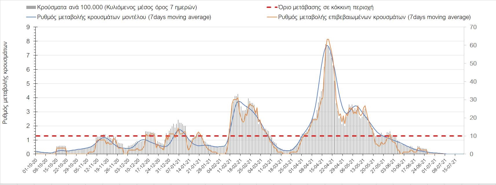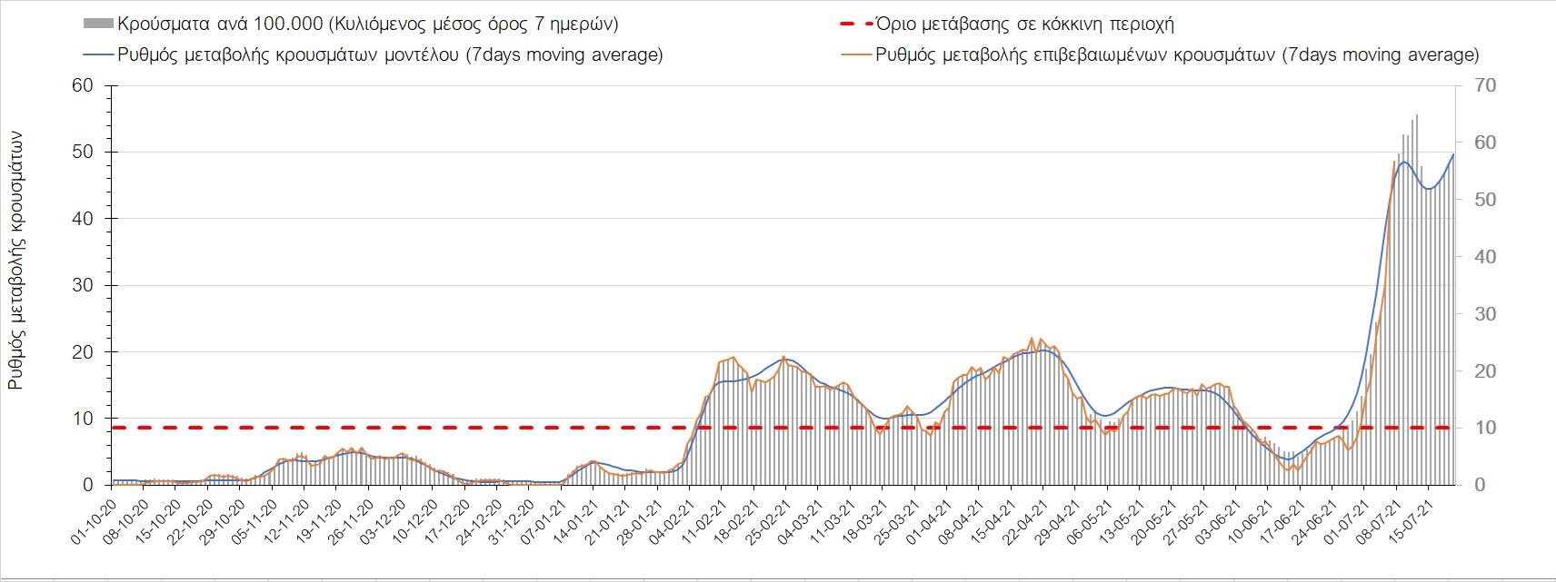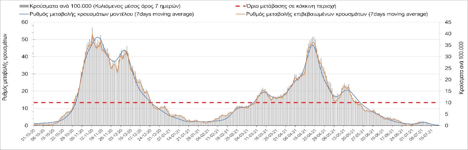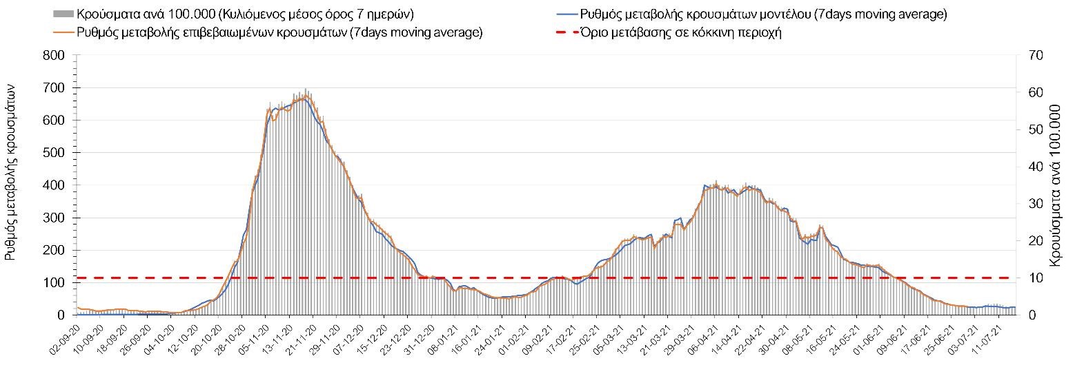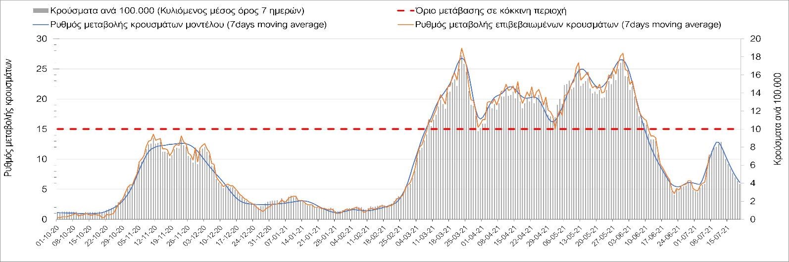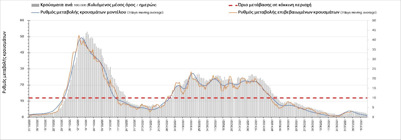 Σχήμα 53. Συγκριτικά αποτελέσματα της επιδημιολογικής εικόνας της σημερινής Τετάρτης (07/7/2021) σε σχέση με την προηγούμενη (30/6/2021) Όσον αφορά επιμέρους περιοχές, πλέον πέρα από το Ρέθυμνο, και άλλες περιοχές βρίσκονται πάνω από το όριο χαρακτηρισμού ως κόκκινες, όπως η Αθήνα, η Μαγνησία, η Ηλεία, τα Ιωάννινα, το Ηράκλειο, παρατηρούνται έντονα ανοδικές τάσεις στην Εύβοια, τη Βοιωτία, τη Φθιώτιδα, τη Λάρισα, την Καρδίτσα, την Αργολίδα, την Αρκαδία, τη Μεσσηνία, την Κορινθία, την Πρέβεζα, τα Γρεβενά, τη Χαλκιδική, τα Χανιά, το Λασίθι, τη Χίο και την Κέρκυρα. Ιδιαίτερα στην Αθήνα, προβληματίζει ο βαθμός που αυτή σχετίζεται με την εξάπλωση μεταλλαγμένων και ταχύτερα μεταδιδόμενων στελεχών (κυρίως το Β.1.1.318 και το Β.1.167). Συνεπώς, ακόμα και για περιοχές που για την ώρα είναι κάτω από το όριο (ή πολύ κοντά στο όριο), οι ανοδικές τάσεις που παρατηρούνται χρήζουν αυξημένης επιδημιολογικής επιτήρησης με εντατικοποίηση του γονιδιωματικού ελέγχου.Επίσης, σύμφωνα με τα πιο πρόσφατα στοιχεία που έγιναν διαθέσιμα, ανησυχία πλέον δημιουργεί η αύξηση του ποσοστού διασποράς του μεταλλαγμένου στελέχους Β.1.1.318 σε συγκεκριμένες περιοχές για το 15νθήμερο από 7/06/2021 έως 20/06/2021, όπου οι αντίστοιχες ποσοστώσεις είναι 33.9% για την Αττική, 12.5% για τη Δυτική Ελλάδα, 16.7% για τις Ιόνιες Νήσους και 11.11% για την Πελοπόννησο, αλλά και η εμφάνιση πλέον στη χώρα της μετάλλαξης Β.1.617 (μετάλλαξη Δέλτα). Με δεδομένα τα υπάρχοντα ανοίγματα, την παρουσία των μεταλλάξεων και την έλευση των τουριστικών ροών είναι ακόμα πιο σημαντική η τήρηση των μέτρων, με κυριότερη την ορθή και μαζική εφαρμογή των self-test, με ταυτόχρονη αύξηση της ιχνηλασίας των επαφών των ανιχνευθέντων ως θετικοί και καραντίνα 14 ημερών για τους συμπολίτες μας που θα επιβεβαιωθεί ότι είναι θετικοί στην μόλυνση με SARS-CoV-2 ακόμη και αν είναι ασυμπτωματικοί. Η σημασία και η αποτελεσματικότητα των self-test και του εμβολιασμού έχει ήδη φανεί τις προηγούμενες 8 εβδομάδες. Με δεδομένη την εμφάνιση της μετάλλαξης Β.1.617 ο πλήρης εμβολιασμός (με δύο δόσεις) του συνολικού πληθυσμού είναι σε συνδυασμό με τη μαζική και συχνή χρήση self-test οι δύο πιο αποτελεσματικές γραμμές άμυνας που έχουμε για να αντιμετωπίσουμε ΑΜΕΣΑ αυτό το πολύ πιο μεταδοτικό στέλεχος του SARS-CoV-2. Με δεδομένη την έντονη αύξηση του αριθμού των κρουσμάτων (η οποία είναι ταχύτερη του αναμενόμενου) και το γεγονός ότι είμαστε στην αρχή της τουριστικής περιόδου ακόμα, πρέπει ΑΜΕΣΑ να αυξηθεί ο αριθμός των self-test και να γίνουν όλες οι απαραίτητες ενέργειες που θα εξασφαλίσουν υψηλό αριθμό εμβολιασμένων. Σχετικά με το άνοιγμα των συνόρων σε τουριστικές ροές, αυτό θα πρέπει να συνοδευτεί με τα παρακάτω μέτρα:α) εργαστηριακός έλεγχος των ταξιδιωτών τουλάχιστον 48 ώρες πριν την αναχώρηση με δυνατότητα επανάληψης του ελέγχου 7 ημέρες από την άφιξή τους στη χώραβ) πιστοποιητικό ανάρρωσης από την Covid-19 με ημερομηνία μέχρι 6 μήνες πριν την άφιξή τους στη χώρα. γ) δυνατότητα αυξημένου αριθμού rapid test στα τουριστικά θέρετρα της χώρας και όχι μόνο στις πύλες εισόδου.Αν θέλουμε να συνδυάσουμε τη χρηστή διαχείριση του υγειονομικού κινδύνου από την COVID-19 με την εύρυθμη λειτουργία της οικονομίας και της κοινωνίας, είναι κρίσιμο να προετοιμάζουμε κατάλληλα τους χώρους εργασίας, εκπαίδευσης, τα μέσα μαζικής μεταφοράς σε επίπεδα υποδομής ώστε να μπορούν να λειτουργήσουν με αυξημένη ασφάλεια και να μην σ