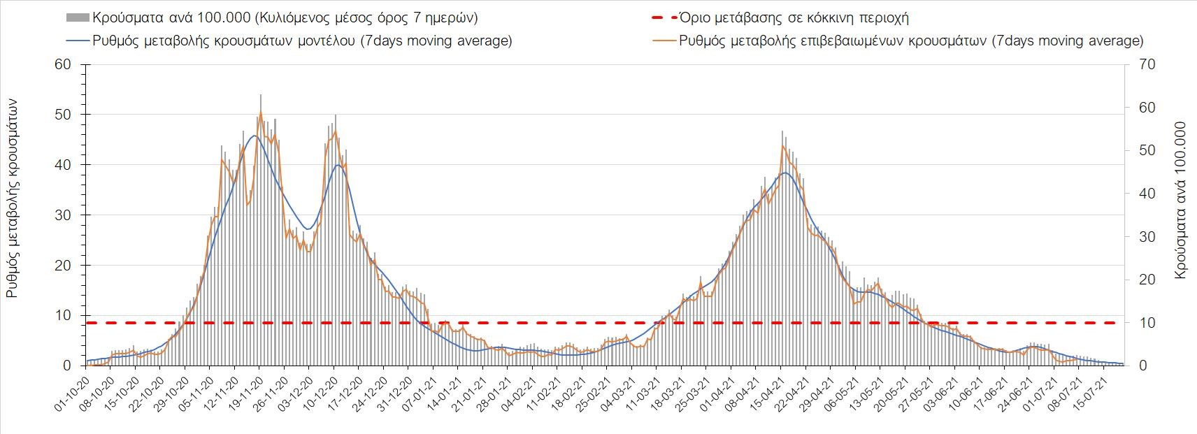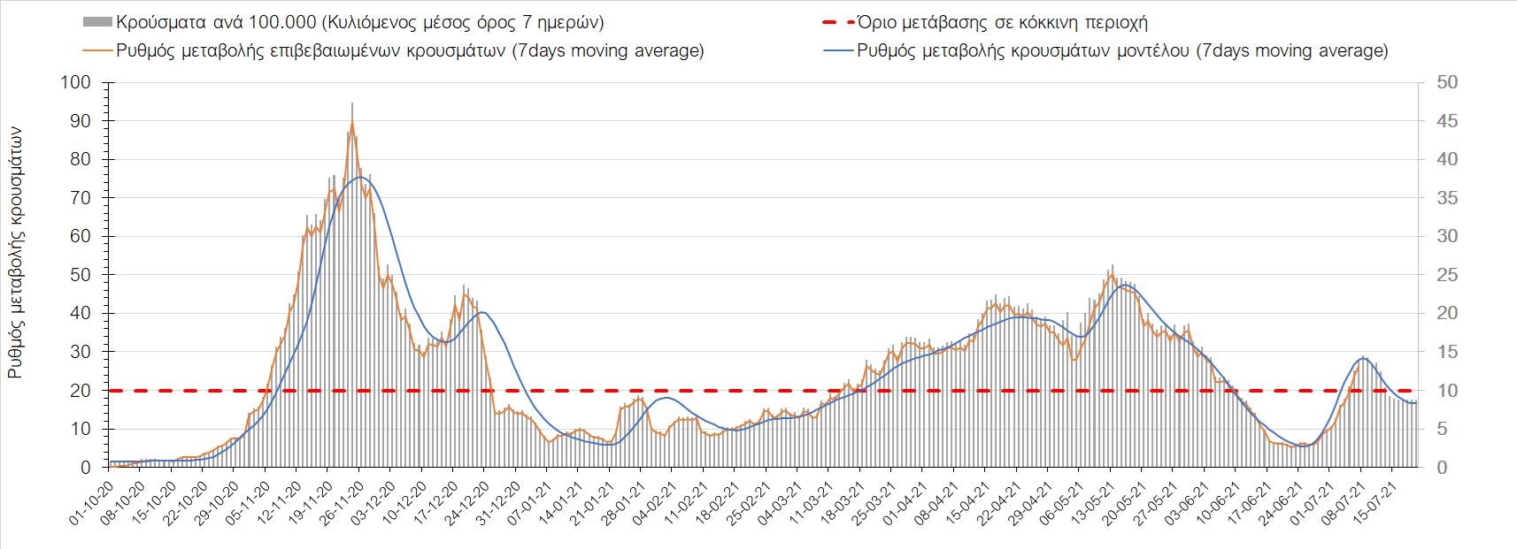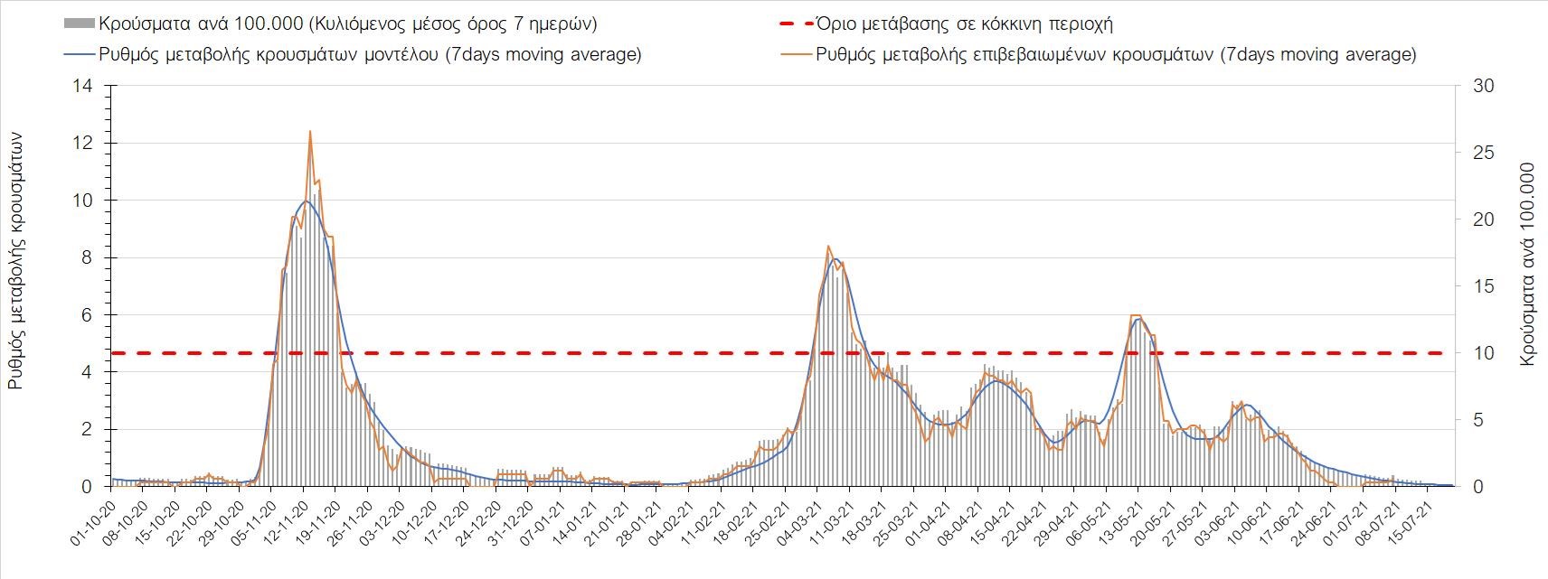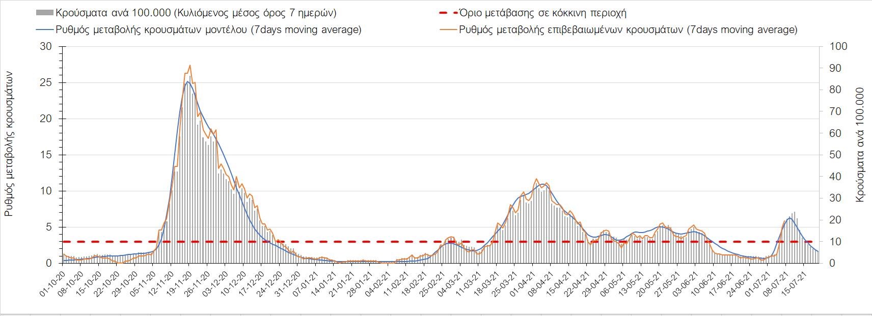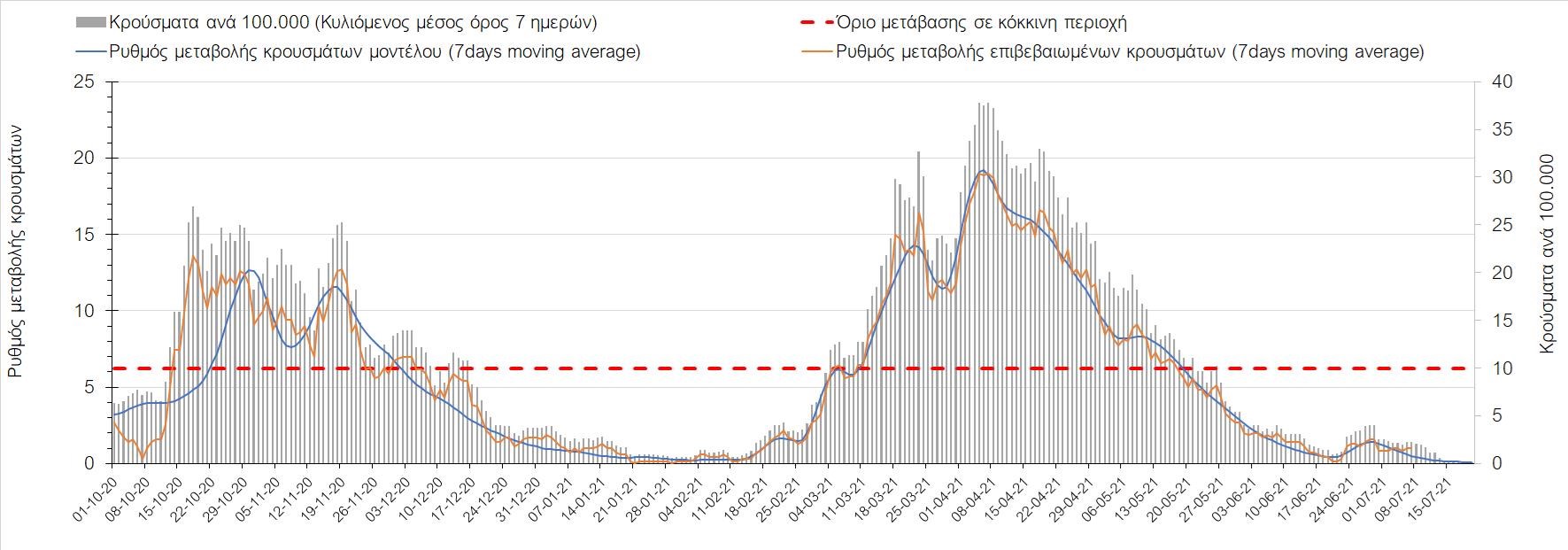 Σχήμα 53. Συγκριτικά αποτελέσματα της επιδημιολογικής εικόνας της σημερινής Τετάρτης (07/7/2021) σε σχέση με την προηγούμενη (30/6/2021) Όσον αφορά επιμέρους περιοχές, πλέον πέρα από το Ρέθυμνο, και άλλες περιοχές βρίσκονται πάνω από το όριο χαρακτηρισμού ως κόκκινες, όπως η Αθήνα, η Μαγνησία, η Ηλεία, τα Ιωάννινα, το Ηράκλειο, παρατηρούνται έντονα ανοδικές τάσεις στην Εύβοια, τη Βοιωτία, τη Φθιώτιδα, τη Λάρισα, την Καρδίτσα, την Αργολίδα, την Αρκαδία, τη Μεσσηνία, την Κορινθία, την Πρέβεζα, τα Γρεβενά, τη Χαλκιδική, τα Χανιά, το Λασίθι, τη Χίο και την Κέρκυρα. Ιδιαίτερα στην Αθήνα, προβληματίζει ο βαθμός που αυτή σχετίζεται με την εξάπλωση μεταλλαγμένων και ταχύτερα μεταδιδόμενων στελεχών (κυρίως το Β.1.1.318 και το Β.1.167). Συνεπώς, ακόμα και για περιοχές που για την ώρα είναι κάτω από το όριο (ή πολύ κοντά στο όριο), οι ανοδικές τάσεις που παρατηρούνται χρήζουν αυξημένης επιδημιολογικής επιτήρησης με εντατικοποίηση του γονιδιωματικού ελέγχου.Επίσης, σύμφωνα με τα πιο πρόσφατα στοιχεία που έγιναν διαθέσιμα, ανησυχία πλέον δημιουργεί η αύξηση του ποσοστού διασποράς του μεταλλαγμένου στελέχους Β.1.1.318 σε συγκεκριμένες περιοχές για το 15νθήμερο από 7/06/2021 έως 20/06/2021, όπου οι αντίστοιχες ποσοστώσεις είναι 33.9% για την Αττική, 12.5% για τη Δυτική Ελλάδα, 16.7% για τις Ιόνιες Νήσους και 11.11% για την Πελοπόννησο, αλλά και η εμφάνιση πλέον στη χώρα της μετάλλαξης Β.1.617 (μετάλλαξη Δέλτα). Με δεδομένα τα υπάρχοντα ανοίγματα, την παρουσία των μεταλλάξεων και την έλευση των τουριστικών ροών είναι ακόμα πιο σημαντική η τήρηση των μέτρων, με κυριότερη την ορθή και μαζική εφαρμογή των self-test, με ταυτόχρονη αύξηση της ιχνηλασίας των επαφών των ανιχνευθέντων ως θετικοί και καραντίνα 14 ημερών για τους συμπολίτες μας που θα επιβεβαιωθεί ότι είναι θετικοί στην μόλυνση με SARS-CoV-2 ακόμη και αν είναι ασυμπτωματικοί. Η σημασία και η αποτελεσματικότητα των self-test και του εμβολιασμού έχει ήδη φανεί τις προηγούμενες 8 εβδομάδες. Με δεδομένη την εμφάνιση της μετάλλαξης Β.1.617 ο πλήρης εμβολιασμός (με δύο δόσεις) του συνολικού πληθυσμού είναι σε συνδυασμό με τη μαζική και συχνή χρήση self-test οι δύο πιο αποτελεσματικές γραμμές άμυνας που έχουμε για να αντιμετωπίσουμε ΑΜΕΣΑ αυτό το πολύ πιο μεταδοτικό στέλεχος του SARS-CoV-2. Με δεδομένη την έντονη αύξηση του αριθμού των κρουσμάτων (η οποία είναι ταχύτερη του αναμενόμενου) και το γεγονός ότι είμαστε στην αρχή της τουριστικής περιόδου ακόμα, πρέπει ΑΜΕΣΑ να αυξηθεί ο αριθμός των self-test και να γίνουν όλες οι απαραίτητες ενέργειες που θα εξασφαλίσουν υψηλό αριθμό εμβολιασμένων. Σχετικά με το άνοιγμα των συνόρων σε τουριστικές ροές, αυτό θα πρέπει να συνοδευτεί με τα παρακάτω μέτρα:α) εργαστηριακός έλεγχος των ταξιδιωτών τουλάχιστον 48 ώρες πριν την αναχώρηση με δυνατότητα επανάληψης του ελέγχου 7 ημέρες από την άφιξή τους στη χώραβ) πιστοποιητικό ανάρρωσης από την Covid-19 με ημερομηνία μέχρι 6 μήνες πριν την άφιξή τους στη χώρα. γ) δυνατότητα αυξημένου αριθμού rapid test στα τουριστικά θέρετρα της χώρας και όχι μόνο στις πύλες εισόδου.Αν θέλουμε να συνδυάσουμε τη χρηστή διαχείριση του υγειονομικού κινδύνου από την COVID-19 με την εύρυθμη λειτουργία της οικονομίας και της κοινωνίας, είναι κρίσιμο να προετοιμάζουμε κατάλληλα τους χώρους εργασίας, εκπαίδευσης, τα μέσα μαζικής μεταφοράς σε επίπεδα υποδομής ώστε να μπορούν να λειτουργήσουν με αυξημένη ασφάλεια και να μην σ