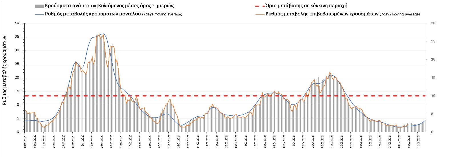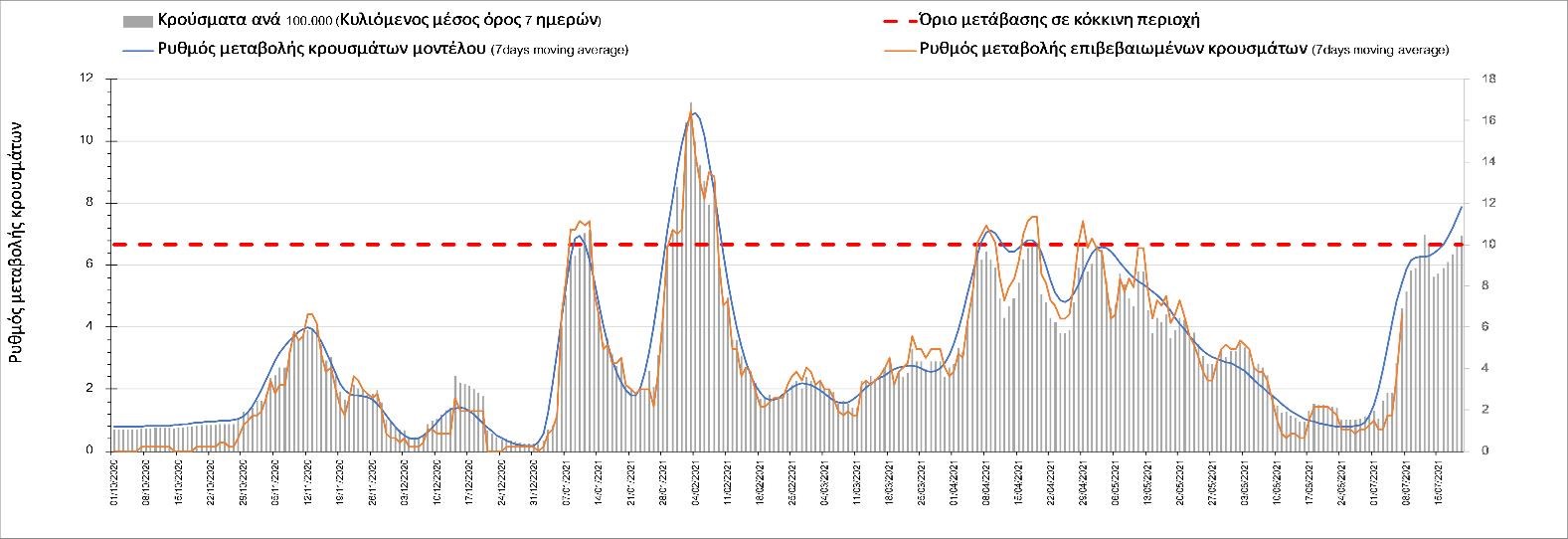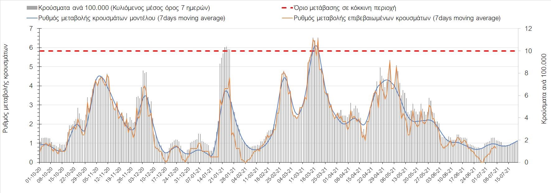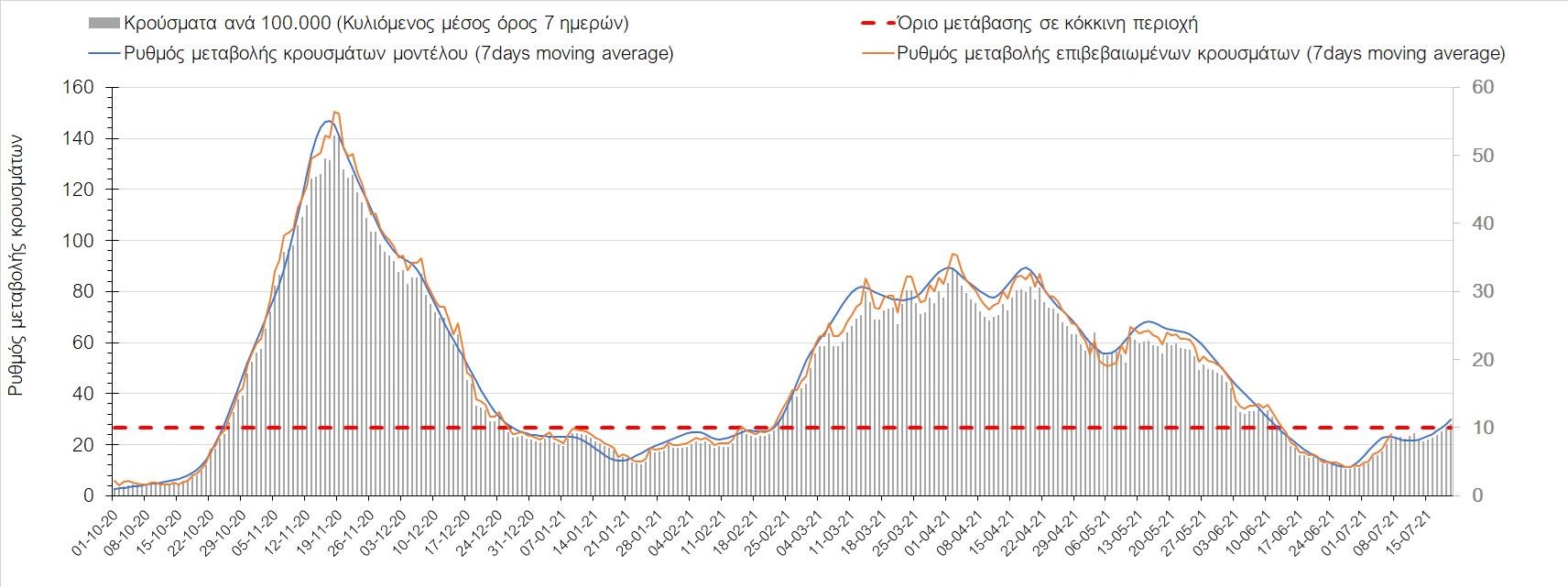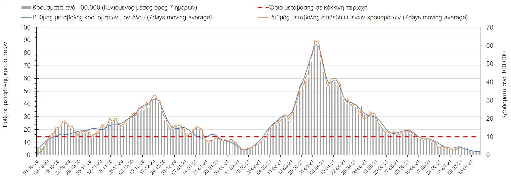 Σχήμα 53. Συγκριτικά αποτελέσματα της επιδημιολογικής εικόνας της σημερινής Τετάρτης (07/7/2021) σε σχέση με την προηγούμενη (30/6/2021) Όσον αφορά επιμέρους περιοχές, πλέον πέρα από το Ρέθυμνο, και άλλες περιοχές βρίσκονται πάνω από το όριο χαρακτηρισμού ως κόκκινες, όπως η Αθήνα, η Μαγνησία, η Ηλεία, τα Ιωάννινα, το Ηράκλειο, παρατηρούνται έντονα ανοδικές τάσεις στην Εύβοια, τη Βοιωτία, τη Φθιώτιδα, τη Λάρισα, την Καρδίτσα, την Αργολίδα, την Αρκαδία, τη Μεσσηνία, την Κορινθία, την Πρέβεζα, τα Γρεβενά, τη Χαλκιδική, τα Χανιά, το Λασίθι, τη Χίο και την Κέρκυρα. Ιδιαίτερα στην Αθήνα, προβληματίζει ο βαθμός που αυτή σχετίζεται με την εξάπλωση μεταλλαγμένων και ταχύτερα μεταδιδόμενων στελεχών (κυρίως το Β.1.1.318 και το Β.1.167). Συνεπώς, ακόμα και για περιοχές που για την ώρα είναι κάτω από το όριο (ή πολύ κοντά στο όριο), οι ανοδικές τάσεις που παρατηρούνται χρήζουν αυξημένης επιδημιολογικής επιτήρησης με εντατικοποίηση του γονιδιωματικού ελέγχου.Επίσης, σύμφωνα με τα πιο πρόσφατα στοιχεία που έγιναν διαθέσιμα, ανησυχία πλέον δημιουργεί η αύξηση του ποσοστού διασποράς του μεταλλαγμένου στελέχους Β.1.1.318 σε συγκεκριμένες περιοχές για το 15νθήμερο από 7/06/2021 έως 20/06/2021, όπου οι αντίστοιχες ποσοστώσεις είναι 33.9% για την Αττική, 12.5% για τη Δυτική Ελλάδα, 16.7% για τις Ιόνιες Νήσους και 11.11% για την Πελοπόννησο, αλλά και η εμφάνιση πλέον στη χώρα της μετάλλαξης Β.1.617 (μετάλλαξη Δέλτα). Με δεδομένα τα υπάρχοντα ανοίγματα, την παρουσία των μεταλλάξεων και την έλευση των τουριστικών ροών είναι ακόμα πιο σημαντική η τήρηση των μέτρων, με κυριότερη την ορθή και μαζική εφαρμογή των self-test, με ταυτόχρονη αύξηση της ιχνηλασίας των επαφών των ανιχνευθέντων ως θετικοί και καραντίνα 14 ημερών για τους συμπολίτες μας που θα επιβεβαιωθεί ότι είναι θετικοί στην μόλυνση με SARS-CoV-2 ακόμη και αν είναι ασυμπτωματικοί. Η σημασία και η αποτελεσματικότητα των self-test και του εμβολιασμού έχει ήδη φανεί τις προηγούμενες 8 εβδομάδες. Με δεδομένη την εμφάνιση της μετάλλαξης Β.1.617 ο πλήρης εμβολιασμός (με δύο δόσεις) του συνολικού πληθυσμού είναι σε συνδυασμό με τη μαζική και συχνή χρήση self-test οι δύο πιο αποτελεσματικές γραμμές άμυνας που έχουμε για να αντιμετωπίσουμε ΑΜΕΣΑ αυτό το πολύ πιο μεταδοτικό στέλεχος του SARS-CoV-2. Με δεδομένη την έντονη αύξηση του αριθμού των κρουσμάτων (η οποία είναι ταχύτερη του αναμενόμενου) και το γεγονός ότι είμαστε στην αρχή της τουριστικής περιόδου ακόμα, πρέπει ΑΜΕΣΑ να αυξηθεί ο αριθμός των self-test και να γίνουν όλες οι απαραίτητες ενέργειες που θα εξασφαλίσουν υψηλό αριθμό εμβολιασμένων. Σχετικά με το άνοιγμα των συνόρων σε τουριστικές ροές, αυτό θα πρέπει να συνοδευτεί με τα παρακάτω μέτρα:α) εργαστηριακός έλεγχος των ταξιδιωτών τουλάχιστον 48 ώρες πριν την αναχώρηση με δυνατότητα επανάληψης του ελέγχου 7 ημέρες από την άφιξή τους στη χώραβ) πιστοποιητικό ανάρρωσης από την Covid-19 με ημερομηνία μέχρι 6 μήνες πριν την άφιξή τους στη χώρα. γ) δυνατότητα αυξημένου αριθμού rapid test στα τουριστικά θέρετρα της χώρας και όχι μόνο στις πύλες εισόδου.Αν θέλουμε να συνδυάσουμε τη χρηστή διαχείριση του υγειονομικού κινδύνου από την COVID-19 με την εύρυθμη λειτουργία της οικονομίας και της κοινωνίας, είναι κρίσιμο να προετοιμάζουμε κατάλληλα τους χώρους εργασίας, εκπαίδευσης, τα μέσα μαζικής μεταφοράς σε επίπεδα υποδομής ώστε να μπορούν να λειτουργήσουν με αυξημένη ασφάλεια και να μην σ