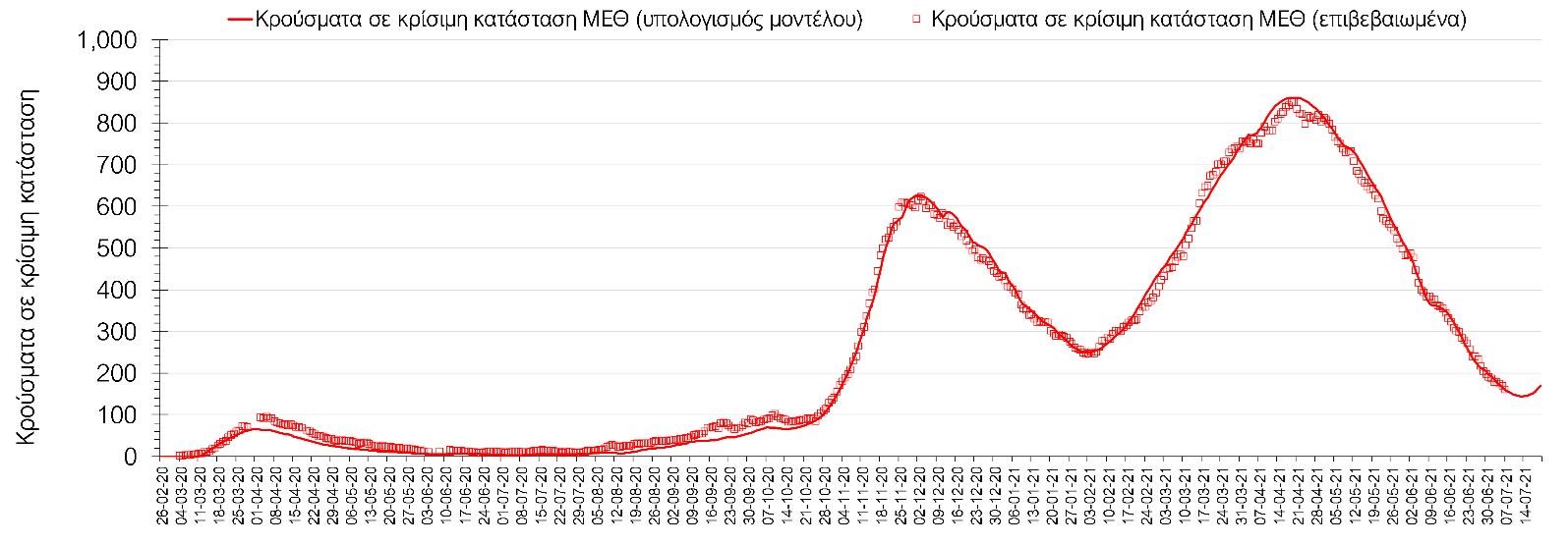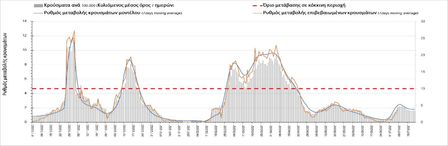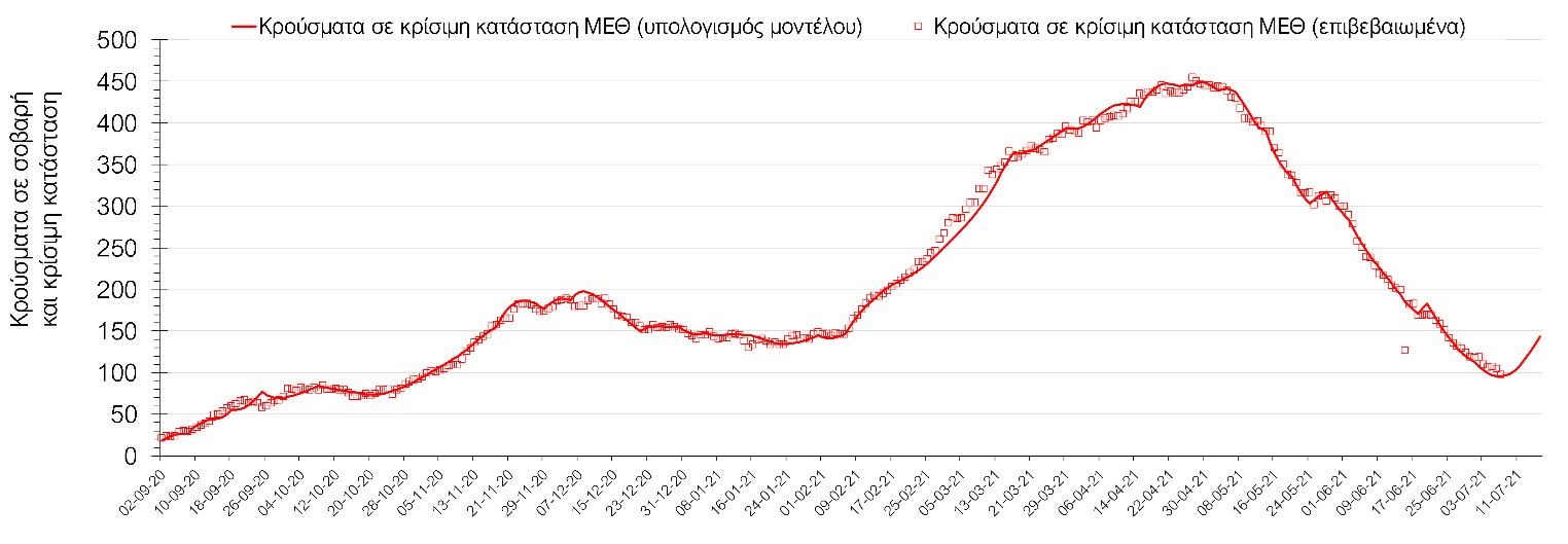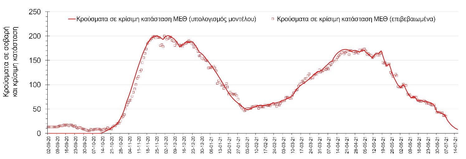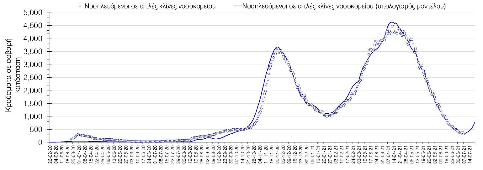 Σύμφωνα με τα στοιχεία του ΕΟΔΥ, ο αριθμός κρουσμάτων την Τετάρτη ανήλθε στα 1820 νέα κρούσματα, με τα αποτελέσματα να συνάδουν με τις αναθεωρημένες προβλέψεις της υπολογιστικής πλατφόρμας CORE (n=1844) που λαμβάνουν υπόψη την διασπορά όλων των μεταλλαγμένων στελεχών του SARS-CoV-2. Ο αριθμός των τεστ που πραγματοποιήθηκαν ήταν 59903 και σε συνδυασμό με τον αριθμό των κρουσμάτων, ο δείκτης θετικότητας διαμορφώθηκε στο 2.7%. Η πραγματοποίηση αριθμού τεστ σε επίπεδα άνω των 50.000 την ημέρα, συντελεί στο να εξάγουμε πιο ασφαλή συμπεράσματα σχετικά με την πορεία της πανδημίας, αλλά και να εντοπίζονται περισσότεροι ασυμπτωματικοί και προσυμπτωματικοί, συντελώντας στην ανάσχεση πιθανής έξαρσης που θα μπορούσε να συμβεί λόγω της εμφάνισης ολοένα και ταχύτερα μεταδιδόμενων στελεχών, σε συνδυασμό με τα υπάρχοντα ανοίγματα και τις τουριστικές ροές. Σημαντικοί σύμμαχοι σε αυτή την προσπάθεια αύξησης του αριθμού των τεστ ανίχνευσης του SARS-CoV-2 αποτελούν εκτός από τα rapid test και τα self test, για να καταπολεμηθεί η δυναμική αύξησης της διασποράς στις περιοχές όπου μια τέτοια αύξηση διαφαίνεται από τα μέχρι τώρα δεδομένα και την υπολογιστική πλατφόρμα CORE, αλλά και για να συνεχιστεί η πολύ καλή πορεία στο σύνολο της χώρας.Ο αριθμός ημερήσιων θανάτων (9) που καταγράφηκε είναι ελαφρώς αυξημένος σε σχέση με την Τρίτη (8). Όπως είχαμε προβλέψει από την προηγούμενη εβδομάδα, ο κυλιόμενος εβδομαδιαίος μέσος όρος που σήμερα είναι 7 συνεχίζει να είναι σε αποκλιμάκωση, αλλά σε πιο αργό ρυθμό από τον αναμενόμενο. Όσον αφορά στους ασθενείς σε κρίσιμη κατάσταση (διασωληνωμένοι σε ΜΕΘ), ο αριθμός μειώθηκε ελαφρά σε σχέση με την Τρίτη (159 από 168). Παρά την παρατηρούμενη ανοδική πορεία των κρουσμάτων, συνεχίζεται ακόμη η αποκλιμάκωση στις ΜΕΘ, ενώ η άνοδος αναμένεται να ξεκινήσει μετά από περίπου 3-4 ημέρες. Η καμπύλη εξέλιξης του αριθμού των ασθενών που νοσηλεύονται σε κλίνες ΜΕΘ με βάση τις προσομοιώσεις της πλατφόρμας CORE, όπως αυτή παρουσιάζεται στο Σχήμα 1, των ασθενών που νοσηλεύονται σε απλές κλίνες στο Σχήμα 2 (όπου χθες ξεκίνησε η αύξηση του αριθμού τους, ακολουθώντας την πορεία των κρουσμάτων), ενώ μια εκτίμηση για την πορεία των θανάτων ανά ημέρα παρουσιάζεται στο Σχήμα 3.