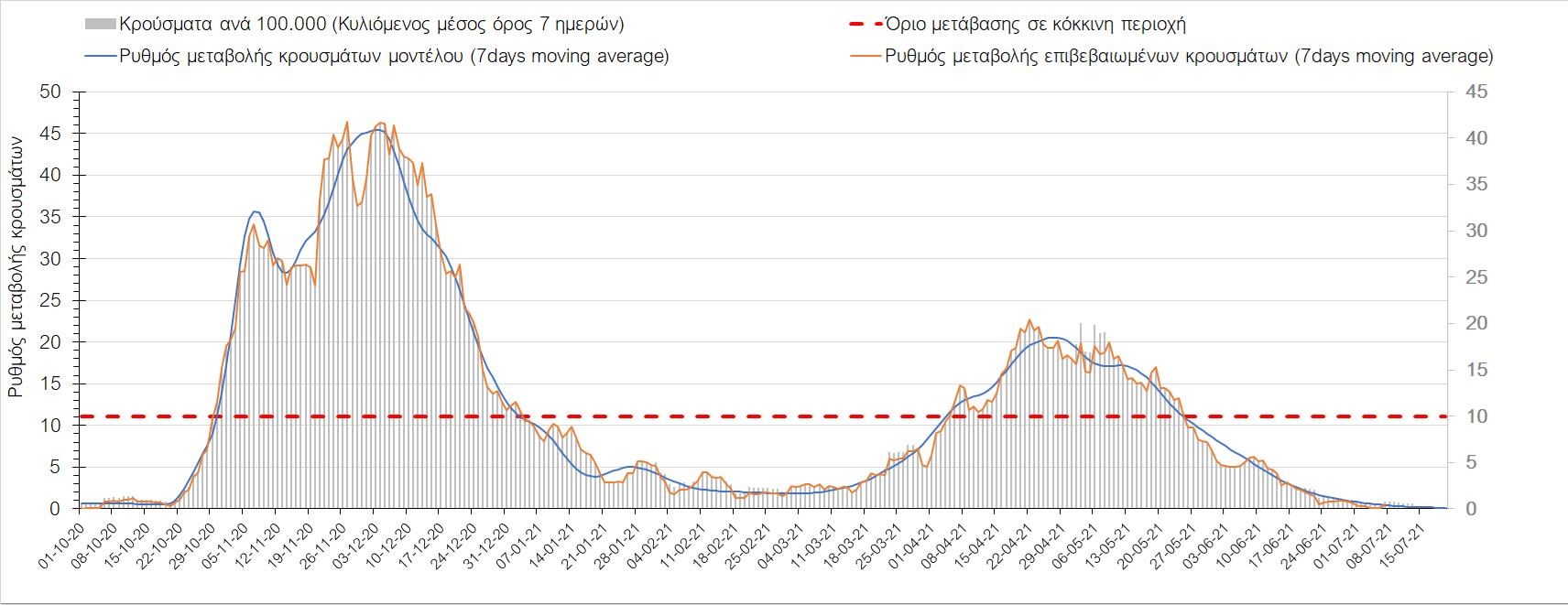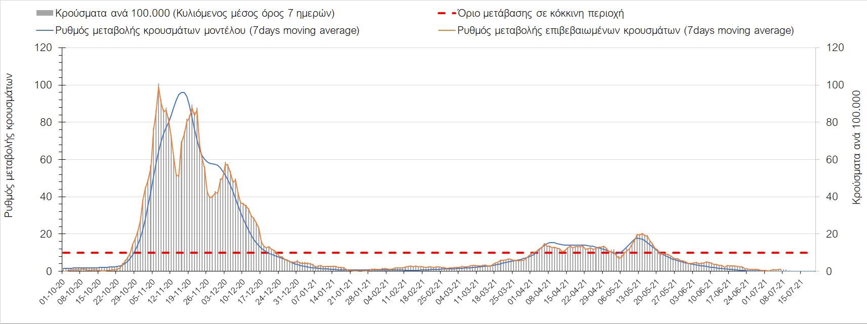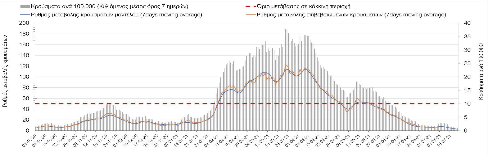 Σχήμα 37. Πορεία του ημερησίου αριθμού των κρουσμάτων (κυλιόμενος μέσος όρος 7 ημερών) στην Πιερία