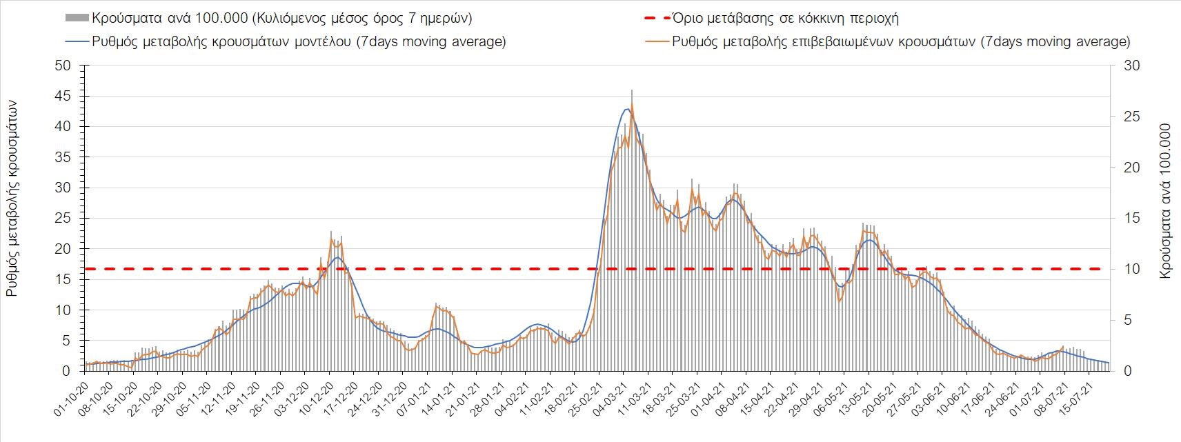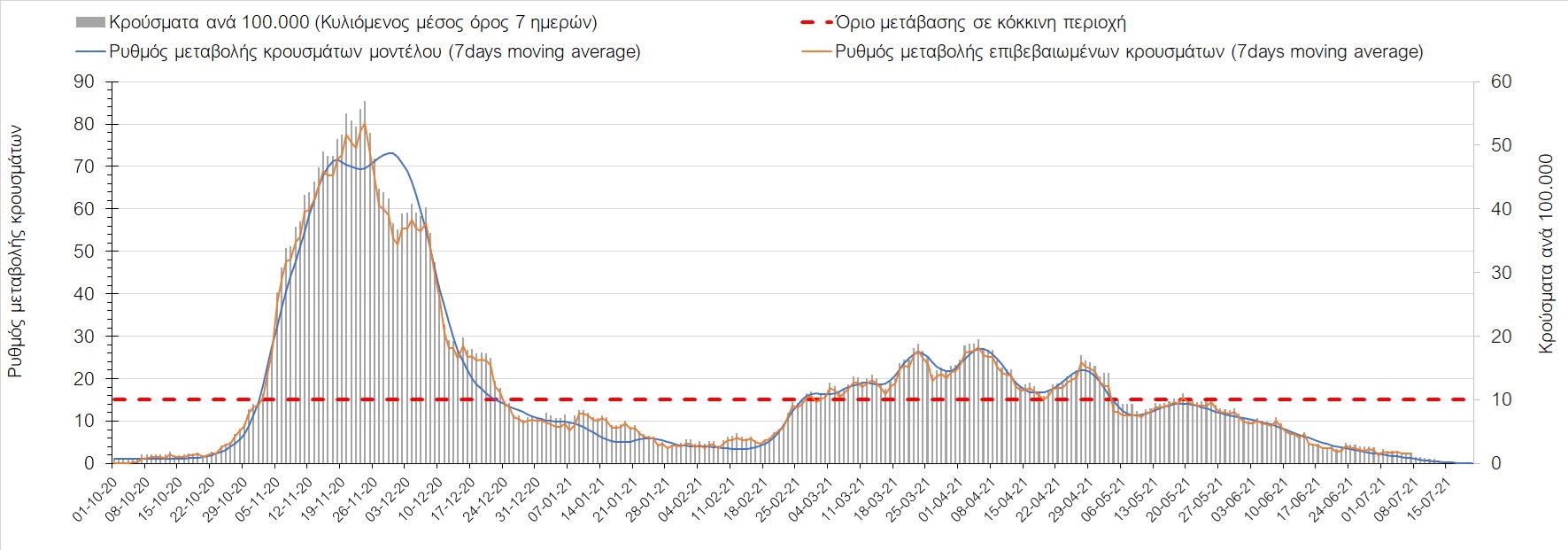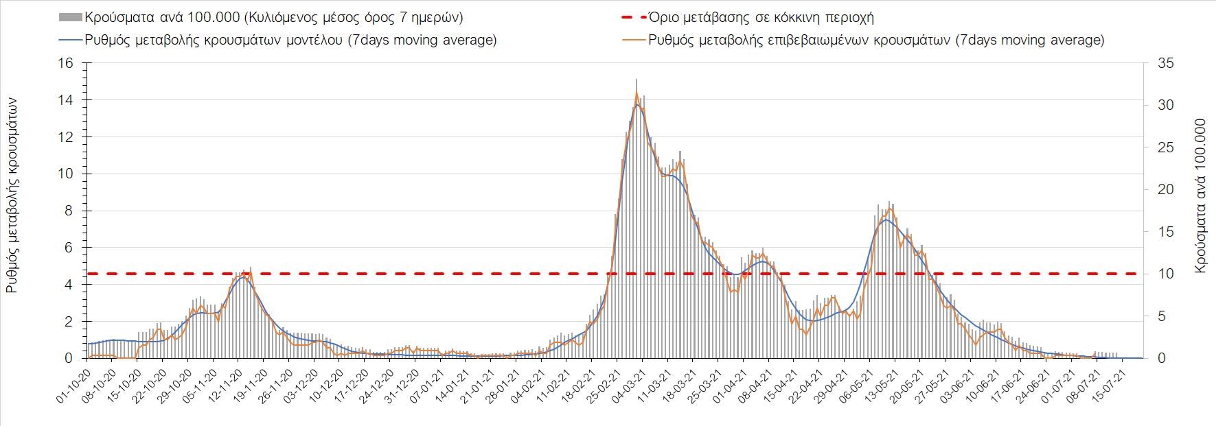 Σχήμα 37. Πορεία του ημερησίου αριθμού των κρουσμάτων (κυλιόμενος μέσος όρος 7 ημερών) στην Πιερία
