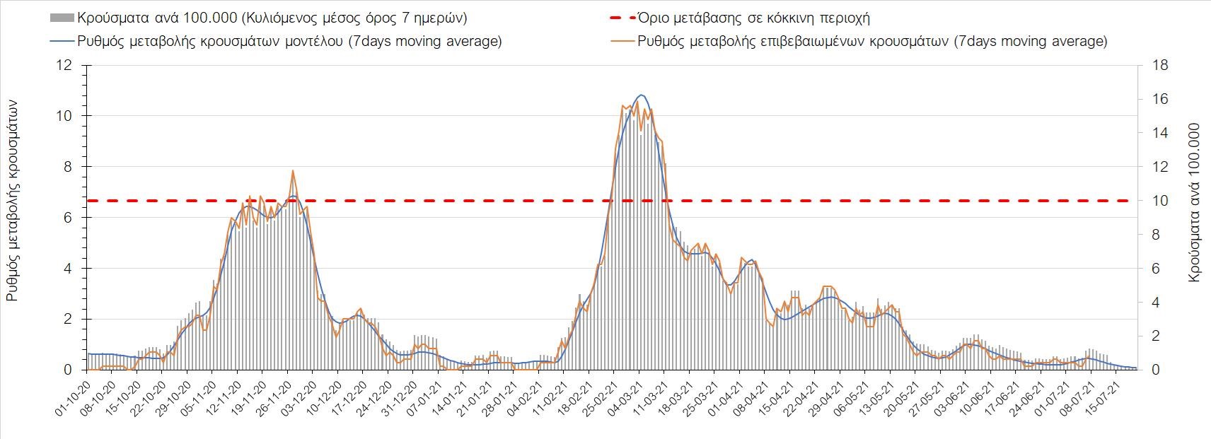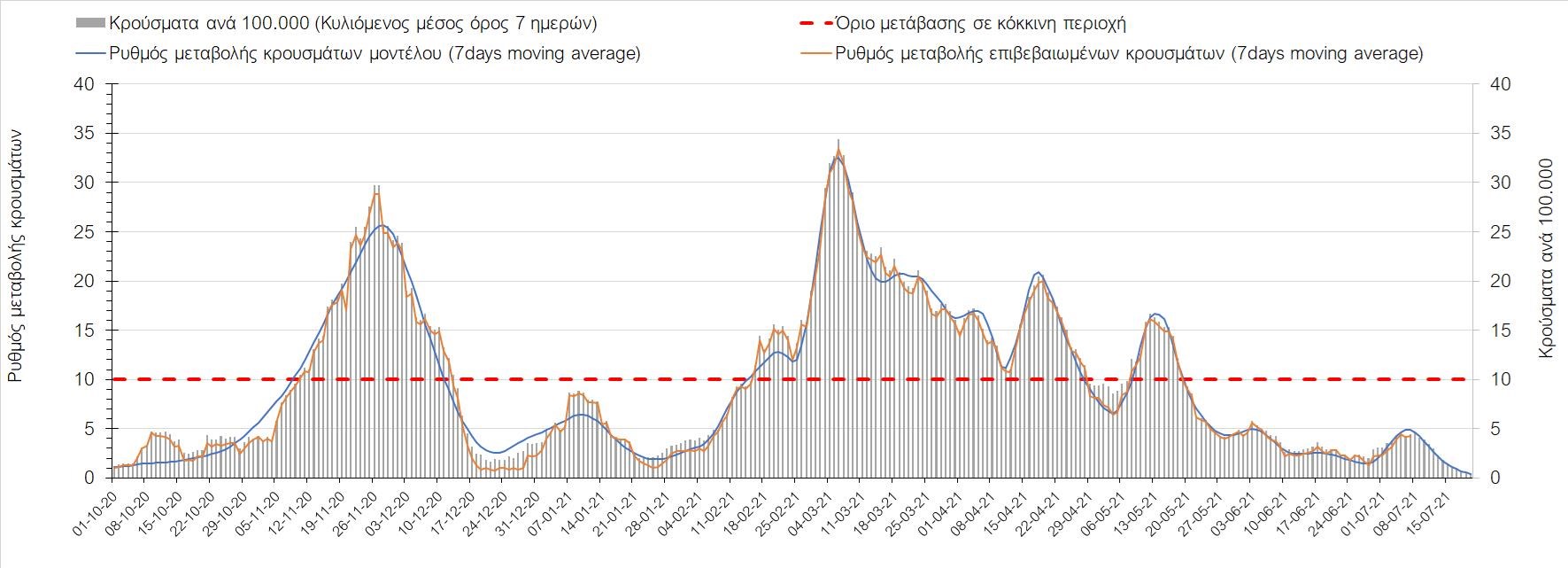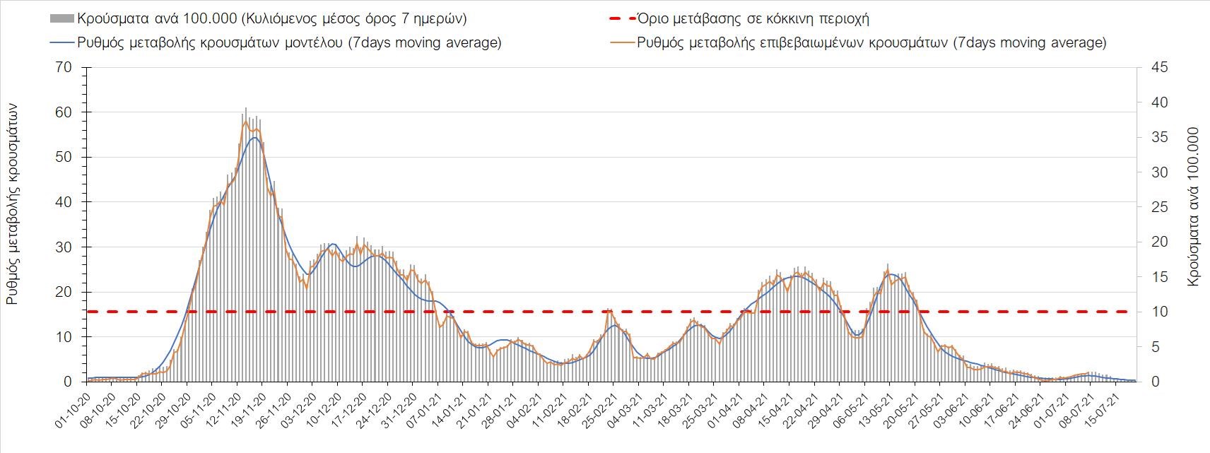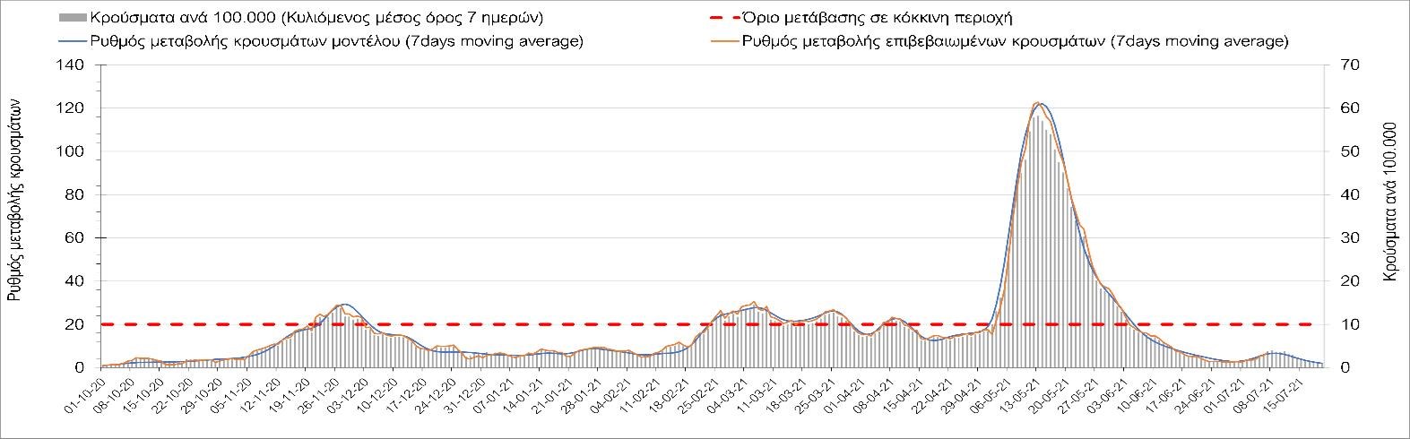 Σχήμα 44. Πορεία του ημερησίου αριθμού των κρουσμάτων (κυλιόμενος μέσος όρος 7 ημερών) στον ΈβροΣτο Ηράκλειο, όπου εντοπίστηκαν 70 κρούσματα, παρατηρείται μικρότερος αριθμός σε σχέση με την Τρίτη και παρατηρείται πλέον διαμόρφωση ενός νέου ανοδικού κύματος, που πιθανότατα οφείλεται στο σχετικά μεγάλο αριθμό κρουσμάτων που φέρουν το μεταλλαγμένο στέλεχος Δ (Σχήμα 45). Στα Χανιά με 18 κρούσματα (Σχήμα 46) έχουμε μειωμένο αριθμό κρουσμάτων σε σχέση με την Τρίτη και πλέον και εδώ αρχίζει να διαμορφώνεται μια ανοδική πορεία με διακυμάνσεις. Μειωμένος αριθμός κρουσμάτων παρατηρείται στο Ρέθυμνο με 69 κρούσματα, όπου παρατηρείται μια πολύ έντονη ανοδική διακύμανση (Σχήμα 47), η οποία έφερε την περιοχή πολύ πάνω από το όριο του χαρακτηρισμού ως κόκκινη, και δεν αναμένεται έγκαιρη αποκλιμάκωση. Στο Λασίθι παρατηρείται αυξημένος αριθμός κρουσμάτων σχέση με την Τρίτη, καθώς εντοπίστηκαν 15 κρούσματα (Σχήμα 48), με αποτέλεσμα και σε αυτήν την περιοχή να έχει διαμορφωθεί πολύ έντονα ανοδική τάση.