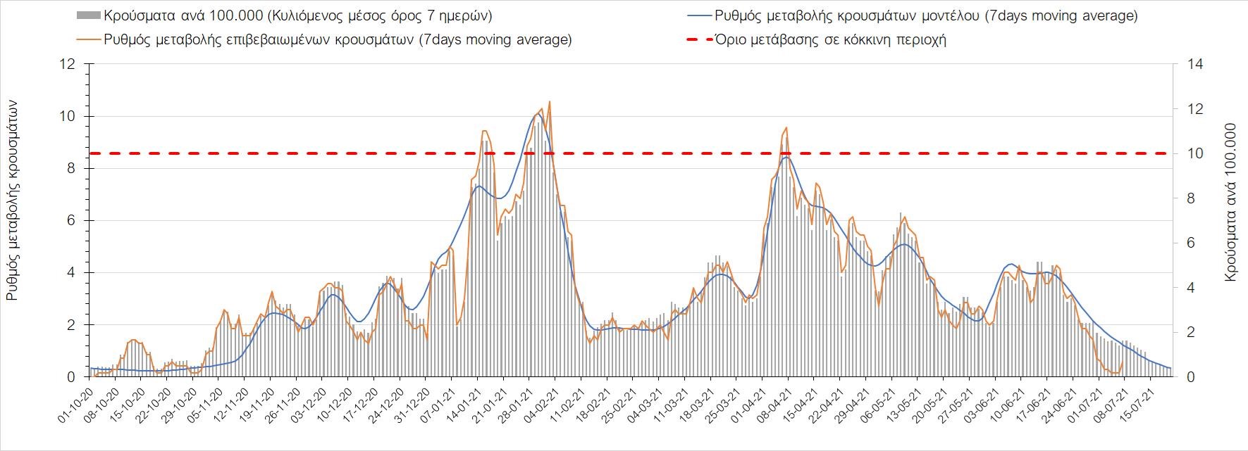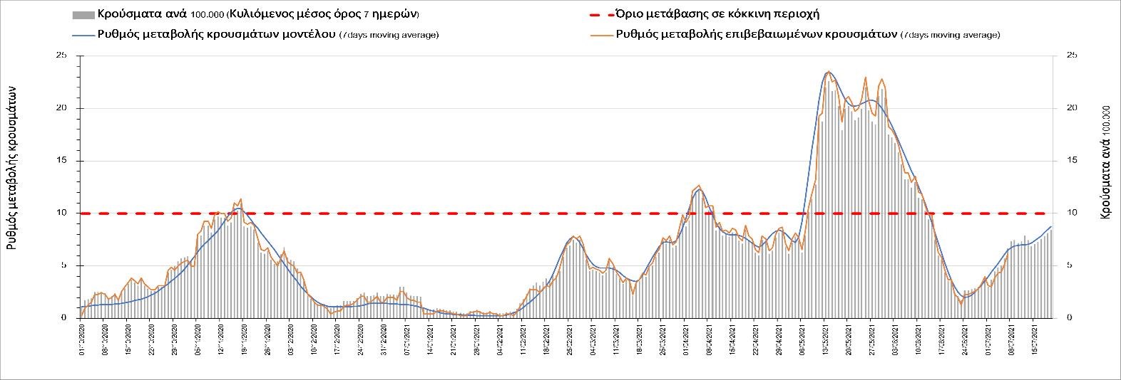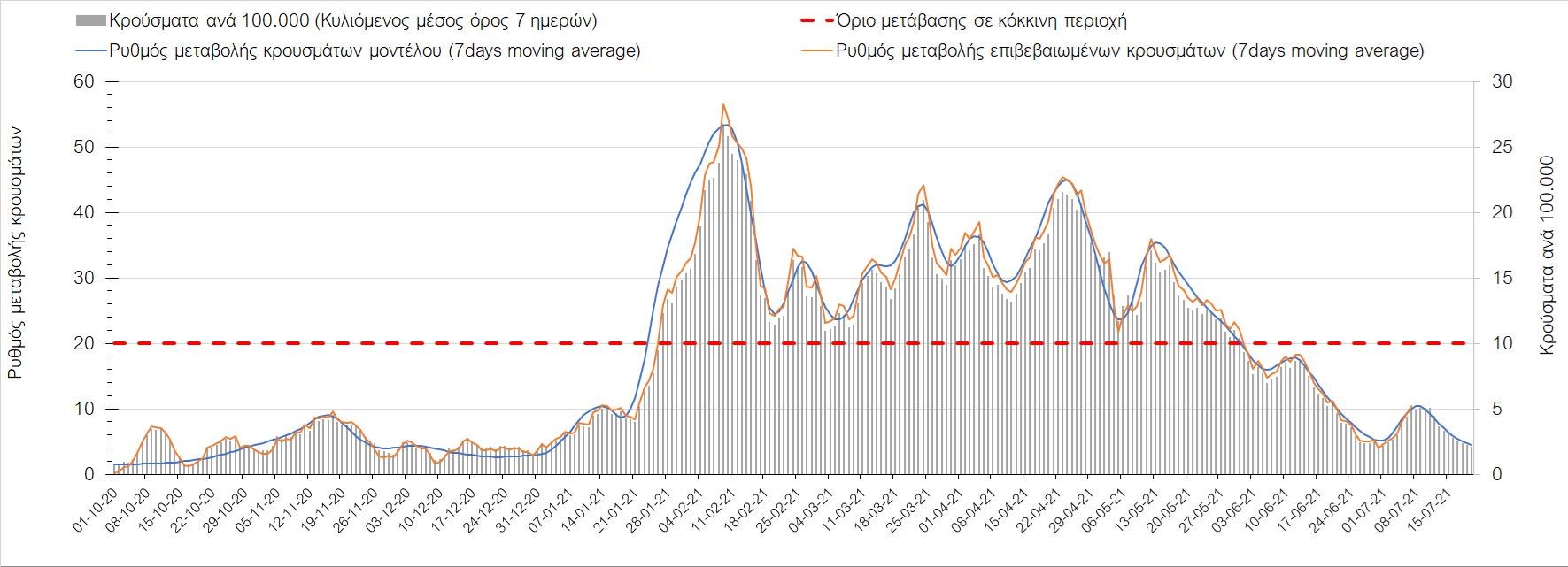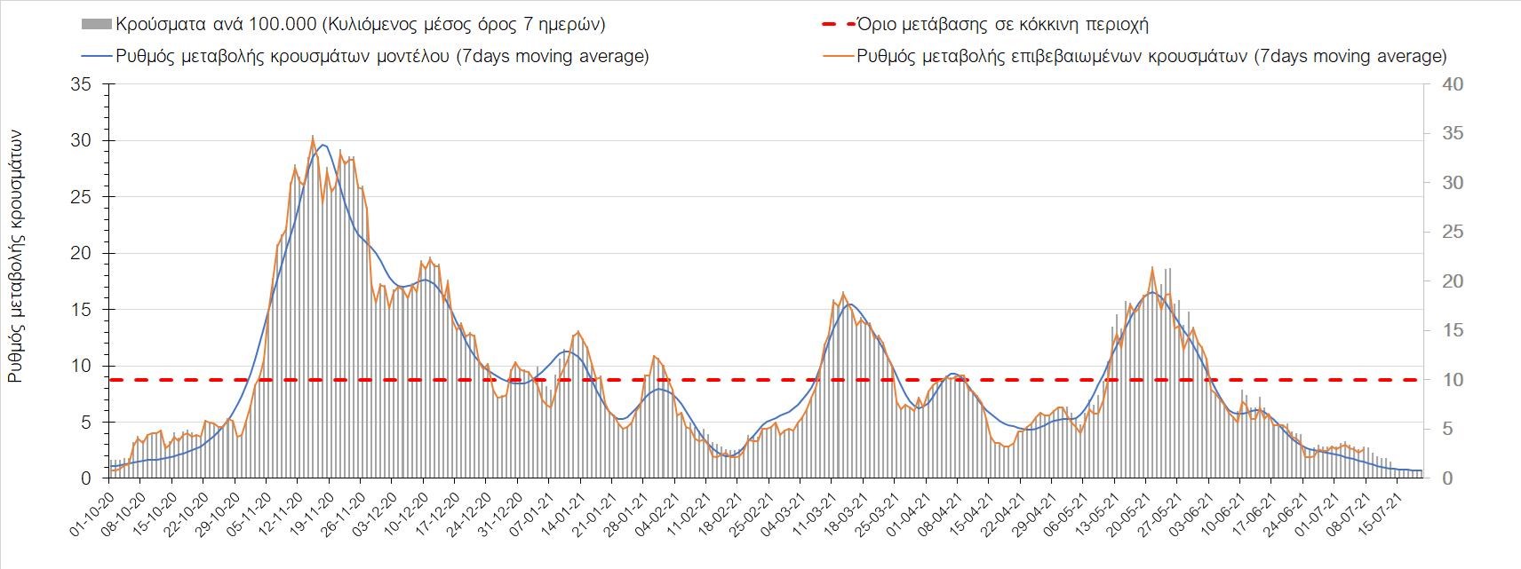 Σχήμα 44. Πορεία του ημερησίου αριθμού των κρουσμάτων (κυλιόμενος μέσος όρος 7 ημερών) στον ΈβροΣτο Ηράκλειο, όπου εντοπίστηκαν 70 κρούσματα, παρατηρείται μικρότερος αριθμός σε σχέση με την Τρίτη και παρατηρείται πλέον διαμόρφωση ενός νέου ανοδικού κύματος, που πιθανότατα οφείλεται στο σχετικά μεγάλο αριθμό κρουσμάτων που φέρουν το μεταλλαγμένο στέλεχος Δ (Σχήμα 45). Στα Χανιά με 18 κρούσματα (Σχήμα 46) έχουμε μειωμένο αριθμό κρουσμάτων σε σχέση με την Τρίτη και πλέον και εδώ αρχίζει να διαμορφώνεται μια ανοδική πορεία με διακυμάνσεις. Μειωμένος αριθμός κρουσμάτων παρατηρείται στο Ρέθυμνο με 69 κρούσματα, όπου παρατηρείται μια πολύ έντονη ανοδική διακύμανση (Σχήμα 47), η οποία έφερε την περιοχή πολύ πάνω από το όριο του χαρακτηρισμού ως κόκκινη, και δεν αναμένεται έγκαιρη αποκλιμάκωση. Στο Λασίθι παρατηρείται αυξημένος αριθμός κρουσμάτων σχέση με την Τρίτη, καθώς εντοπίστηκαν 15 κρούσματα (Σχήμα 48), με αποτέλεσμα και σε αυτήν την περιοχή να έχει διαμορφωθεί πολύ έντονα ανοδική τάση.