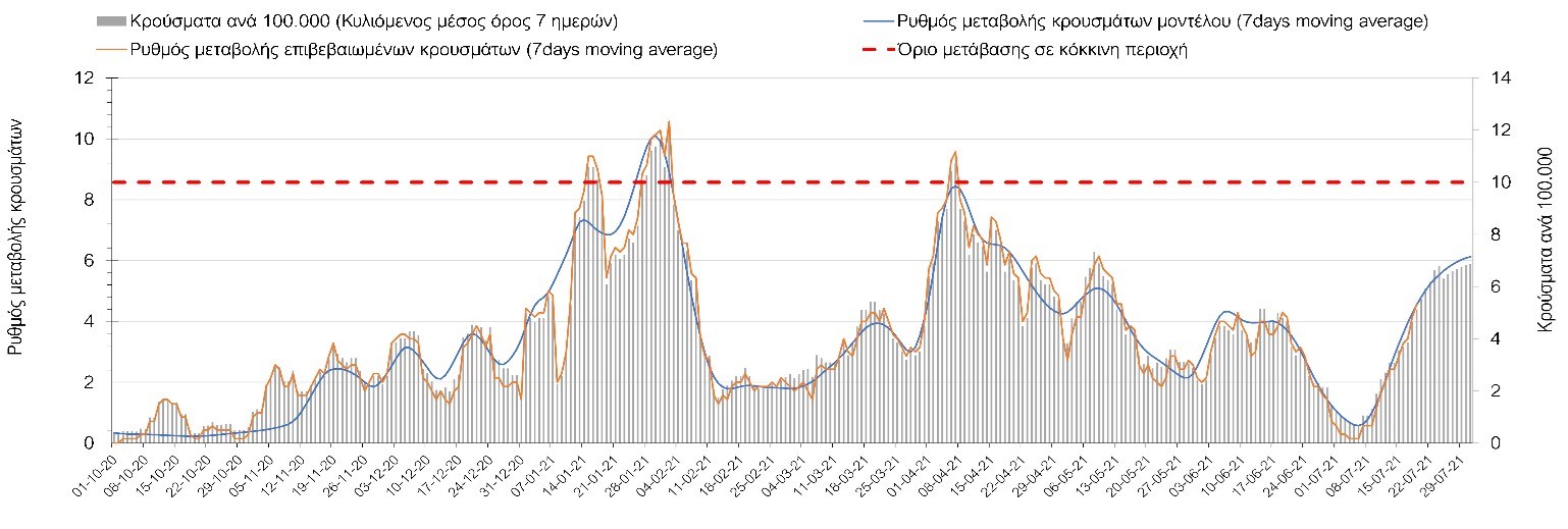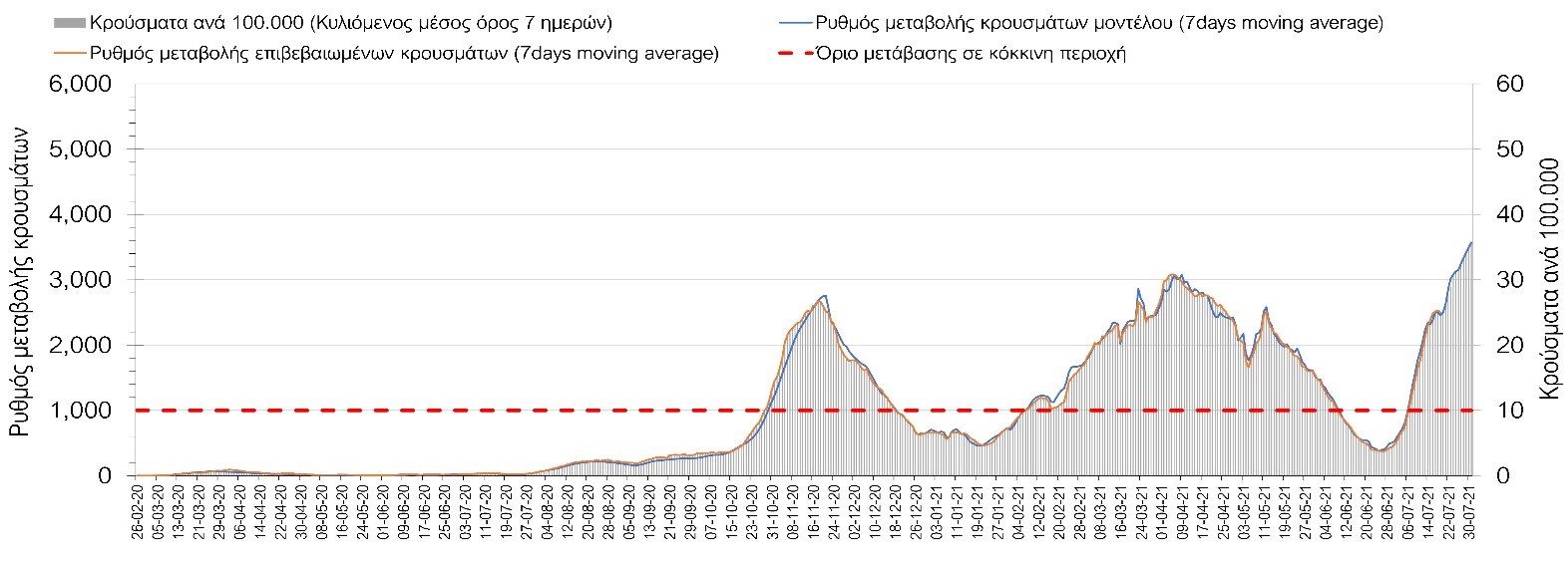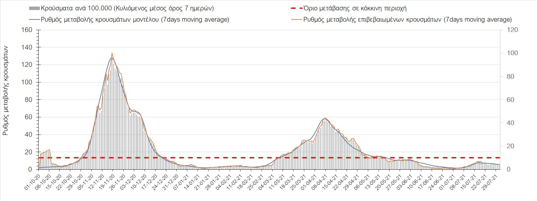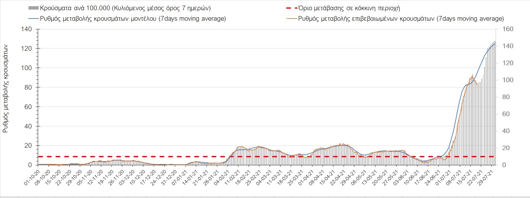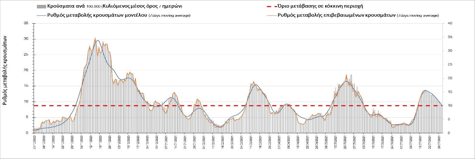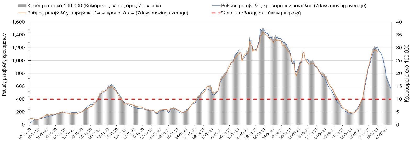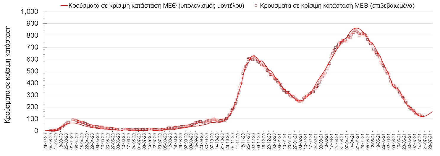 Σχήμα 4. Πορεία του ημερησίου αριθμού των κρουσμάτων (κυλιόμενος μέσος όρος 7 ημερών) στην Ελληνική επικράτειαΣτις επιμέρους περιοχές με υψηλό υγειονομικό κίνδυνο, τη Δευτέρα παρατηρείται υψηλότερος αριθμός κρουσμάτων τόσο στη Θεσσαλονίκη με 123 κρούσματα (112 κρούσματα προχθές), όσο και στην Αττική με 720 κρούσματα (610 κρούσματα προχθές). Η Αθήνα πλέον αντιπροσωπεύει περίπου το 40% των κρουσμάτων, και εμφανίζει σχεδόν 6 φορές περισσότερα κρούσματα από τη Θεσσαλονίκη. Η πορεία των κρουσμάτων στην Αττική, παρουσιάζεται στο Σχήμα 5, ενώ η πορεία των κρουσμάτων σε κρίσιμη κατάσταση (διασωληνωμένοι σε ΜΕΘ) παρουσιάζονται στο Σχήμα 6. Από την αρχή του μήνα παρατηρείται μια αύξηση του αριθμού των κρουσμάτων στην Αθήνα, η οποία δεν συνάδει ούτε με τη διαμόρφωση της μεταδοτικότητας από τη θερμοκρασία, αλλά ούτε και με τα υπάρχοντα μέτρα, και η οποία τη έχει φέρει πέρα από το όριο της κόκκινης περιοχής. Μια πιθανή εξήγηση είναι η αυξημένη διασπορά στην κοινότητα των μεταλλαγμένων στελεχών Β.1.1.318 και Β.1.167, οπότε και αναμένουμε τα δεδομένα των επομένων ημερών για να μπορέσουμε να διαμορφώσουμε μια πιο σαφή εικόνα. Με βάση τη μεγάλη απόκλιση που εμφανίζει η Αθήνα, η πορεία της μπορεί να εξηγηθεί μόνο εάν ληφθεί υπόψη πολύ μεγαλύτερη εγγενής μεταδοτικότητα του ιού, συνεπώς η διασπορά των ταχύτερα μεταδιδόμενων μεταλλάξεων είναι πολύ μεγαλύτερη από ότι στη Θεσσαλονίκη, καθώς επίσης και ότι παρατηρήθηκα φαινόμενα έντονων συρροών. Tα πραγματικά δεδομένα εξηγούνται μόνο εάν θεωρήσουμε ότι το στέλεχος Β.1.1.318 έχει κυριαρχήσει έναντι του Β.1.1.7, και ταυτόχρονα η διασπορά του Β.1.167 είναι μεγαλύτερη από ότι έχει προσδιοριστεί μέχρι τώρα. Αξίζει να σημειωθεί, ότι με τα δεδομένα των τελευταίων ημερών, παρατηρείται επιβράδυνση της ανοδικής τάσης, και η επίδραση των φαινομένων συρροής φαίνεται να περιορίζεται, οπότε και με τα σημερινά αποτελέσματα επιβεβαιώθηκε η πρόβλεψη μας από τις 16/7, ότι θα μεταβούμε σε κάποιας μορφή αποκλιμάκωση, εκτός εάν επαναληφθούν φαινόμενα έντονης συρροής.