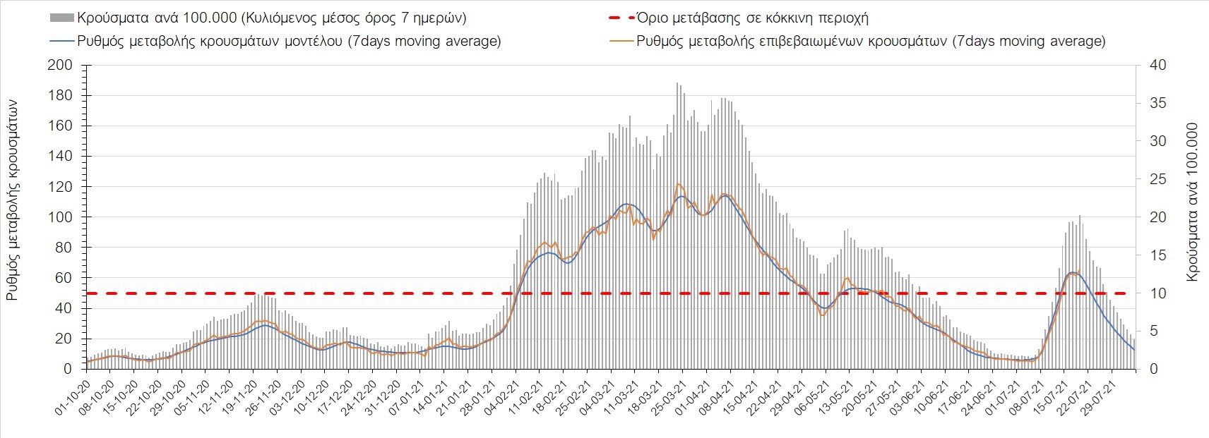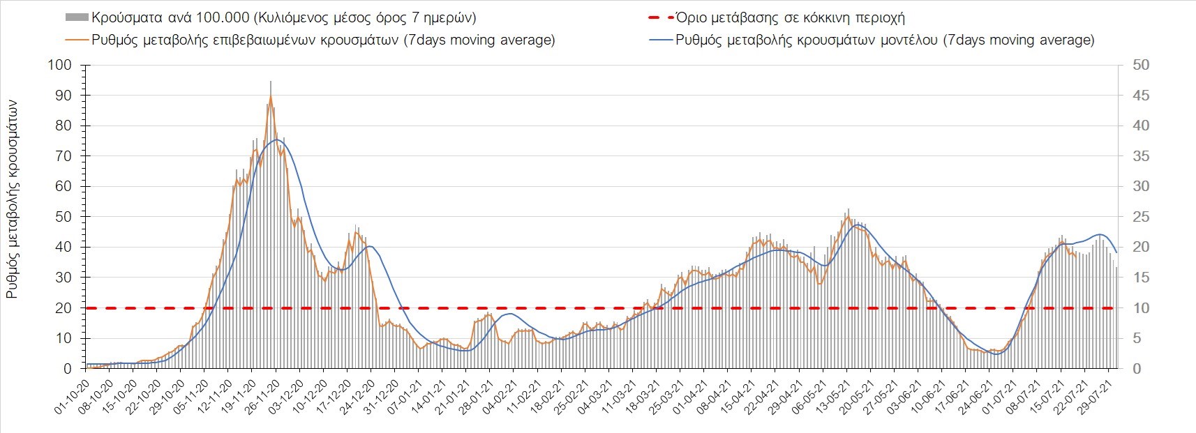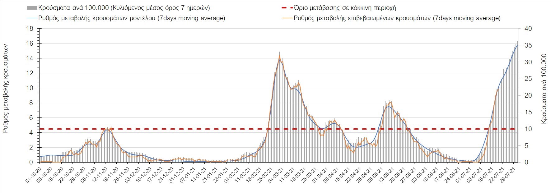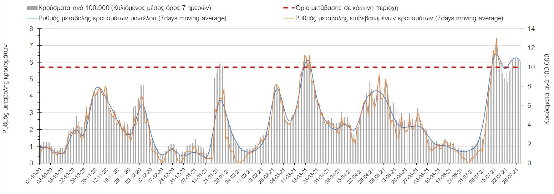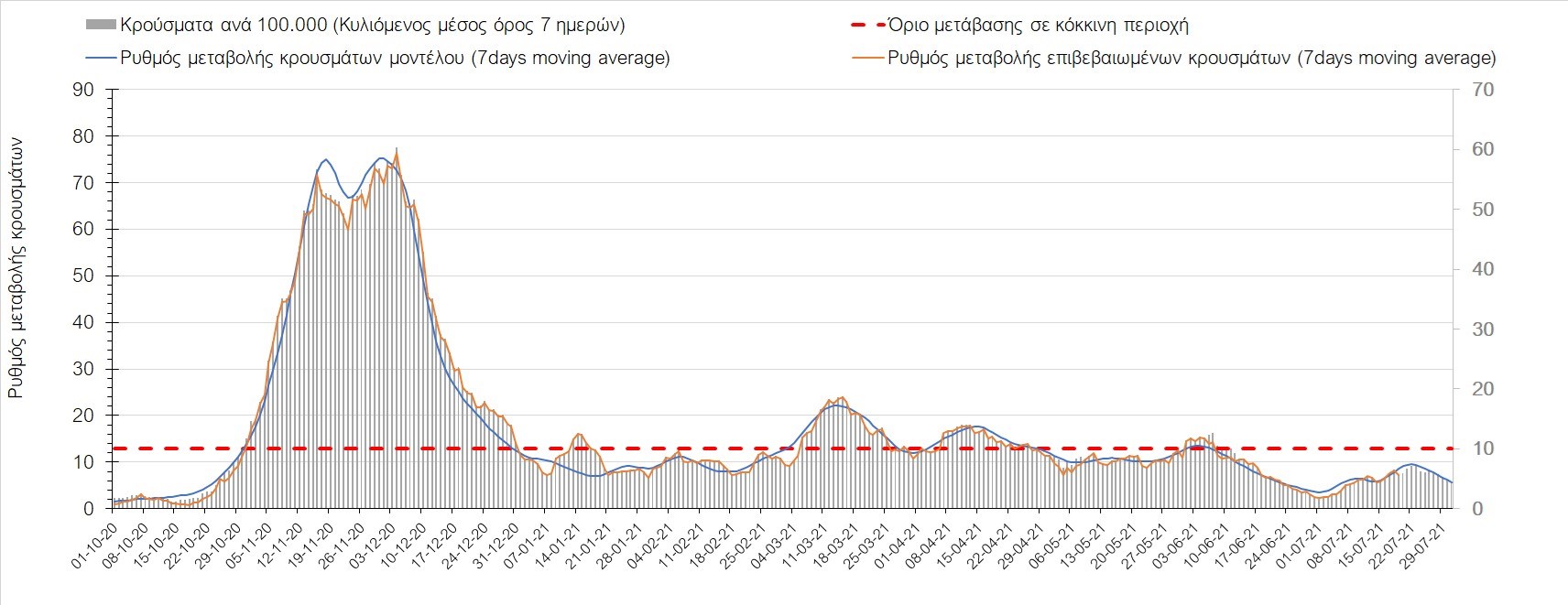 Σχήμα 4. Πορεία του ημερησίου αριθμού των κρουσμάτων (κυλιόμενος μέσος όρος 7 ημερών) στην Ελληνική επικράτειαΣτις επιμέρους περιοχές με υψηλό υγειονομικό κίνδυνο, τη Δευτέρα παρατηρείται υψηλότερος αριθμός κρουσμάτων τόσο στη Θεσσαλονίκη με 123 κρούσματα (112 κρούσματα προχθές), όσο και στην Αττική με 720 κρούσματα (610 κρούσματα προχθές). Η Αθήνα πλέον αντιπροσωπεύει περίπου το 40% των κρουσμάτων, και εμφανίζει σχεδόν 6 φορές περισσότερα κρούσματα από τη Θεσσαλονίκη. Η πορεία των κρουσμάτων στην Αττική, παρουσιάζεται στο Σχήμα 5, ενώ η πορεία των κρουσμάτων σε κρίσιμη κατάσταση (διασωληνωμένοι σε ΜΕΘ) παρουσιάζονται στο Σχήμα 6. Από την αρχή του μήνα παρατηρείται μια αύξηση του αριθμού των κρουσμάτων στην Αθήνα, η οποία δεν συνάδει ούτε με τη διαμόρφωση της μεταδοτικότητας από τη θερμοκρασία, αλλά ούτε και με τα υπάρχοντα μέτρα, και η οποία τη έχει φέρει πέρα από το όριο της κόκκινης περιοχής. Μια πιθανή εξήγηση είναι η αυξημένη διασπορά στην κοινότητα των μεταλλαγμένων στελεχών Β.1.1.318 και Β.1.167, οπότε και αναμένουμε τα δεδομένα των επομένων ημερών για να μπορέσουμε να διαμορφώσουμε μια πιο σαφή εικόνα. Με βάση τη μεγάλη απόκλιση που εμφανίζει η Αθήνα, η πορεία της μπορεί να εξηγηθεί μόνο εάν ληφθεί υπόψη πολύ μεγαλύτερη εγγενής μεταδοτικότητα του ιού, συνεπώς η διασπορά των ταχύτερα μεταδιδόμενων μεταλλάξεων είναι πολύ μεγαλύτερη από ότι στη Θεσσαλονίκη, καθώς επίσης και ότι παρατηρήθηκα φαινόμενα έντονων συρροών. Tα πραγματικά δεδομένα εξηγούνται μόνο εάν θεωρήσουμε ότι το στέλεχος Β.1.1.318 έχει κυριαρχήσει έναντι του Β.1.1.7, και ταυτόχρονα η διασπορά του Β.1.167 είναι μεγαλύτερη από ότι έχει προσδιοριστεί μέχρι τώρα. Αξίζει να σημειωθεί, ότι με τα δεδομένα των τελευταίων ημερών, παρατηρείται επιβράδυνση της ανοδικής τάσης, και η επίδραση των φαινομένων συρροής φαίνεται να περιορίζεται, οπότε και με τα σημερινά αποτελέσματα επιβεβαιώθηκε η πρόβλεψη μας από τις 16/7, ότι θα μεταβούμε σε κάποιας μορφή αποκλιμάκωση, εκτός εάν επαναληφθούν φαινόμενα έντονης συρροής.