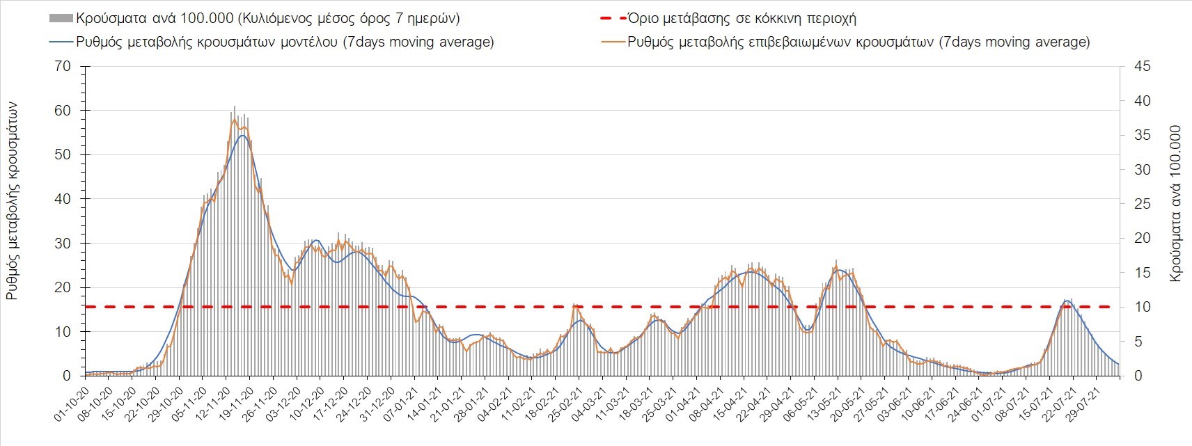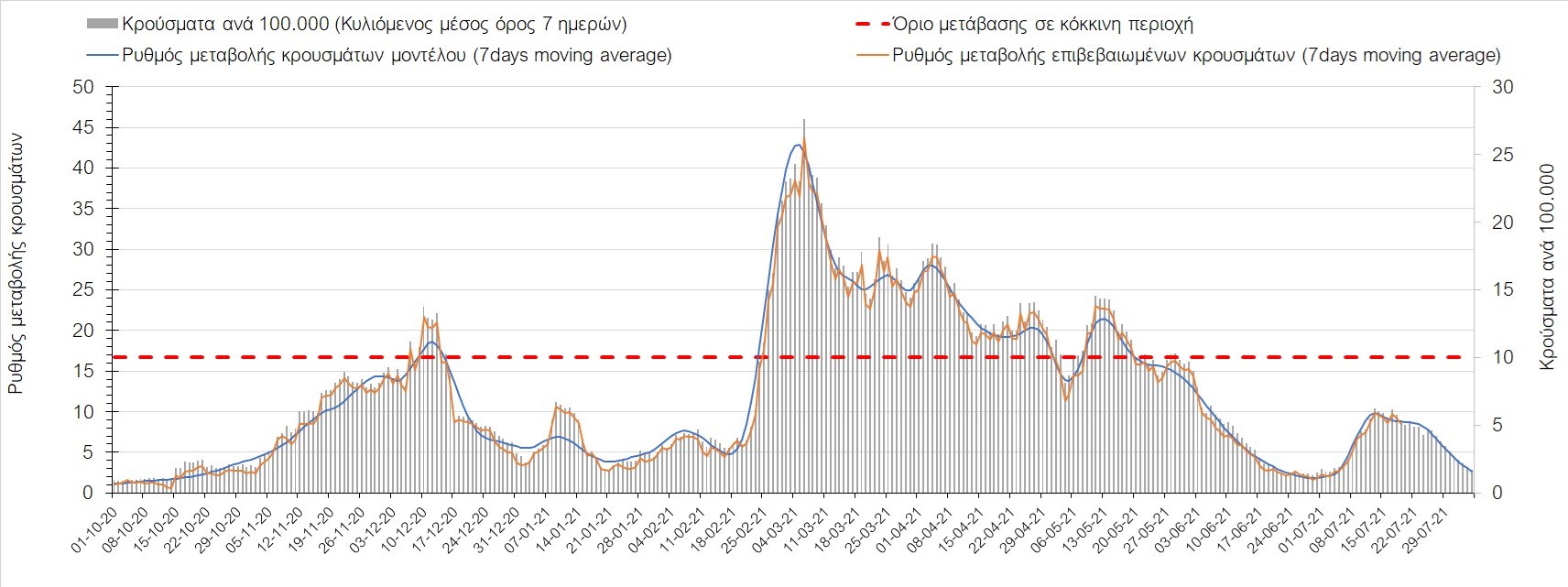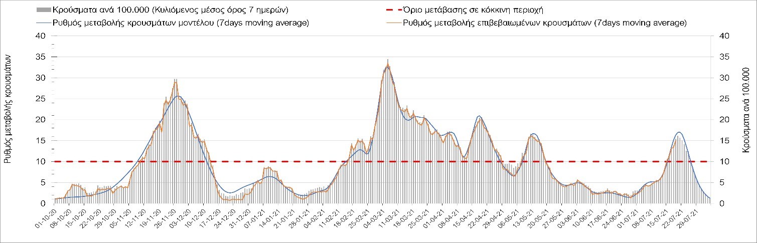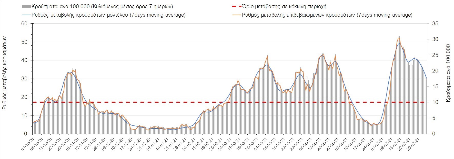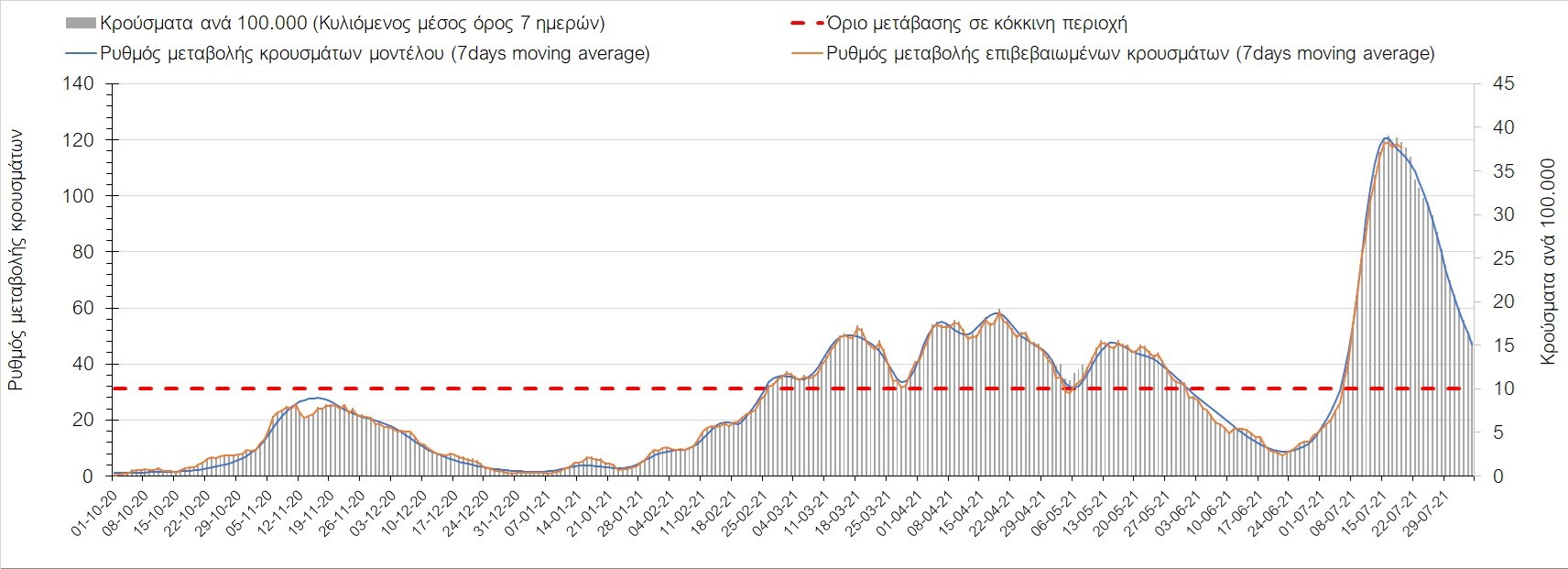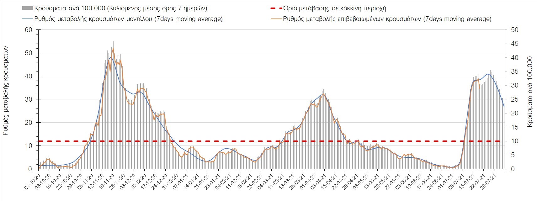 Σχήμα 4. Πορεία του ημερησίου αριθμού των κρουσμάτων (κυλιόμενος μέσος όρος 7 ημερών) στην Ελληνική επικράτειαΣτις επιμέρους περιοχές με υψηλό υγειονομικό κίνδυνο, τη Δευτέρα παρατηρείται υψηλότερος αριθμός κρουσμάτων τόσο στη Θεσσαλονίκη με 123 κρούσματα (112 κρούσματα προχθές), όσο και στην Αττική με 720 κρούσματα (610 κρούσματα προχθές). Η Αθήνα πλέον αντιπροσωπεύει περίπου το 40% των κρουσμάτων, και εμφανίζει σχεδόν 6 φορές περισσότερα κρούσματα από τη Θεσσαλονίκη. Η πορεία των κρουσμάτων στην Αττική, παρουσιάζεται στο Σχήμα 5, ενώ η πορεία των κρουσμάτων σε κρίσιμη κατάσταση (διασωληνωμένοι σε ΜΕΘ) παρουσιάζονται στο Σχήμα 6. Από την αρχή του μήνα παρατηρείται μια αύξηση του αριθμού των κρουσμάτων στην Αθήνα, η οποία δεν συνάδει ούτε με τη διαμόρφωση της μεταδοτικότητας από τη θερμοκρασία, αλλά ούτε και με τα υπάρχοντα μέτρα, και η οποία τη έχει φέρει πέρα από το όριο της κόκκινης περιοχής. Μια πιθανή εξήγηση είναι η αυξημένη διασπορά στην κοινότητα των μεταλλαγμένων στελεχών Β.1.1.318 και Β.1.167, οπότε και αναμένουμε τα δεδομένα των επομένων ημερών για να μπορέσουμε να διαμορφώσουμε μια πιο σαφή εικόνα. Με βάση τη μεγάλη απόκλιση που εμφανίζει η Αθήνα, η πορεία της μπορεί να εξηγηθεί μόνο εάν ληφθεί υπόψη πολύ μεγαλύτερη εγγενής μεταδοτικότητα του ιού, συνεπώς η διασπορά των ταχύτερα μεταδιδόμενων μεταλλάξεων είναι πολύ μεγαλύτερη από ότι στη Θεσσαλονίκη, καθώς επίσης και ότι παρατηρήθηκα φαινόμενα έντονων συρροών. Tα πραγματικά δεδομένα εξηγούνται μόνο εάν θεωρήσουμε ότι το στέλεχος Β.1.1.318 έχει κυριαρχήσει έναντι του Β.1.1.7, και ταυτόχρονα η διασπορά του Β.1.167 είναι μεγαλύτερη από ότι έχει προσδιοριστεί μέχρι τώρα. Αξίζει να σημειωθεί, ότι με τα δεδομένα των τελευταίων ημερών, παρατηρείται επιβράδυνση της ανοδικής τάσης, και η επίδραση των φαινομένων συρροής φαίνεται να περιορίζεται, οπότε και με τα σημερινά αποτελέσματα επιβεβαιώθηκε η πρόβλεψη μας από τις 16/7, ότι θα μεταβούμε σε κάποιας μορφή αποκλιμάκωση, εκτός εάν επαναληφθούν φαινόμενα έντονης συρροής.