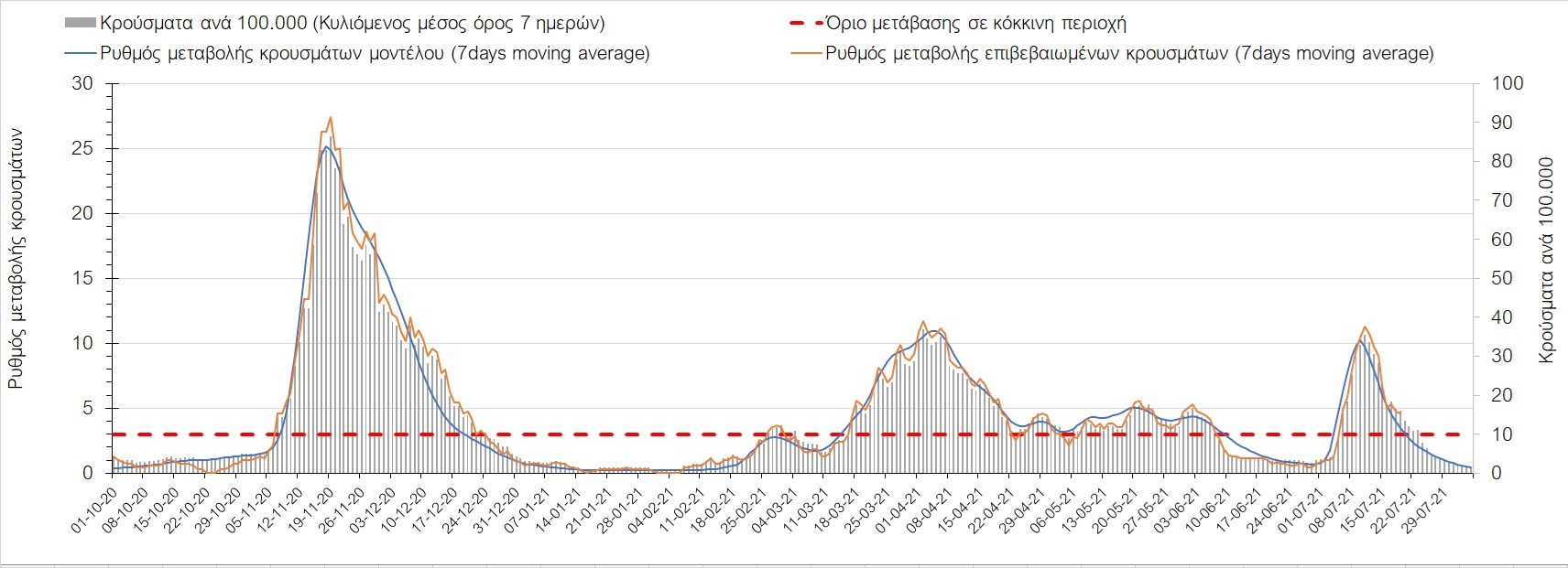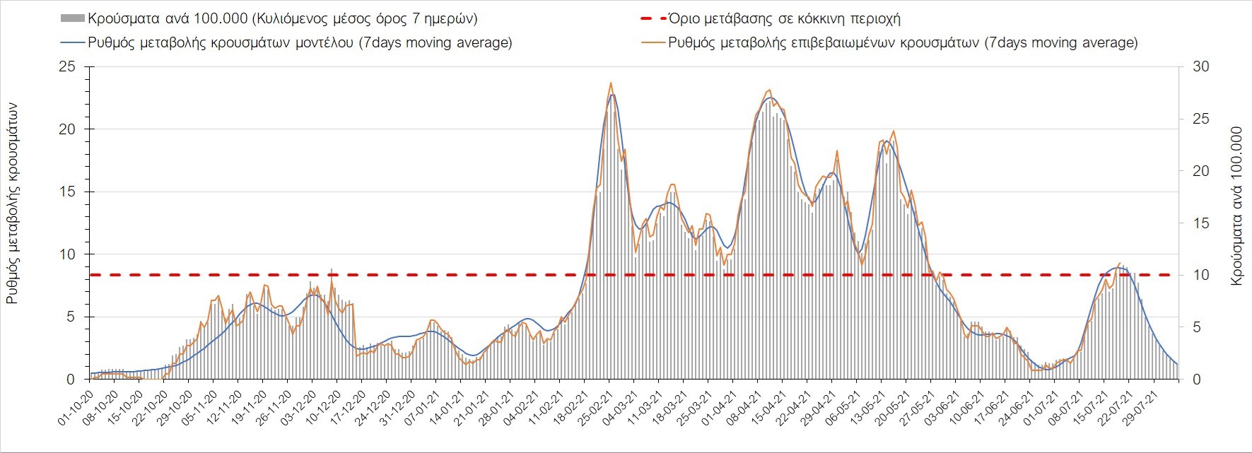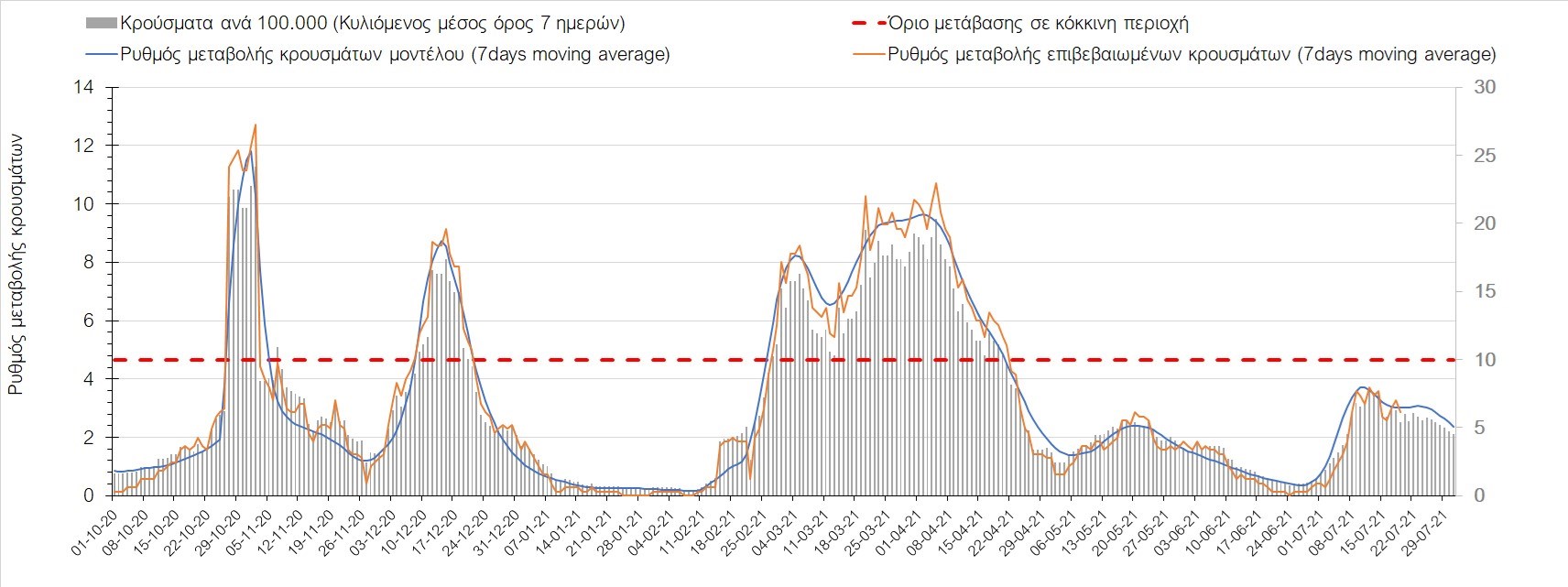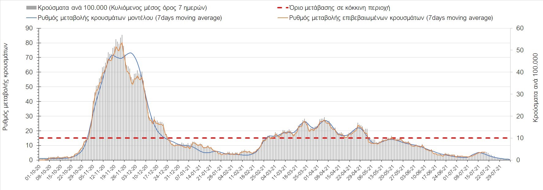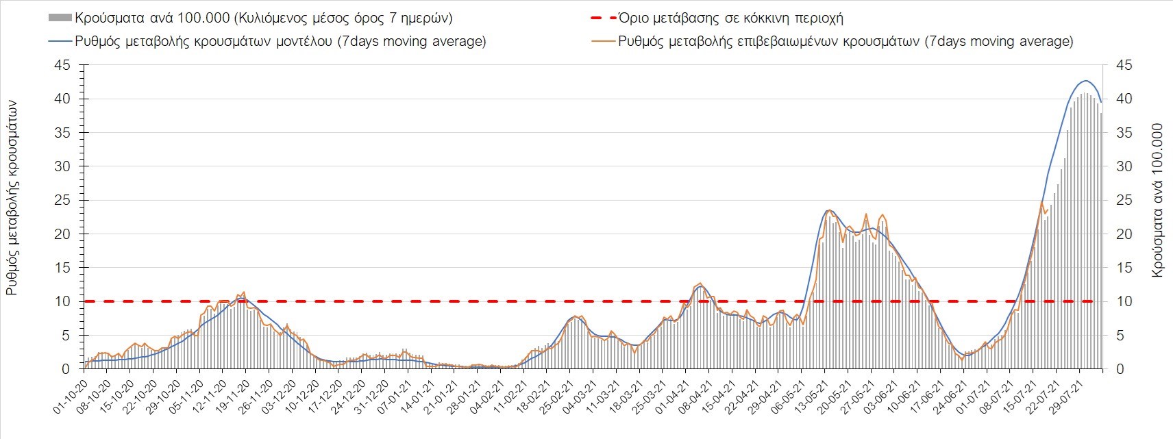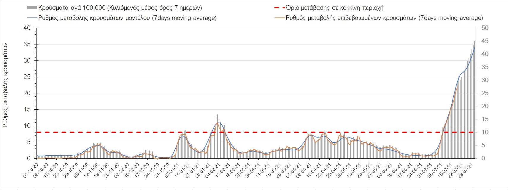Σχήμα 4. Πορεία του ημερησίου αριθμού των κρουσμάτων (κυλιόμενος μέσος όρος 7 ημερών) στην Ελληνική επικράτειαΣτις επιμέρους περιοχές με υψηλό υγειονομικό κίνδυνο, τη Δευτέρα παρατηρείται υψηλότερος αριθμός κρουσμάτων τόσο στη Θεσσαλονίκη με 123 κρούσματα (112 κρούσματα προχθές), όσο και στην Αττική με 720 κρούσματα (610 κρούσματα προχθές). Η Αθήνα πλέον αντιπροσωπεύει περίπου το 40% των κρουσμάτων, και εμφανίζει σχεδόν 6 φορές περισσότερα κρούσματα από τη Θεσσαλονίκη. Η πορεία των κρουσμάτων στην Αττική, παρουσιάζεται στο Σχήμα 5, ενώ η πορεία των κρουσμάτων σε κρίσιμη κατάσταση (διασωληνωμένοι σε ΜΕΘ) παρουσιάζονται στο Σχήμα 6. Από την αρχή του μήνα παρατηρείται μια αύξηση του αριθμού των κρουσμάτων στην Αθήνα, η οποία δεν συνάδει ούτε με τη διαμόρφωση της μεταδοτικότητας από τη θερμοκρασία, αλλά ούτε και με τα υπάρχοντα μέτρα, και η οποία τη έχει φέρει πέρα από το όριο της κόκκινης περιοχής. Μια πιθανή εξήγηση είναι η αυξημένη διασπορά στην κοινότητα των μεταλλαγμένων στελεχών Β.1.1.318 και Β.1.167, οπότε και αναμένουμε τα δεδομένα των επομένων ημερών για να μπορέσουμε να διαμορφώσουμε μια πιο σαφή εικόνα. Με βάση τη μεγάλη απόκλιση που εμφανίζει η Αθήνα, η πορεία της μπορεί να εξηγηθεί μόνο εάν ληφθεί υπόψη πολύ μεγαλύτερη εγγενής μεταδοτικότητα του ιού, συνεπώς η διασπορά των ταχύτερα μεταδιδόμενων μεταλλάξεων είναι πολύ μεγαλύτερη από ότι στη Θεσσαλονίκη, καθώς επίσης και ότι παρατηρήθηκα φαινόμενα έντονων συρροών. Tα πραγματικά δεδομένα εξηγούνται μόνο εάν θεωρήσουμε ότι το στέλεχος Β.1.1.318 έχει κυριαρχήσει έναντι του Β.1.1.7, και ταυτόχρονα η διασπορά του Β.1.167 είναι μεγαλύτερη από ότι έχει προσδιοριστεί μέχρι τώρα. Αξίζει να σημειωθεί, ότι με τα δεδομένα των τελευταίων ημερών, παρατηρείται επιβράδυνση της ανοδικής τάσης, και η επίδραση των φαινομένων συρροής φαίνεται να περιορίζεται, οπότε και με τα σημερινά αποτελέσματα επιβεβαιώθηκε η πρόβλεψη μας από τις 16/7, ότι θα μεταβούμε σε κάποιας μορφή αποκλιμάκωση, εκτός εάν επαναληφθούν φαινόμενα έντονης συρροής.