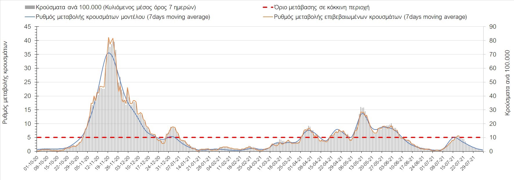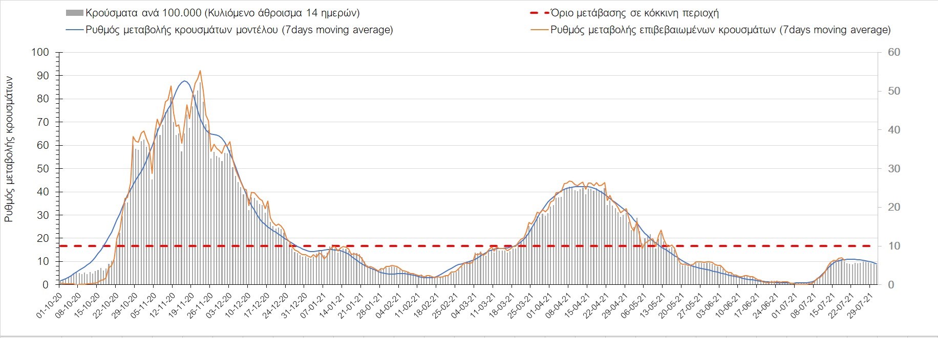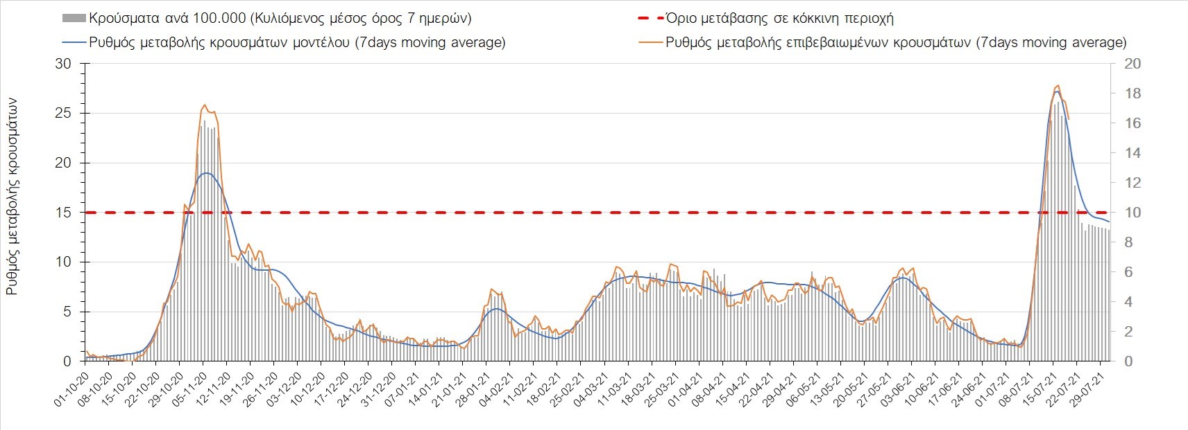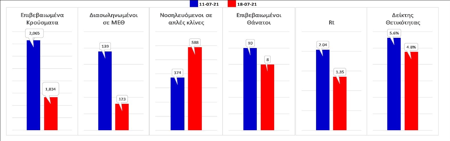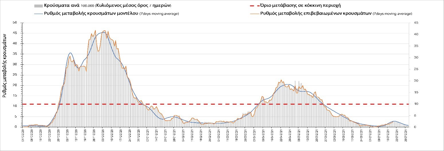 Σχήμα 54. Συγκριτικά αποτελέσματα της επιδημιολογικής εικόνας της σημερινής Δευτέρας (19/07/2021) σε σχέση με την προηγούμενη (12/07/2021) Όσον αφορά στις επιμέρους περιοχές, αρκετές περιοχές πλέον βρίσκονται πάνω από το όριο χαρακτηρισμού ως κόκκινες, όπως η Αθήνα, η Θεσσαλονίκη η Λάρισα, η Μαγνησία, η Καρδίτσα, η Αχαΐα, η Αργολίδα, η Αρκαδία, η Ηλεία, η Κορινθία, η Μεσσηνία, η Εύβοια, η Βοιωτία, τα Ιωάννινα, η Θεσπρωτία, η Πρέβεζα, τα Γρεβενά, η Κοζάνη, η Φλώρινα, η Χαλκιδική, ο Έβρος, το Ηράκλειο, τα Χανιά, το Ρέθυμνο, το Λασίθι, η Κέρκυρα, η Λέσβος και η Πάρος, ενώ παρατηρούνται έντονα ανοδικές τάσεις στη Φωκίδα, την Άρτα, και τη Χίο. Ιδιαίτερα στην Αθήνα, προβληματίζει ο βαθμός που αυτή σχετίζεται με την εξάπλωση μεταλλαγμένων και ταχύτερα μεταδιδόμενων στελεχών (κυρίως το Β.1.1.318 και το Β.1.167). Χαρακτηριστικό παράδειγμα της αυξημένης μεταδοτικότητας του στελέχους Δ (Β.1.167) αποτελεί η Κρήτη. Συνολικά η Κρήτη είναι η περιοχή με τη χειρότερη επιδημιολογική εικόνα και η ταχύτητα μετάδοσης (και το αντίστοιχο ύψος του 4ου κύματος που έχει διαμορφωθεί) είναι ενδεικτική της αυξημένης μεταδοτικότητας του στελέχους Δ. Επίσης, καταδεικνύει τον αρνητικό ρόλο που παίζουν οι διαπεριφερειακές μετακινήσεις στη φάση ανάπτυξης της πανδημίας, καθώς η αρχική αύξηση κρουσμάτων στο Ρέθυμνο πρώτα και στο Ηράκλειο έπειτα, ακολουθήθηκε από αυξητική πορεία της διασποράς στα Χανιά και στο Λασίθι. Στην πράξη, η Κρήτη είναι μια περιοχή οδικά απομονωμένη από την υπόλοιπη Ελλάδα, στην οποία, οι διαπεριφερειακές μετακινήσεις επέτρεψαν τη γρήγορη διασπορά του στελέχους Δ. Παρόμοια φαινόμενα διαπεριφερειακής μετάδοσης παρατηρούνται στη Θεσσαλία, αλλά σε πιο ήπια έκταση, όπου η έντονα αυξητική τάση στη Μαγνησία, μεταφέρθηκε σε κάποιο βαθμό και στη Λάρισα, ενώ ακολουθεί και η Καρδίτσα. Αντίστοιχη είναι η διάχυση της διασποράς στην Ήπειρο και πιο συγκεκριμένα από τα Ιωάννινα προς τα εγγύς τουριστικά θέρετρα (Πρέβεζα και Θεσπρωτία). Συνεπώς, ακόμα και για περιοχές που για την ώρα είναι κάτω από το όριο (ή πολύ κοντά στο όριο), οι ανοδικές τάσεις που παρατηρούνται χρήζουν αυξημένης επιδημιολογικής επιτήρησης με εντατικοποίηση του γονιδιωματικού ελέγχου ώστε να ληφθούν εγκαίρως μέτρα περιορισμού της διασποράς του ιού.Επίσης, σύμφωνα με τα πιο πρόσφατα στοιχεία που έγιναν διαθέσιμα, ανησυχία πλέον δημιουργεί η αύξηση του ποσοστού διασποράς του μεταλλαγμένου στελέχους Β.1.1.318 σε συγκεκριμένες περιοχές για το 15νθήμερο από 7/06/2021 έως 20/06/2021, όπου οι αντίστοιχες ποσοστώσεις είναι 33.9% για την Αττική, 12.5% για τη Δυτική Ελλάδα, 16.7% για τις Ιόνιες Νήσους και 11.11% για την Πελοπόννησο, αλλά και η εμφάνιση πλέον στη χώρα της μετάλλαξης Β.1.617 (μετάλλαξη Δέλτα). Με δεδομένα τα υπάρχοντα ανοίγματα, την παρουσία των μεταλλάξεων και την έλευση των τουριστικών ροών είναι ακόμα πιο σημαντική η τήρηση των μέτρων, με κυριότερη την ορθή και μαζική εφαρμογή των self-test, με ταυτόχρονη αύξηση της ιχνηλασίας των επαφών των ανιχνευθέντων ως θετικοί και καραντίνα 14 ημερών για τους συμπολίτες μας που θα επιβεβαιωθεί ότι είναι θετικοί στην μόλυνση με SARS-CoV-2 ακόμη και αν είναι ασυμπτωματικοί. Η σημασία και η αποτελεσματικότητα των self–test και του εμβολιασμού έχει ήδη φανεί τις προηγούμενες 12 εβδομάδες. Με δεδομένη την εμφάνιση της μετάλλαξης Β.1.617 ο πλήρης εμβολιασμός (με δύο δόσεις) του συνολικού πληθυσμού είναι σε συνδυασ