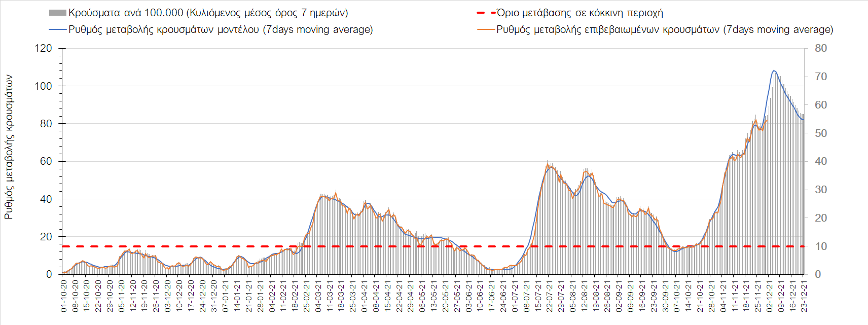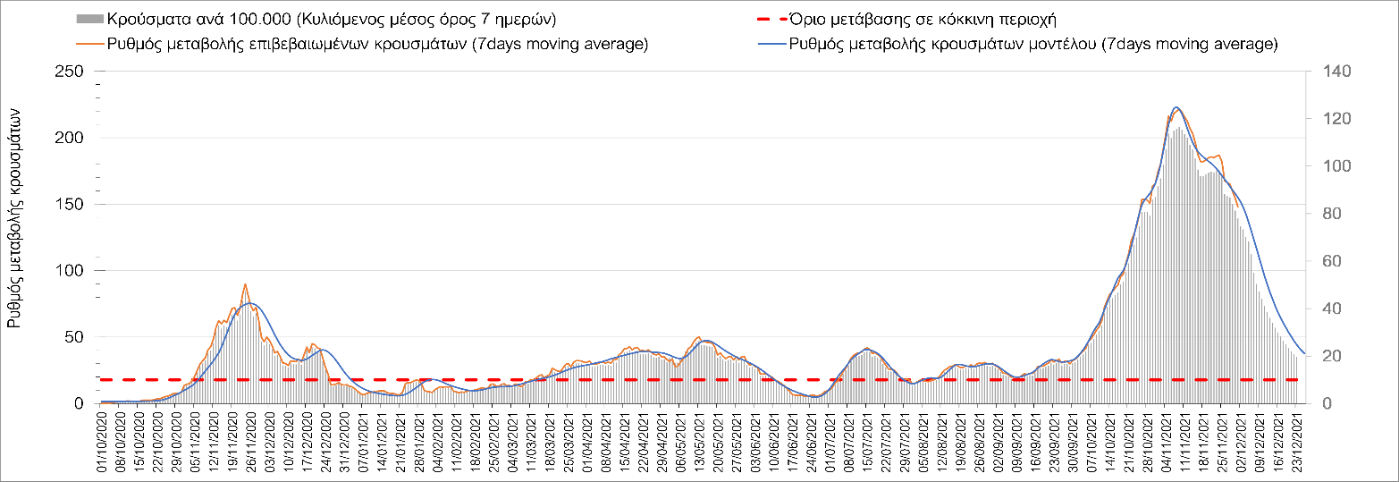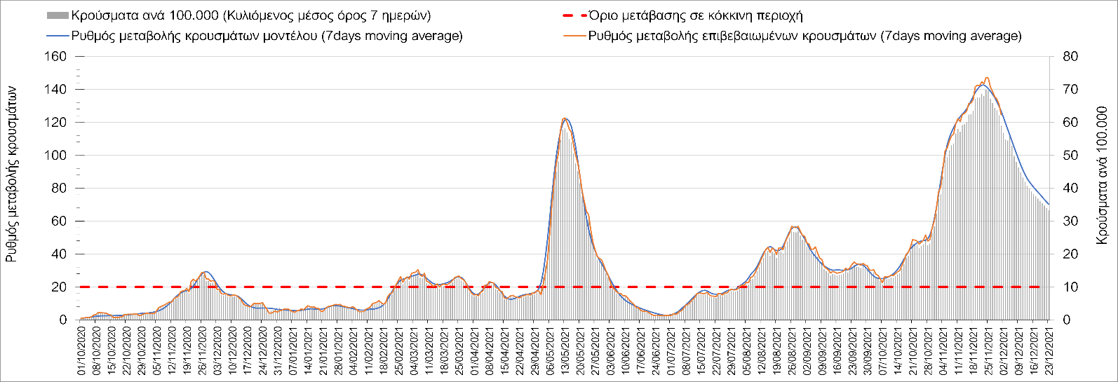 Η αποτύπωση των τάσεων στις επιμέρους περιοχές, παρουσιάζεται στο Σχήμα 61, όπου παρουσιάζεται ο ρυθμός μεταβολής των νέων κρουσμάτων ανά 100.000 κατοίκους (κυλιόμενος μέσος όρος 7 ημερών) των επιμέρους περιοχών. Θετικές τιμές του ρυθμού μεταβολής υποδηλώνουν άνοδο, ενώ αρνητικές τιμές υποδηλώνουν πτωτική πορεία. Το σχήμα αυτό είναι ιδιαίτερα κατατοπιστικό, γιατί οι τιμές που παρουσιάζονται είναι κανονικοποιημένες ως προς τον πληθυσμό, και η σύγκριση των τάσεων ανάμεσα στις επιμέρους περιοχές είναι άμεση.