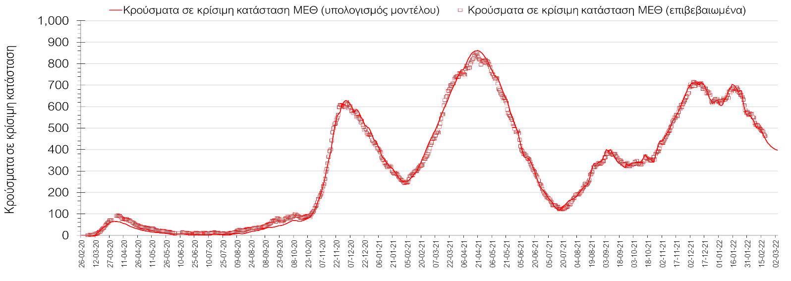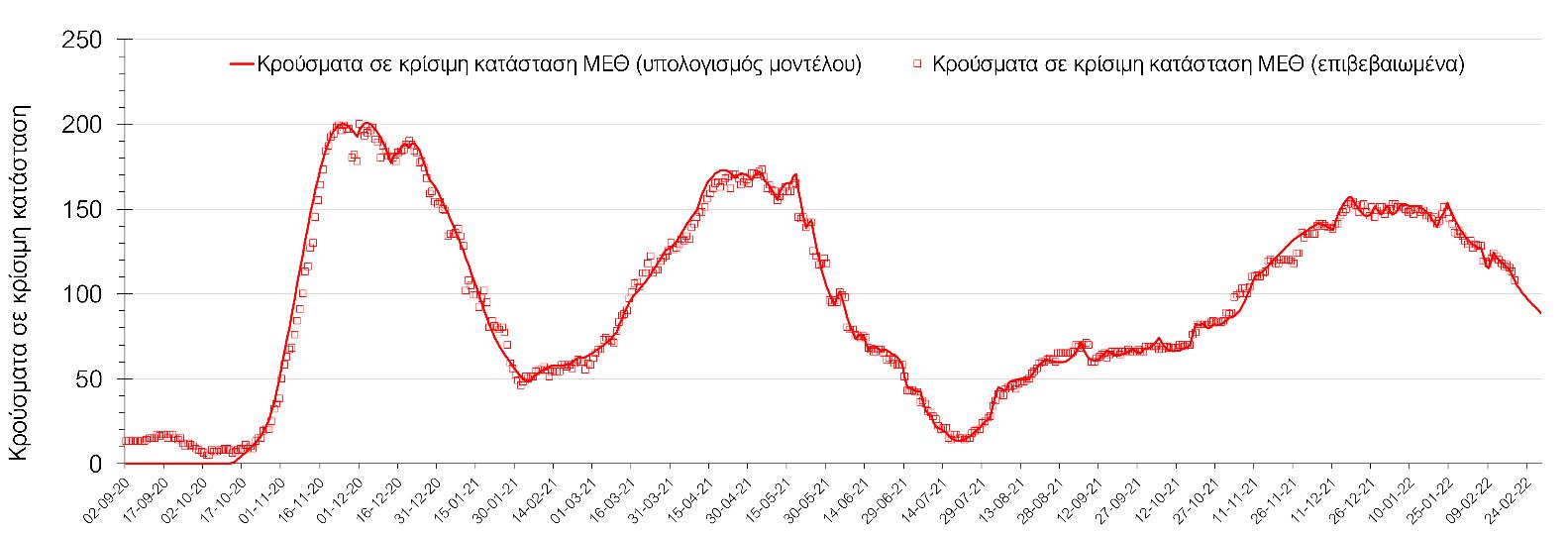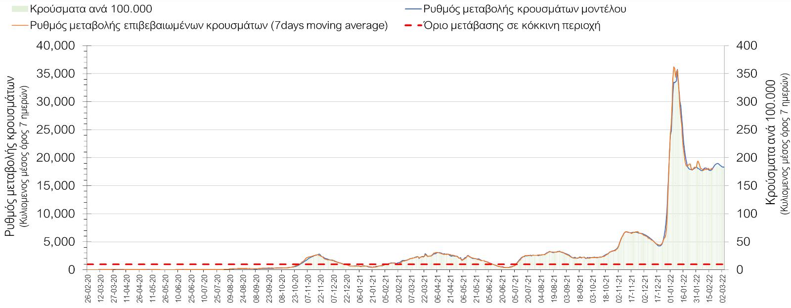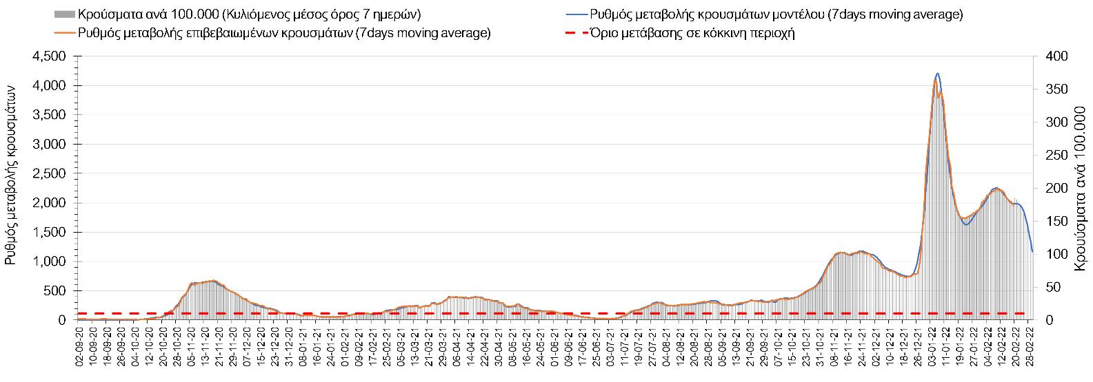 Η πορεία της μέσης εβδομαδιαίας τιμής των κρουσμάτων, καθώς και του κυλιόμενου μέσου όρου 7 ημερών του αριθμού των κρουσμάτων ανά 100.000 πληθυσμού, όπως έχουν καταγραφεί από τον ΕΟΔΥ και η αναμενόμενη πορεία τους, όπως προδιαγράφεται από την υπολογιστική πλατφόρμα CORE για την Ελληνική επικράτεια μέχρι τις 28 Φεβρουαρίου, αποτυπώνονται στο Σχήμα 4. Αυτή η προβλεπόμενη πορεία, που αφορά τα κρούσματα, τους νοσηλευόμενους σε απλές κλίνες, όσο και σε ΜΕΘ, καθώς επίσης και τους θανάτους, βασίζεται στις ακόλουθες παραδοχές: