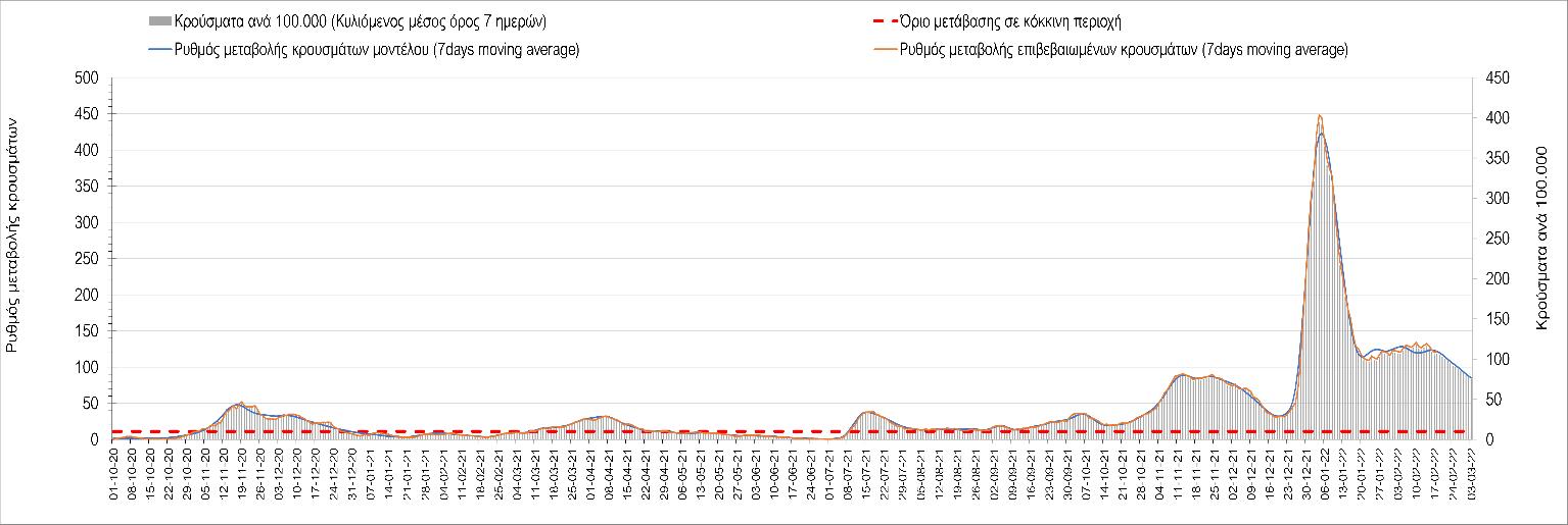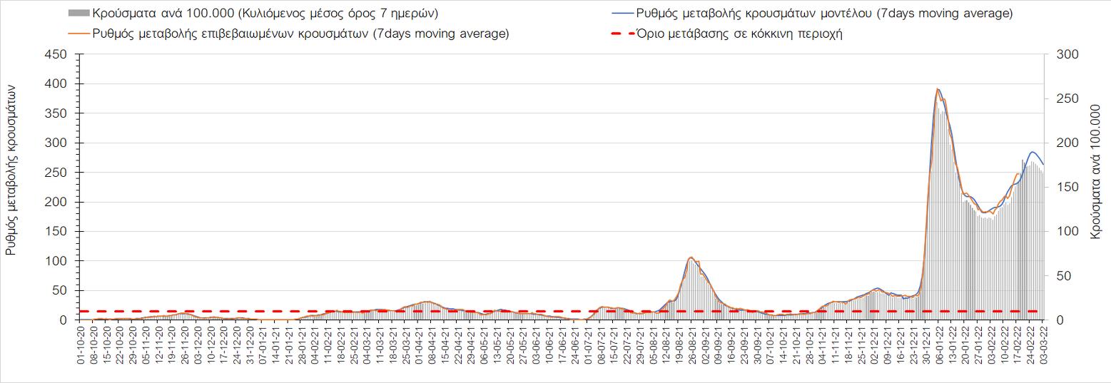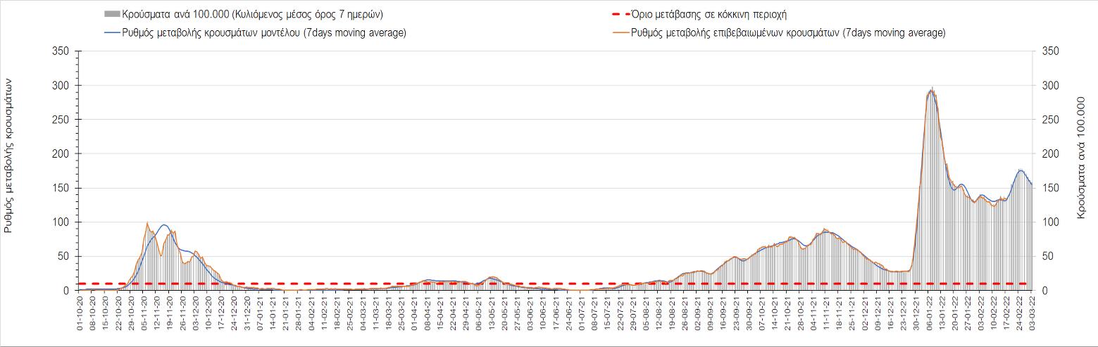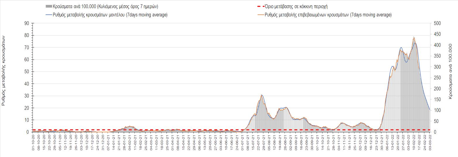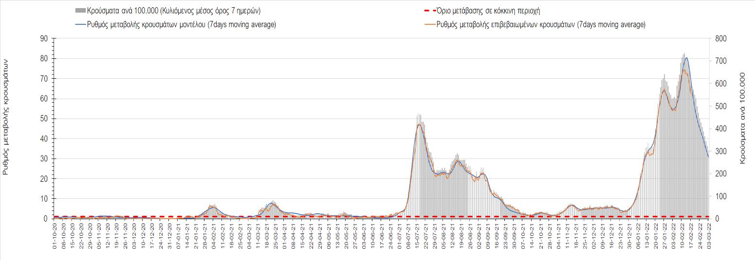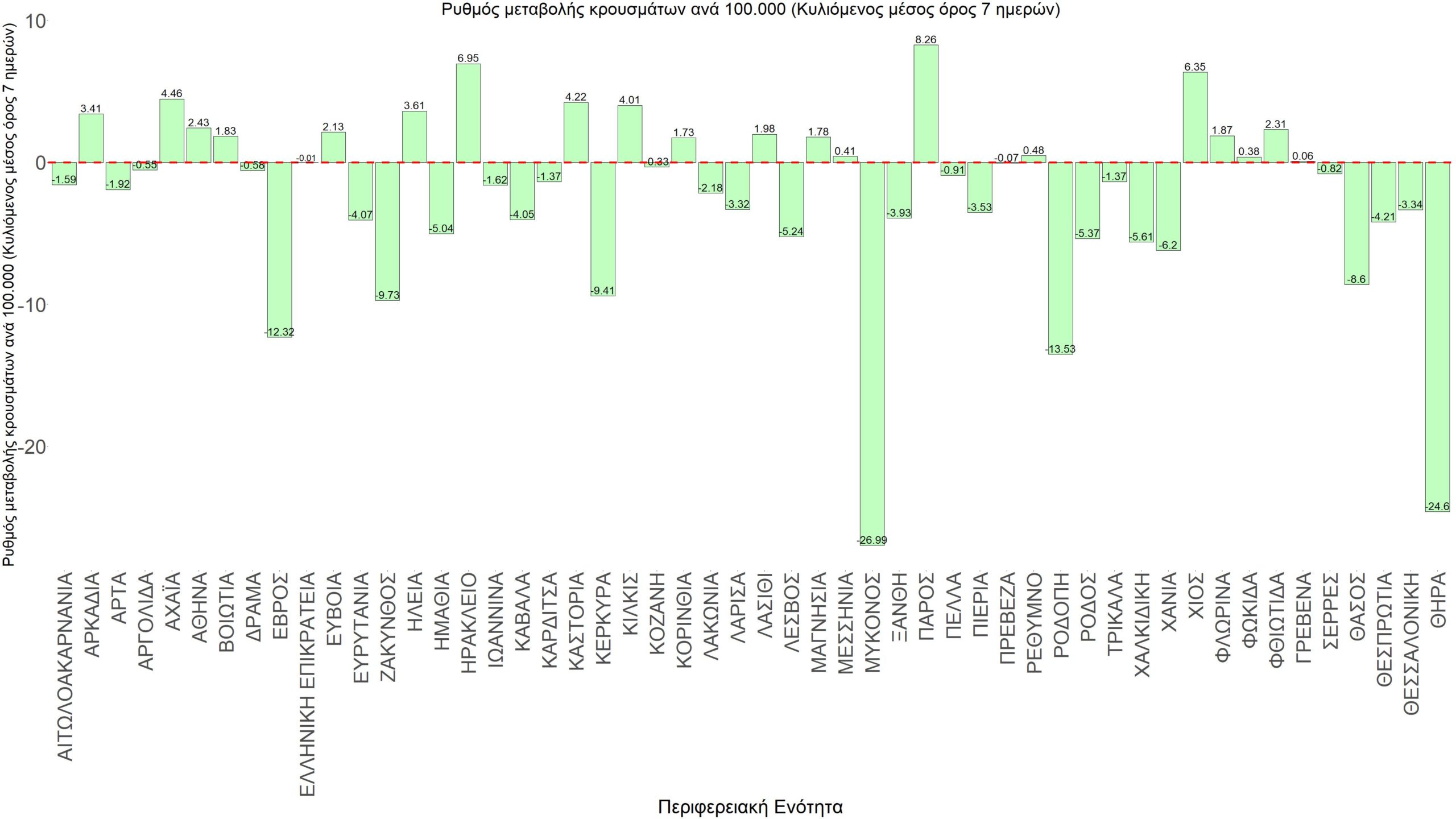 Η αποτύπωση των τάσεων στις επιμέρους περιοχές, παρουσιάζεται στο Σχήμα 61, όπου παρουσιάζεται ο ρυθμός μεταβολής των νέων κρουσμάτων ανά 100.000 κατοίκους (κυλιόμενος μέσος όρος 7 ημερών) των επιμέρους περιοχών. Θετικές τιμές του ρυθμού μεταβολής υποδηλώνουν άνοδο, ενώ αρνητικές τιμές υποδηλώνουν πτωτική πορεία.