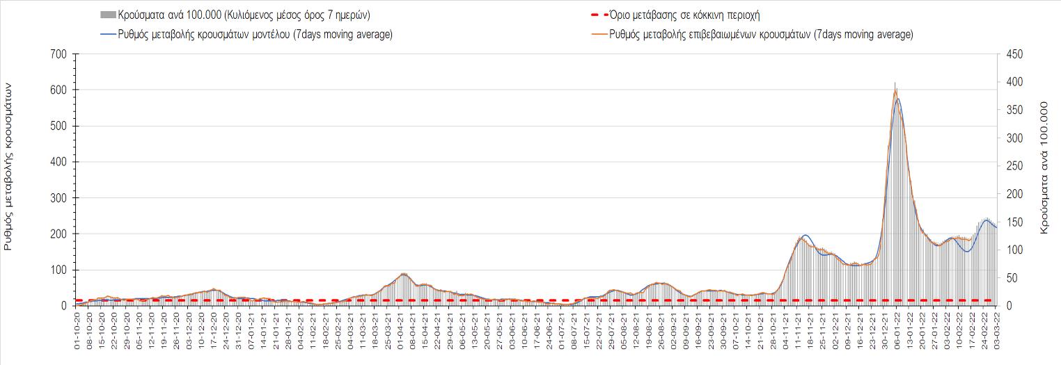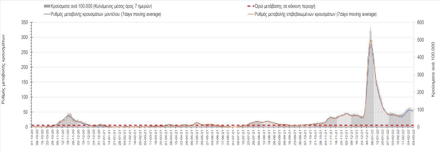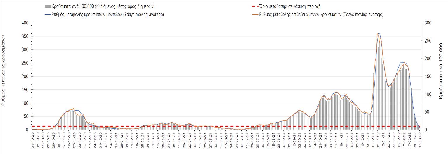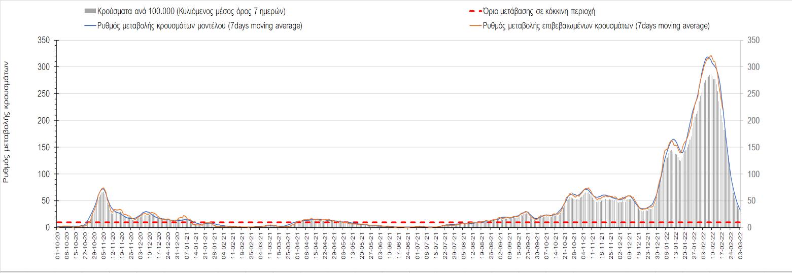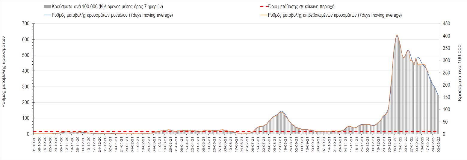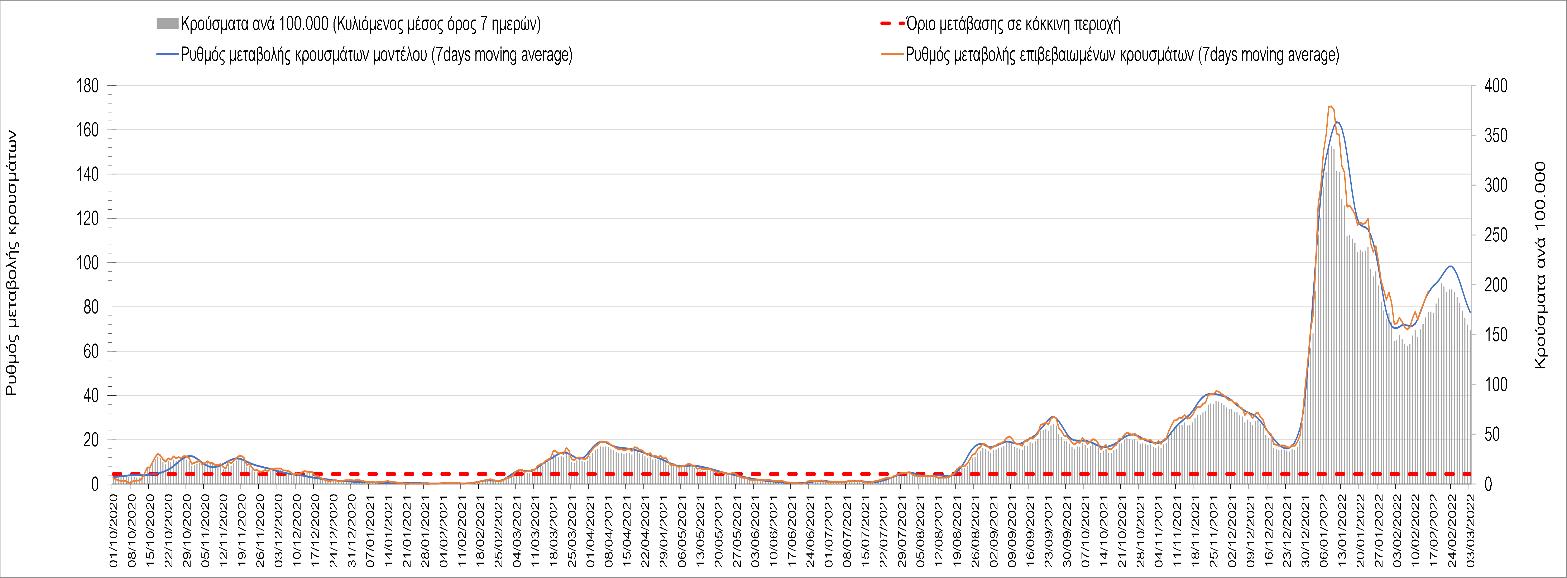 Η αποτύπωση των τάσεων στις επιμέρους περιοχές, παρουσιάζεται στο Σχήμα 61, όπου παρουσιάζεται ο ρυθμός μεταβολής των νέων κρουσμάτων ανά 100.000 κατοίκους (κυλιόμενος μέσος όρος 7 ημερών) των επιμέρους περιοχών. Θετικές τιμές του ρυθμού μεταβολής υποδηλώνουν άνοδο, ενώ αρνητικές τιμές υποδηλώνουν πτωτική πορεία.