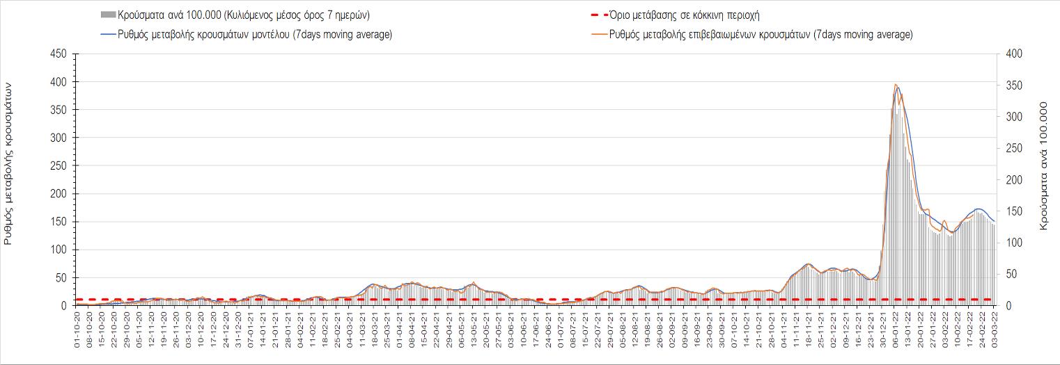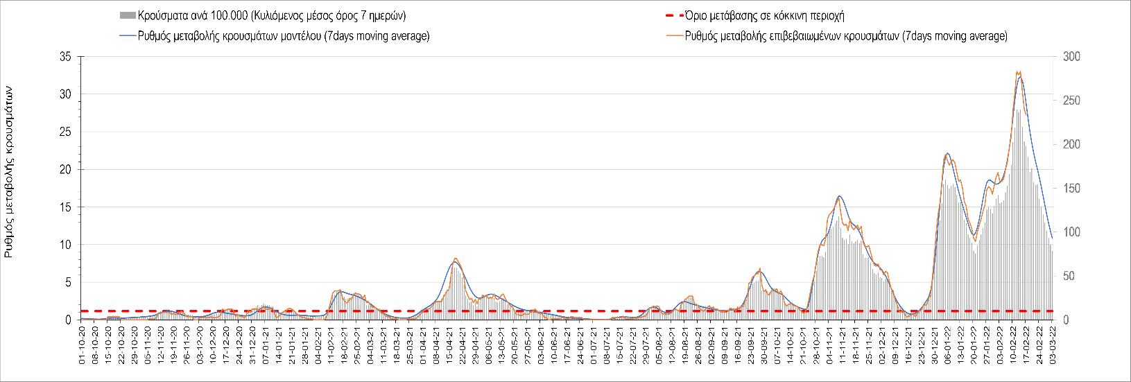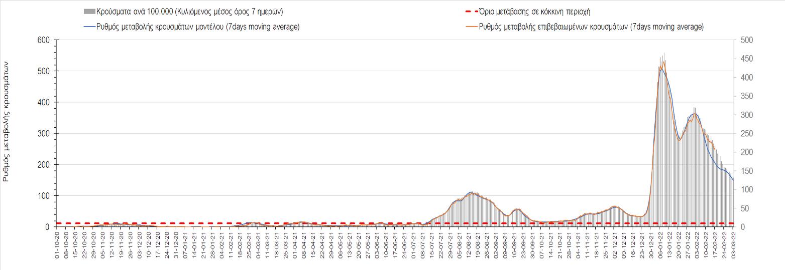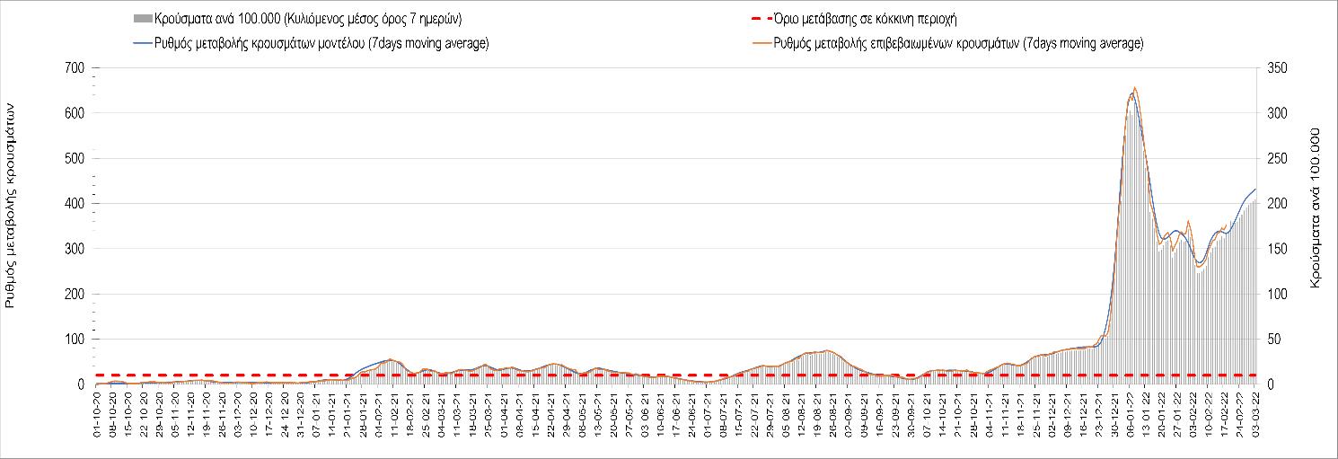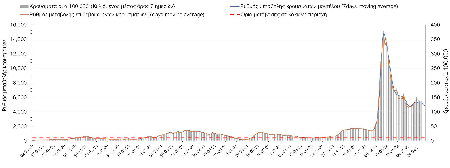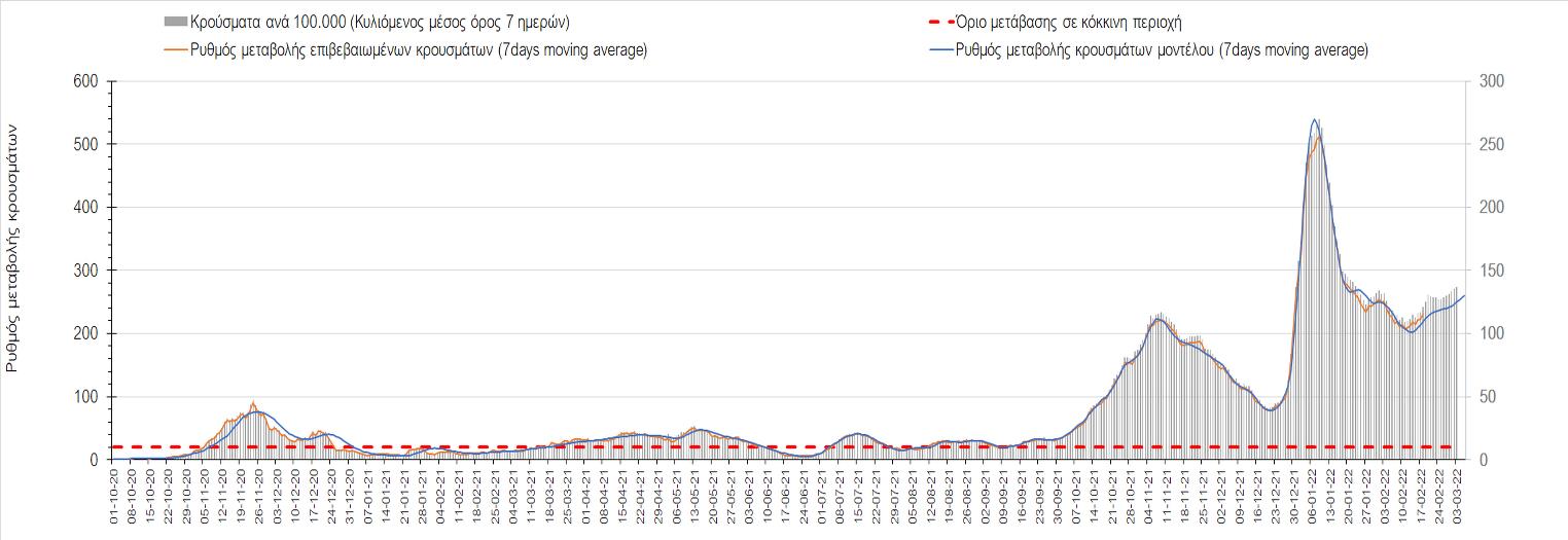 Η αποτύπωση των τάσεων στις επιμέρους περιοχές, παρουσιάζεται στο Σχήμα 61, όπου παρουσιάζεται ο ρυθμός μεταβολής των νέων κρουσμάτων ανά 100.000 κατοίκους (κυλιόμενος μέσος όρος 7 ημερών) των επιμέρους περιοχών. Θετικές τιμές του ρυθμού μεταβολής υποδηλώνουν άνοδο, ενώ αρνητικές τιμές υποδηλώνουν πτωτική πορεία.