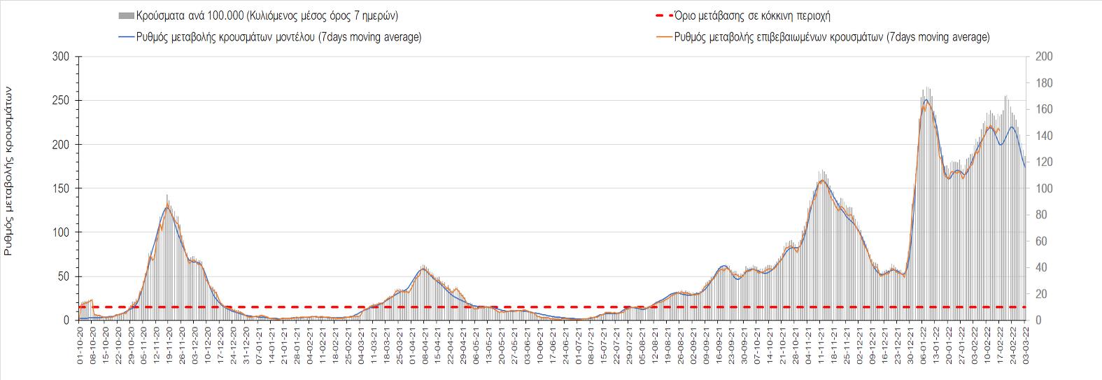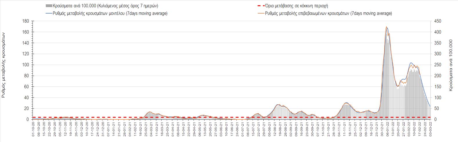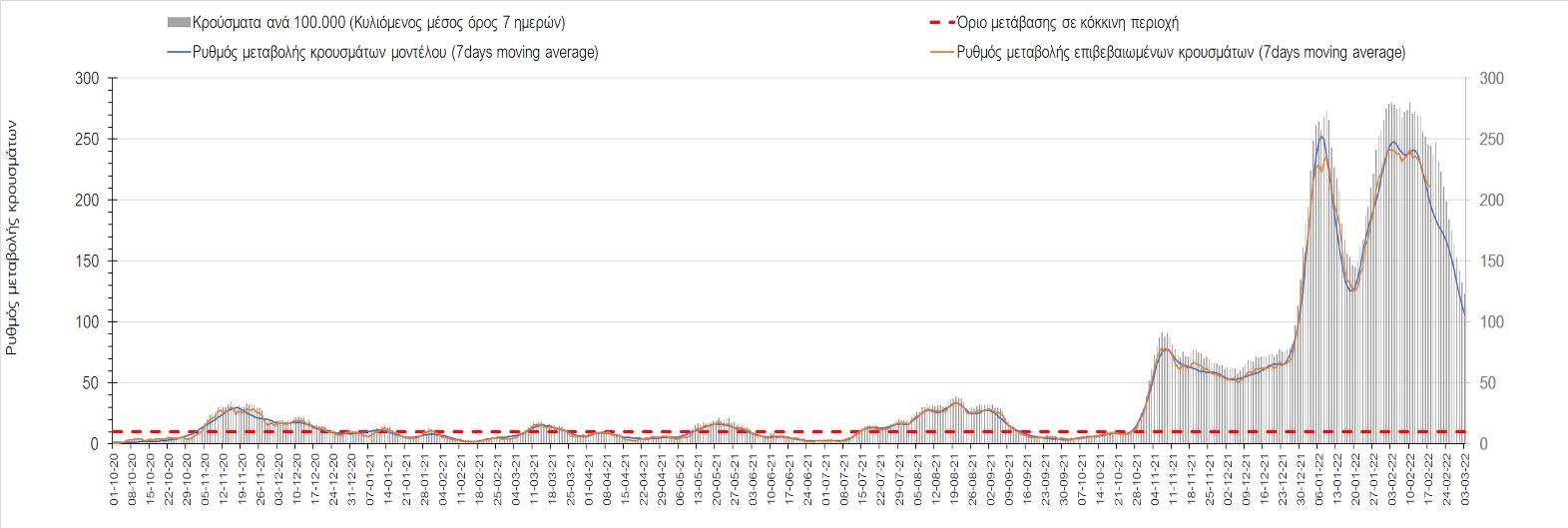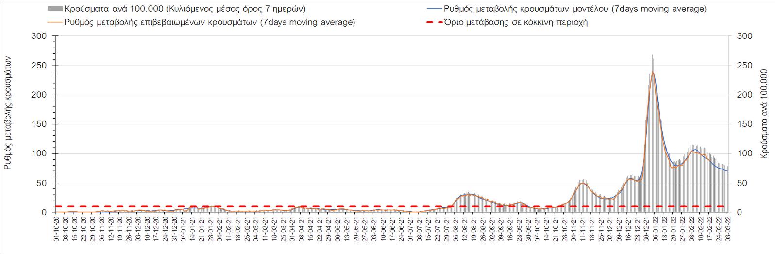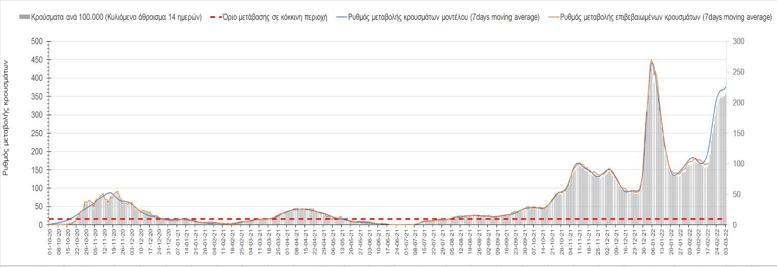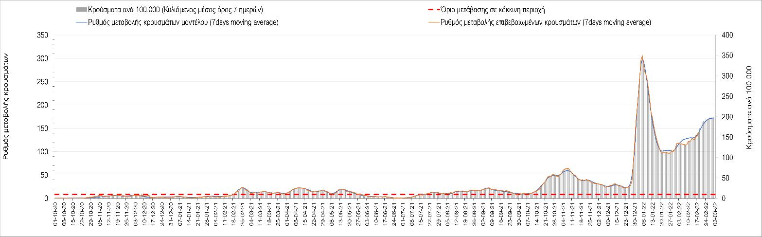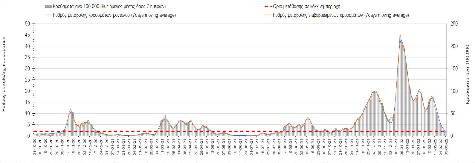 Η αποτύπωση των τάσεων στις επιμέρους περιοχές, παρουσιάζεται στο Σχήμα 61, όπου παρουσιάζεται ο ρυθμός μεταβολής των νέων κρουσμάτων ανά 100.000 κατοίκους (κυλιόμενος μέσος όρος 7 ημερών) των επιμέρους περιοχών. Θετικές τιμές του ρυθμού μεταβολής υποδηλώνουν άνοδο, ενώ αρνητικές τιμές υποδηλώνουν πτωτική πορεία.