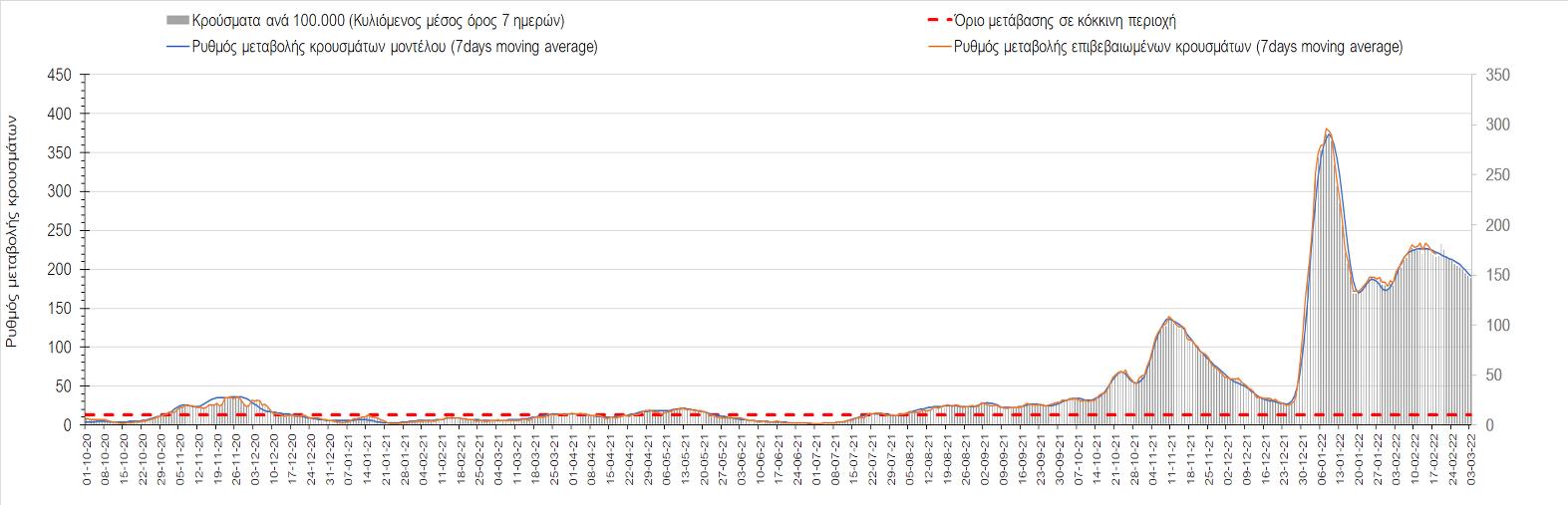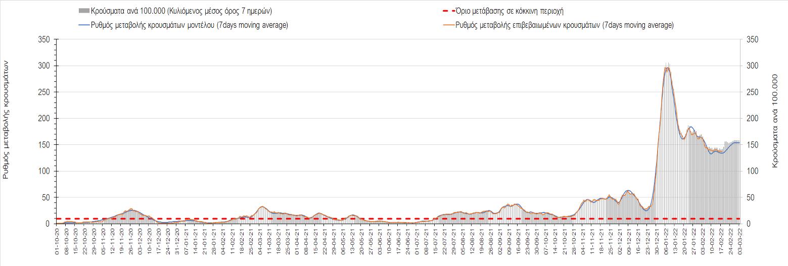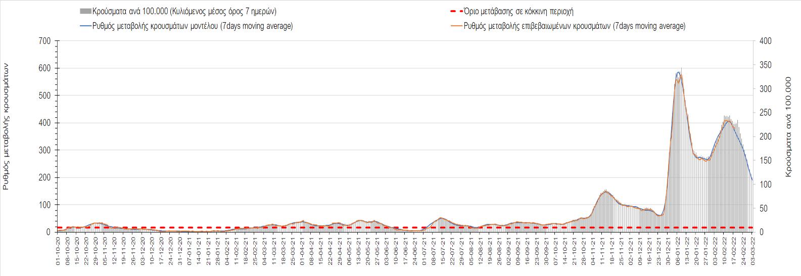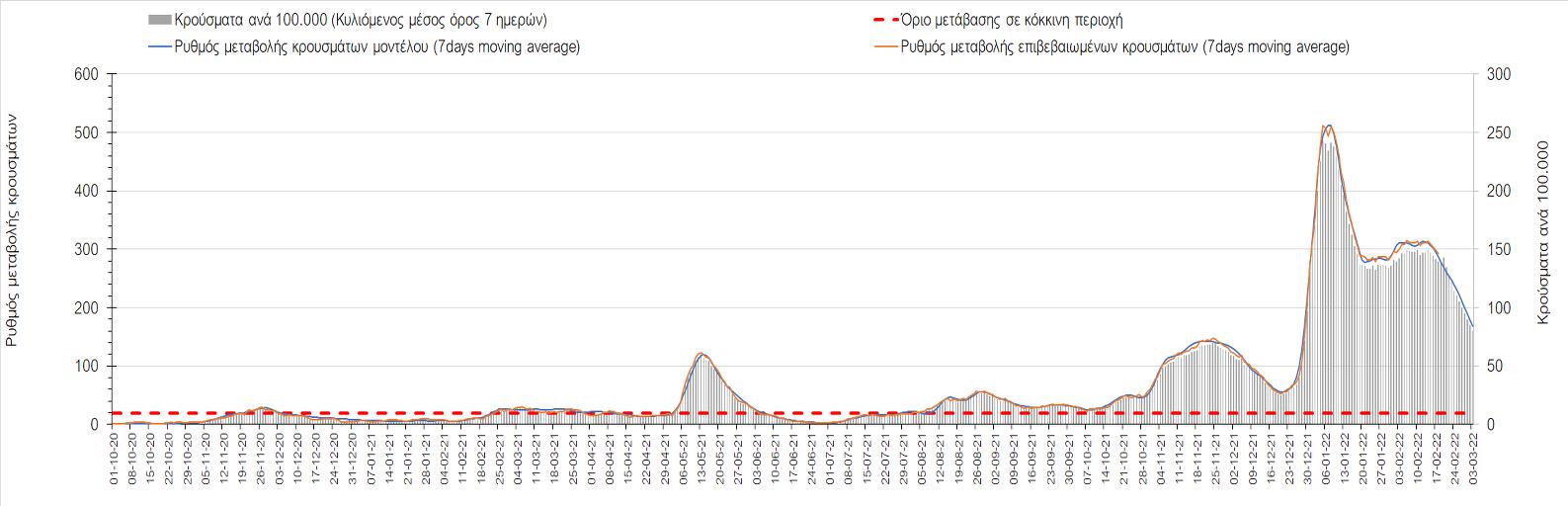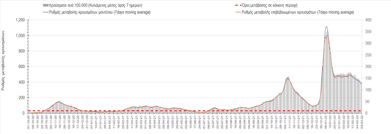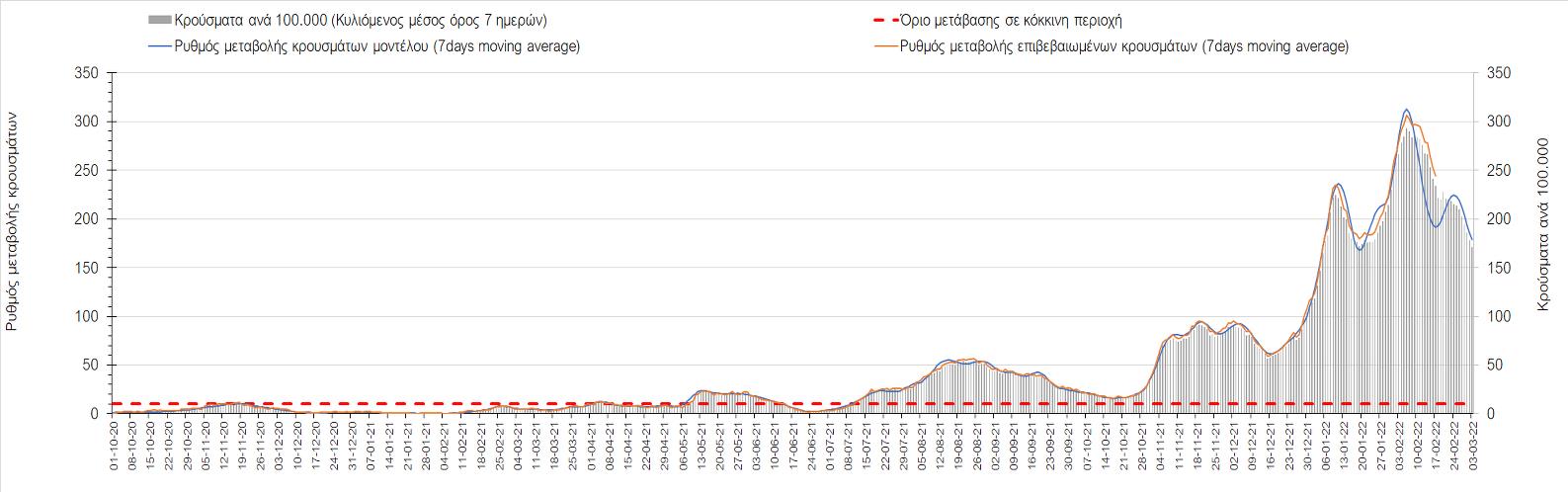Η αποτύπωση των τάσεων στις επιμέρους περιοχές, παρουσιάζεται στο Σχήμα 61, όπου παρουσιάζεται ο ρυθμός μεταβολής των νέων κρουσμάτων ανά 100.000 κατοίκους (κυλιόμενος μέσος όρος 7 ημερών) των επιμέρους περιοχών. Θετικές τιμές του ρυθμού μεταβολής υποδηλώνουν άνοδο, ενώ αρνητικές τιμές υποδηλώνουν πτωτική πορεία.