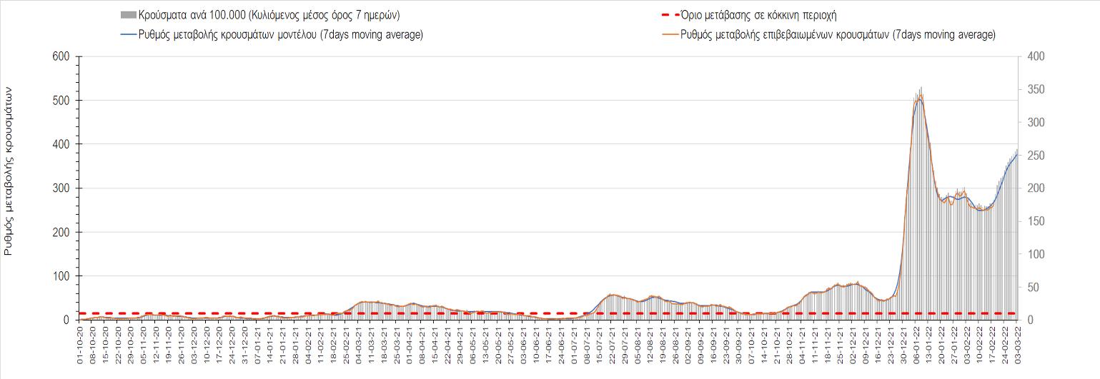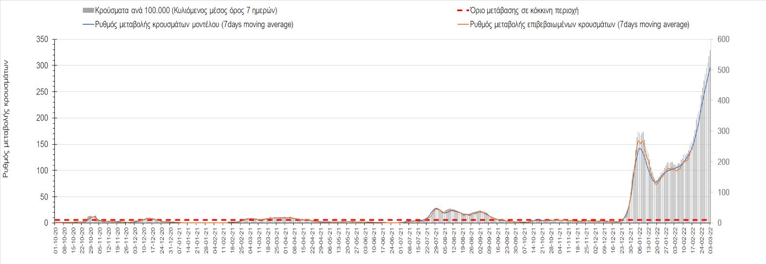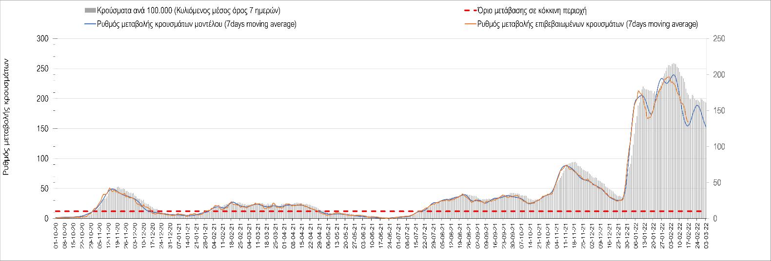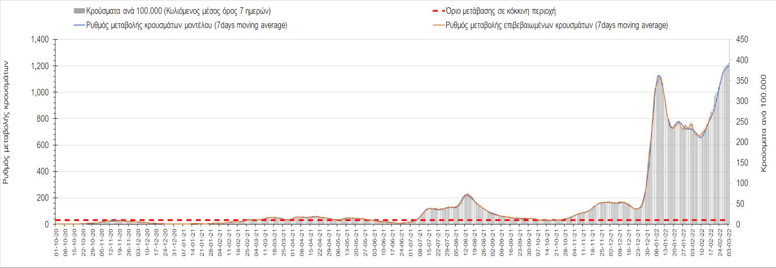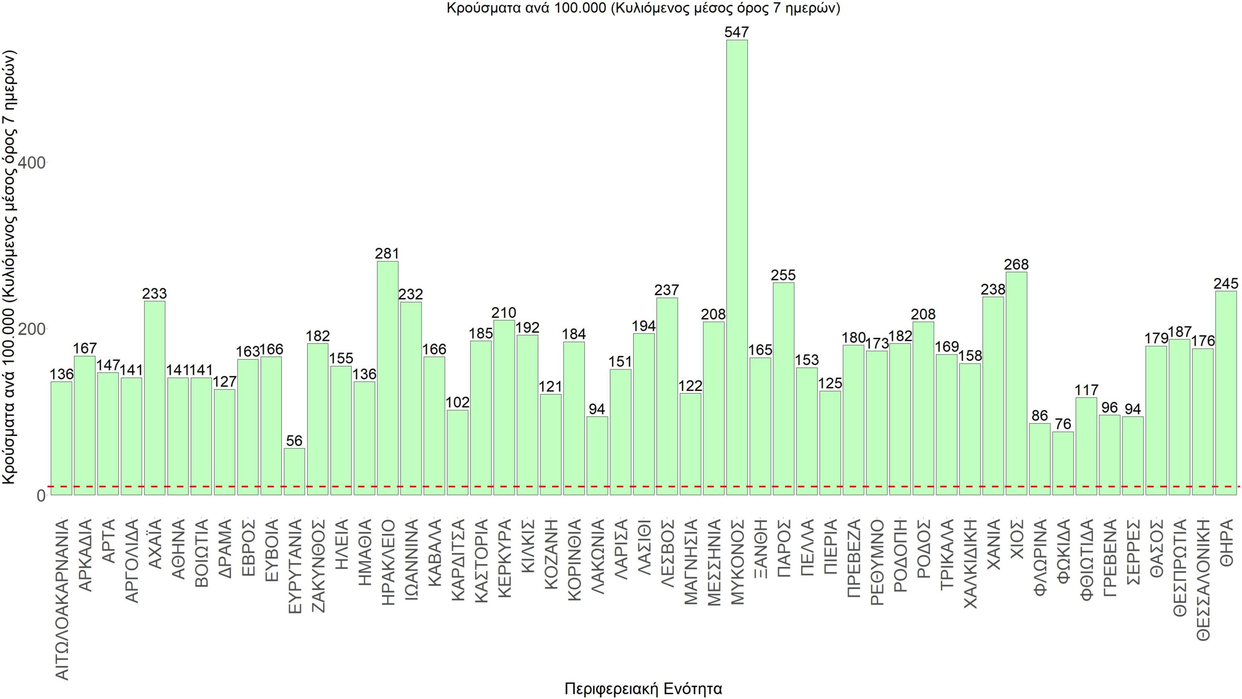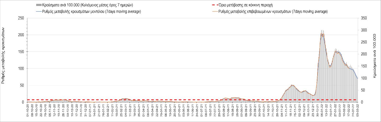 Η αποτύπωση των τάσεων στις επιμέρους περιοχές, παρουσιάζεται στο Σχήμα 61, όπου παρουσιάζεται ο ρυθμός μεταβολής των νέων κρουσμάτων ανά 100.000 κατοίκους (κυλιόμενος μέσος όρος 7 ημερών) των επιμέρους περιοχών. Θετικές τιμές του ρυθμού μεταβολής υποδηλώνουν άνοδο, ενώ αρνητικές τιμές υποδηλώνουν πτωτική πορεία.