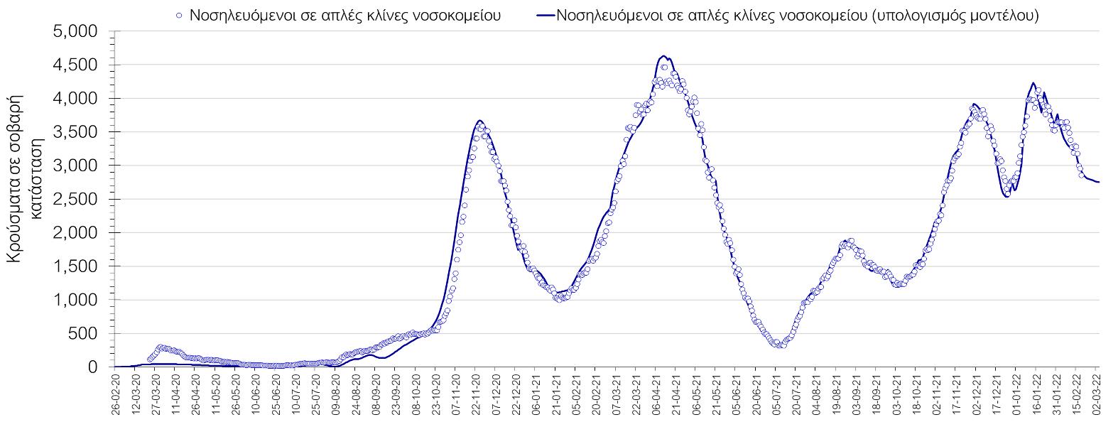 Σχήμα 2. Αριθμός κρουσμάτων σε σοβαρή κατάσταση (νοσηλευόμενοι σε απλές κλίνες) σύμφωνα με τα στοιχεία του ΕΟΔΥ και τις προβλέψεις της υπολογιστικής πλατφόρμας CORE.