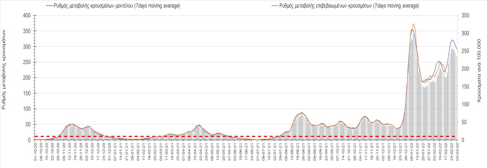 Σχήμα 4. Πορεία του ημερησίου αριθμού των κρουσμάτων (κυλιόμενος μέσος όρος 7 ημερών) στην Ελληνική επικράτεια