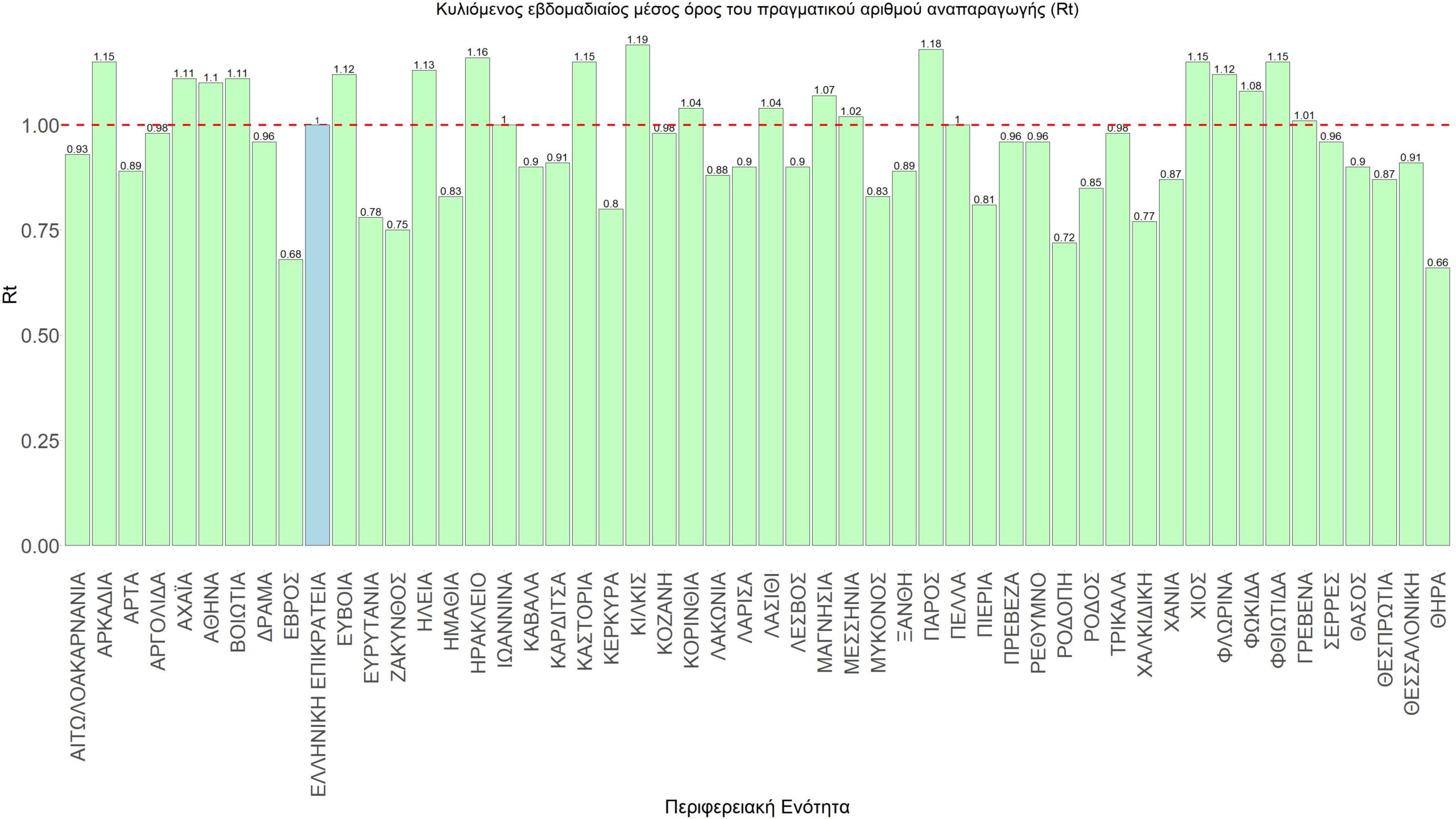 O πραγματικός αριθμός αναπαραγωγής Rt ανά περιφερειακή ενότητα της χώρας παρουσιάζεται στο Σχήμα 58.