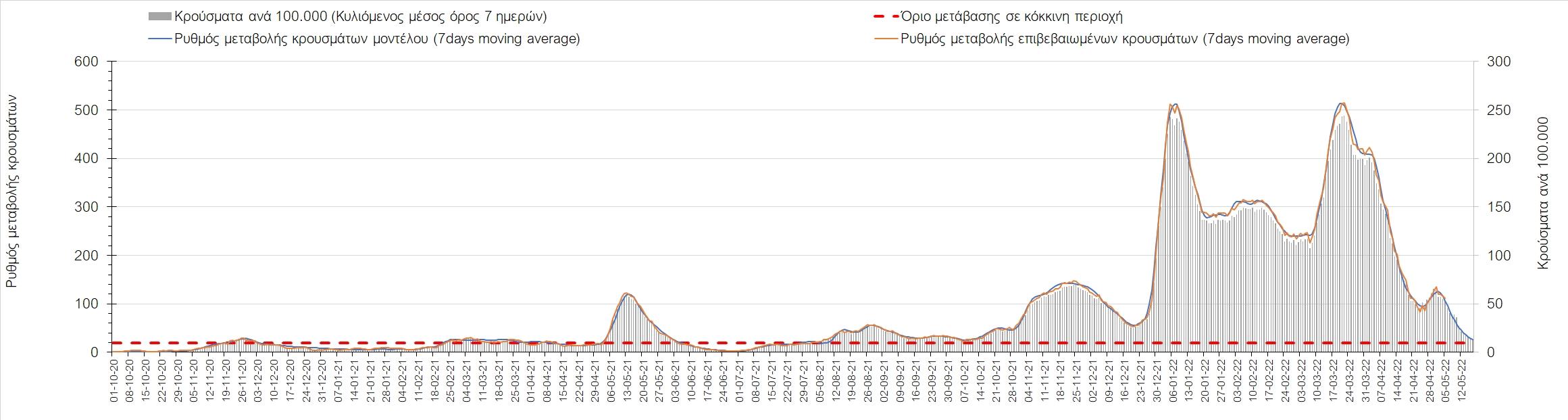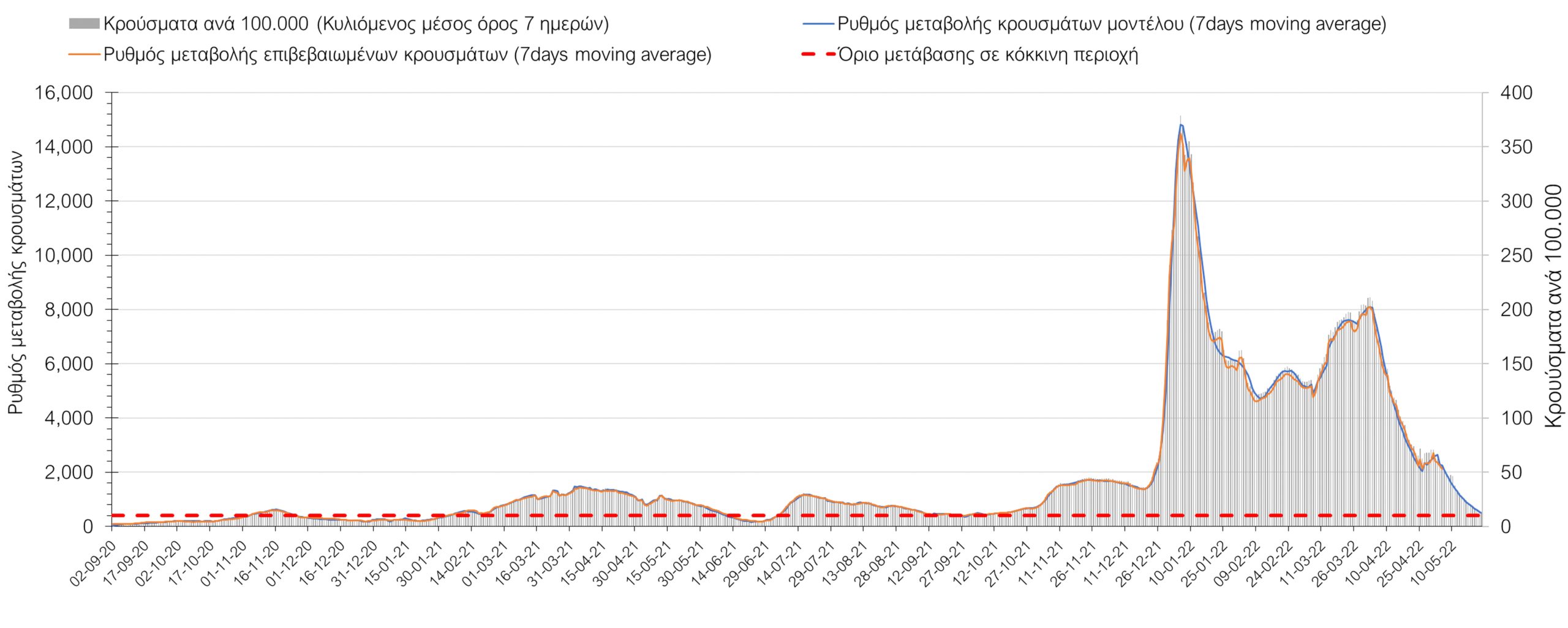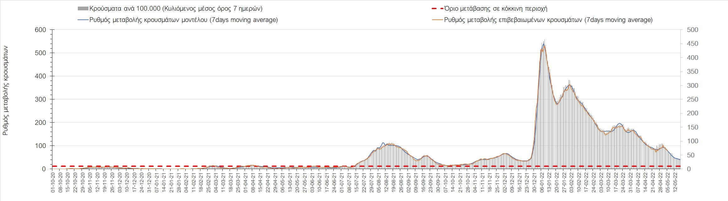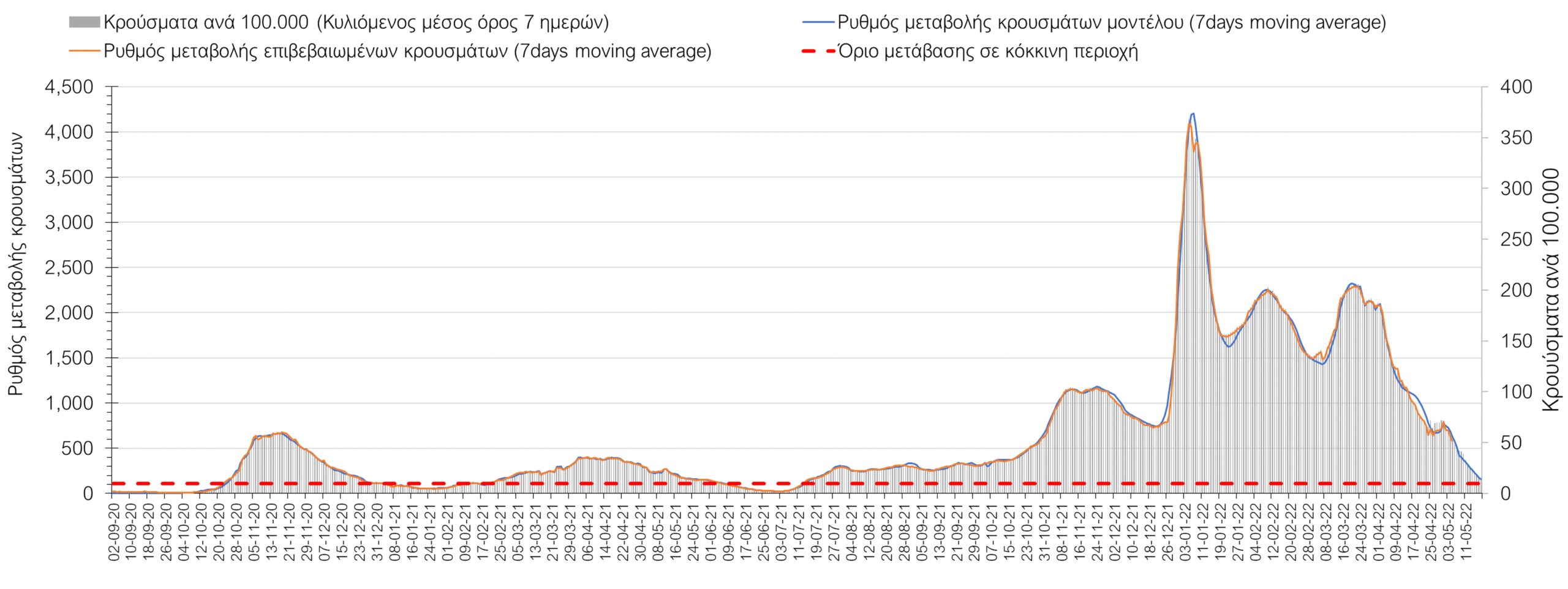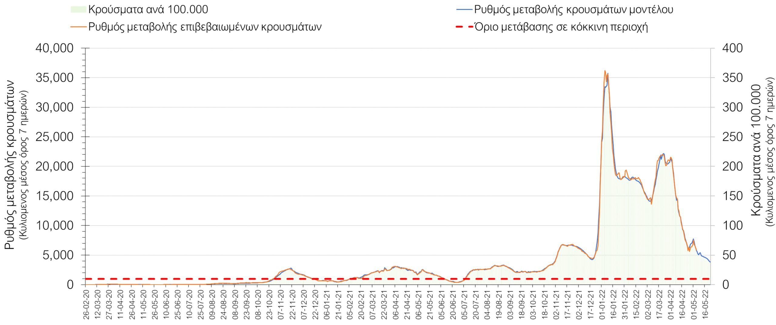 Η πτωτική πορεία των προηγούμενων δύο εβδομάδων έχει δώσει τη θέση της σε προσωρινή αναστροφή, η οποία όμως τώρα κάμπτεται και αυτό αντικατοπτρίζεται και στον ημερήσιο αριθμό των κρουσμάτων (κυλιόμενος μέσος όρος 7 ημερών), ο οποίος και την Πέμπτη εμφανίζει μείωση σε σχέση με την Τετάρτη, και πλέον βρίσκεται κάτω από τις 5.500 (5.880). Όπως είχαμε προβλέψει, η ανοδική διακύμανση σε όλες σχεδόν τις περιοχές ξεκίνησε να κάμπτεται αυτή την εβδομάδα, αλλά για να επανέλθει η συστηματική αποκλιμάκωση της πανδημίας, πέρα από την εφαρμογή των μέτρων (σε συνδυασμό με την σημαντική συνειδητοποίηση εκ μέρους του πληθυσμού ότι χρειάζεται προσοχή και σύνεση για την αντιμετώπιση της διασποράς της παραλλαγής Ο), θα πρέπει να στοχεύσουμε στη διατήρηση και την επέκταση της επίκτητης ανοσίας του πληθυσμού, αλλά και στον μεγάλο αριθμό των τεστ συνολικά (μοριακά, rapid και self-test) που πραγματοποιούνται καθημερινά. Για αυτό το λόγο και με δεδομένη τη μεγάλη διασπορά στα σχολεία θεωρούμε πρόωρη την κατάργηση των self-test στα παιδιά σχολικής ηλικίας με την επιστροφή τους μετά την Πρωτομαγιά, ειδικά σε συνδυασμό με την ανοδική διακύμανση που παρατηρήθηκε.