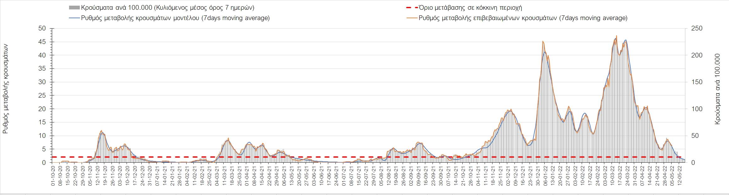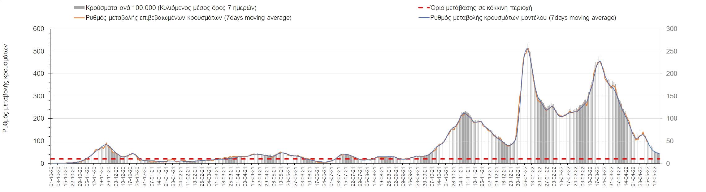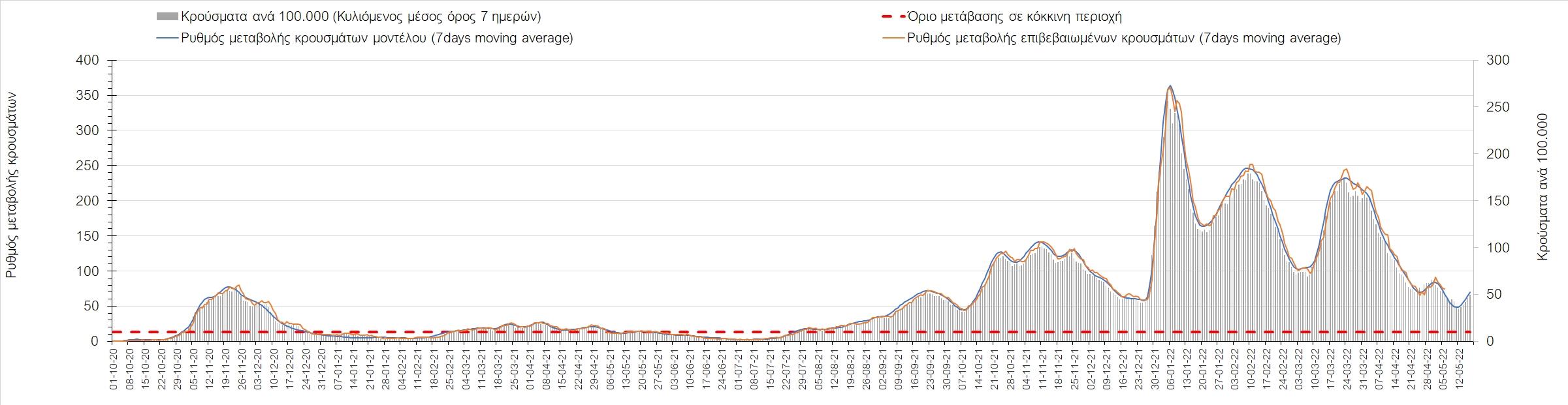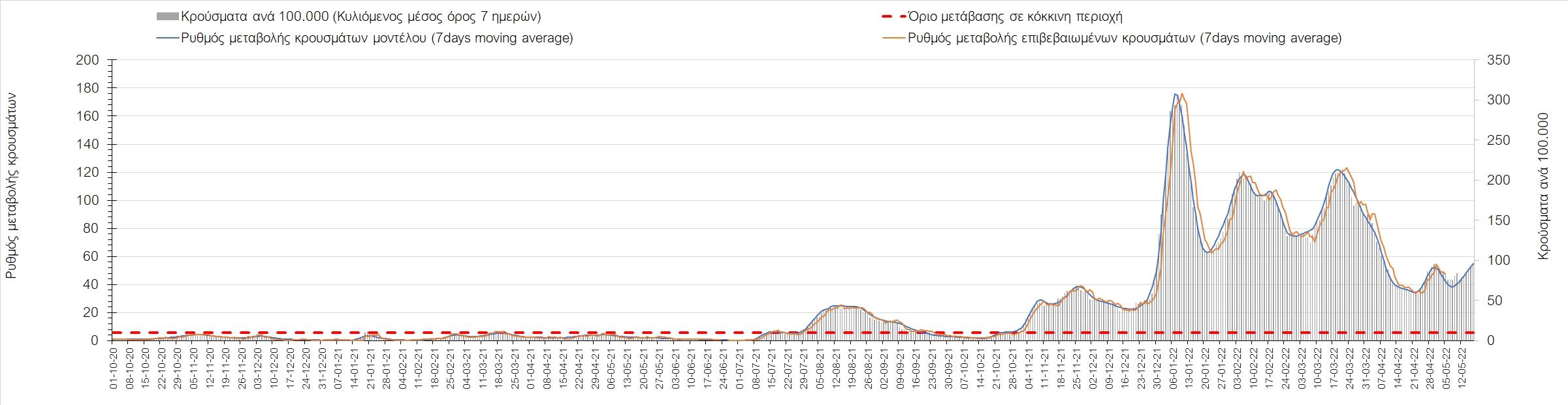 Η πτωτική πορεία των προηγούμενων δύο εβδομάδων έχει δώσει τη θέση της σε προσωρινή αναστροφή, η οποία όμως τώρα κάμπτεται και αυτό αντικατοπτρίζεται και στον ημερήσιο αριθμό των κρουσμάτων (κυλιόμενος μέσος όρος 7 ημερών), ο οποίος και την Πέμπτη εμφανίζει μείωση σε σχέση με την Τετάρτη, και πλέον βρίσκεται κάτω από τις 5.500 (5.880). Όπως είχαμε προβλέψει, η ανοδική διακύμανση σε όλες σχεδόν τις περιοχές ξεκίνησε να κάμπτεται αυτή την εβδομάδα, αλλά για να επανέλθει η συστηματική αποκλιμάκωση της πανδημίας, πέρα από την εφαρμογή των μέτρων (σε συνδυασμό με την σημαντική συνειδητοποίηση εκ μέρους του πληθυσμού ότι χρειάζεται προσοχή και σύνεση για την αντιμετώπιση της διασποράς της παραλλαγής Ο), θα πρέπει να στοχεύσουμε στη διατήρηση και την επέκταση της επίκτητης ανοσίας του πληθυσμού, αλλά και στον μεγάλο αριθμό των τεστ συνολικά (μοριακά, rapid και self-test) που πραγματοποιούνται καθημερινά. Για αυτό το λόγο και με δεδομένη τη μεγάλη διασπορά στα σχολεία θεωρούμε πρόωρη την κατάργηση των self-test στα παιδιά σχολικής ηλικίας με την επιστροφή τους μετά την Πρωτομαγιά, ειδικά σε συνδυασμό με την ανοδική διακύμανση που παρατηρήθηκε.