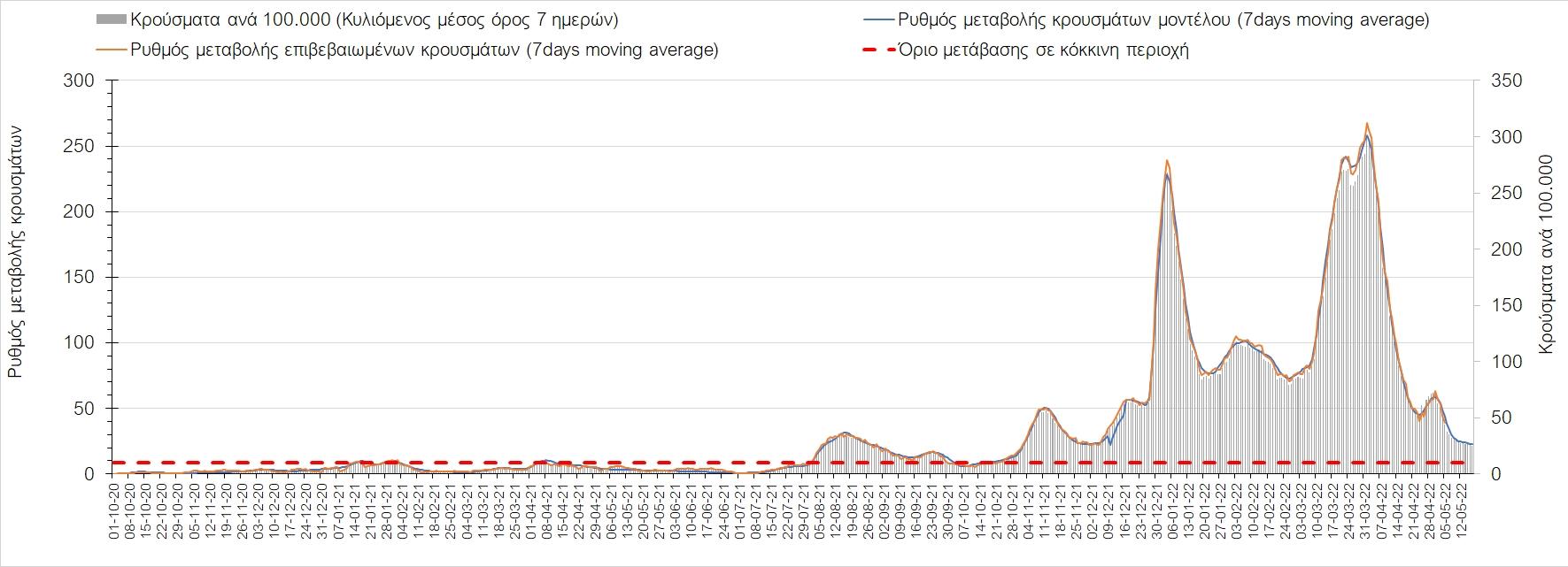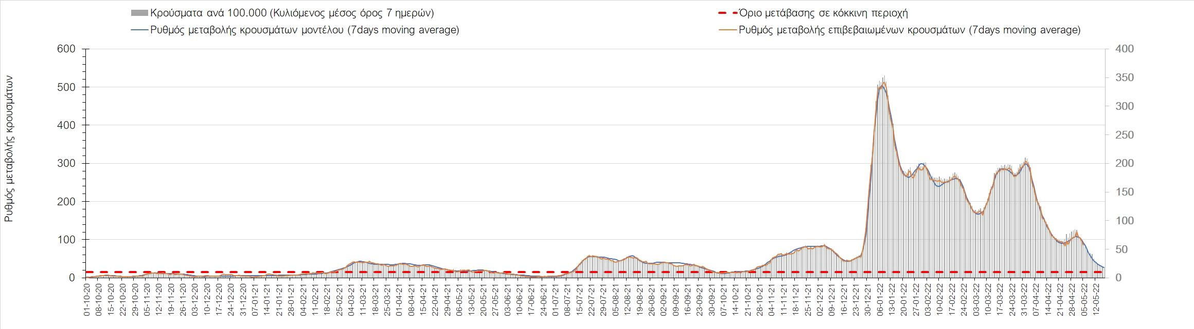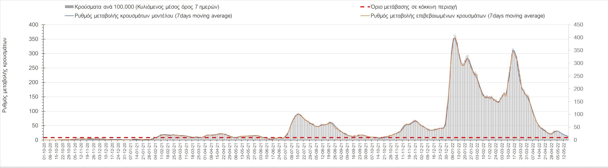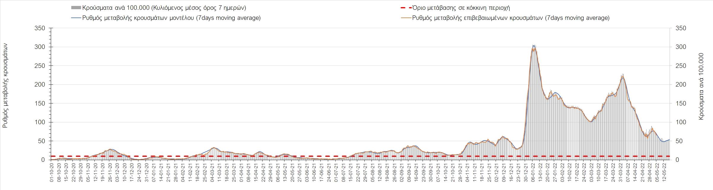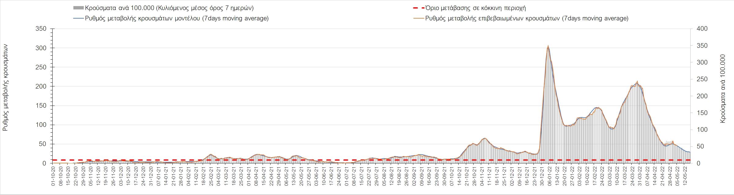Η πτωτική πορεία των προηγούμενων δύο εβδομάδων έχει δώσει τη θέση της σε προσωρινή αναστροφή, η οποία όμως τώρα κάμπτεται και αυτό αντικατοπτρίζεται και στον ημερήσιο αριθμό των κρουσμάτων (κυλιόμενος μέσος όρος 7 ημερών), ο οποίος και την Πέμπτη εμφανίζει μείωση σε σχέση με την Τετάρτη, και πλέον βρίσκεται κάτω από τις 5.500 (5.880). Όπως είχαμε προβλέψει, η ανοδική διακύμανση σε όλες σχεδόν τις περιοχές ξεκίνησε να κάμπτεται αυτή την εβδομάδα, αλλά για να επανέλθει η συστηματική αποκλιμάκωση της πανδημίας, πέρα από την εφαρμογή των μέτρων (σε συνδυασμό με την σημαντική συνειδητοποίηση εκ μέρους του πληθυσμού ότι χρειάζεται προσοχή και σύνεση για την αντιμετώπιση της διασποράς της παραλλαγής Ο), θα πρέπει να στοχεύσουμε στη διατήρηση και την επέκταση της επίκτητης ανοσίας του πληθυσμού, αλλά και στον μεγάλο αριθμό των τεστ συνολικά (μοριακά, rapid και self-test) που πραγματοποιούνται καθημερινά. Για αυτό το λόγο και με δεδομένη τη μεγάλη διασπορά στα σχολεία θεωρούμε πρόωρη την κατάργηση των self-test στα παιδιά σχολικής ηλικίας με την επιστροφή τους μετά την Πρωτομαγιά, ειδικά σε συνδυασμό με την ανοδική διακύμανση που παρατηρήθηκε.