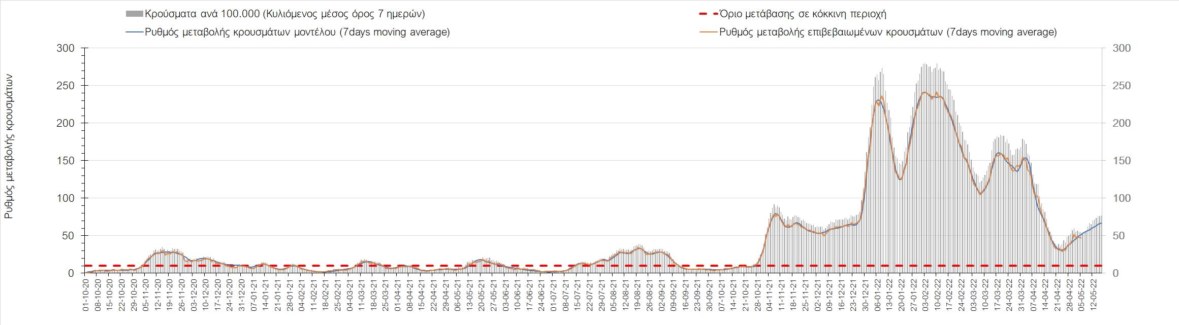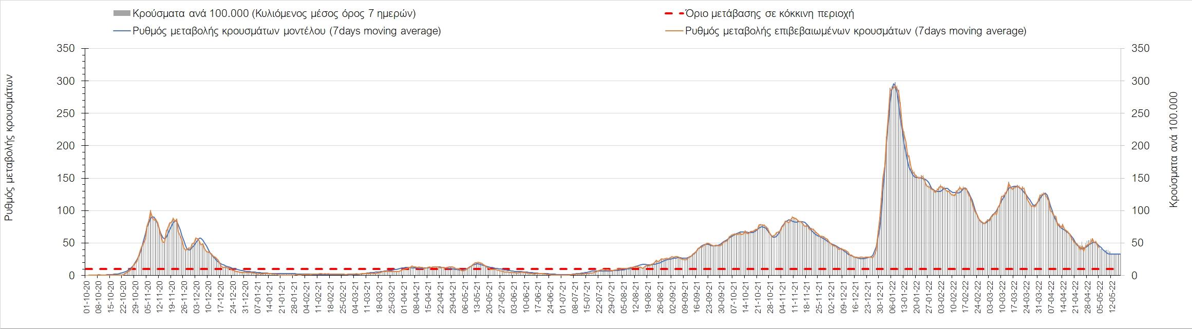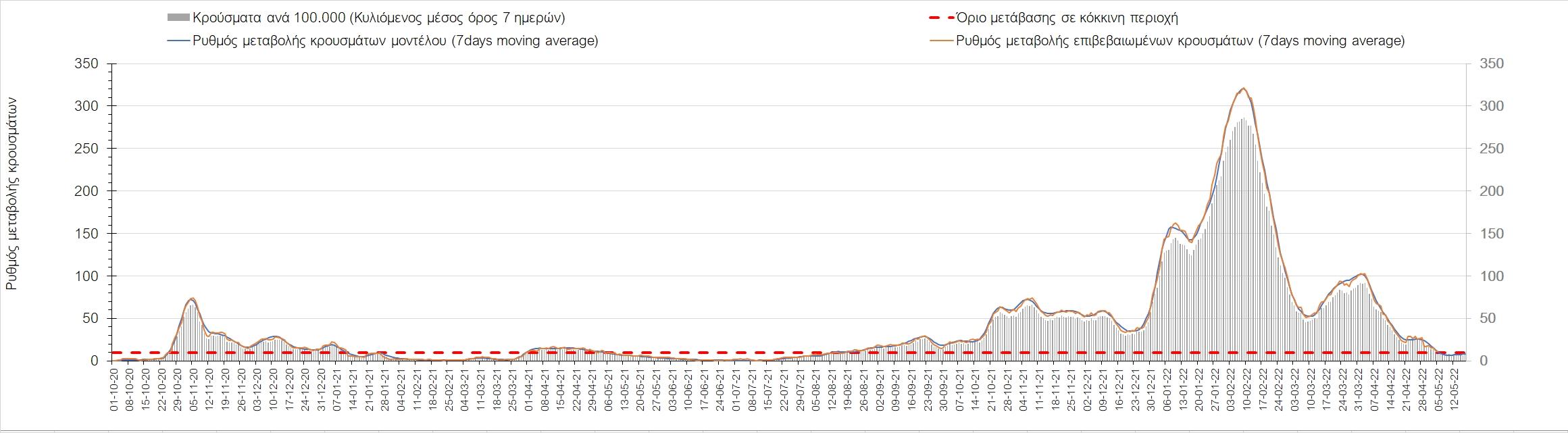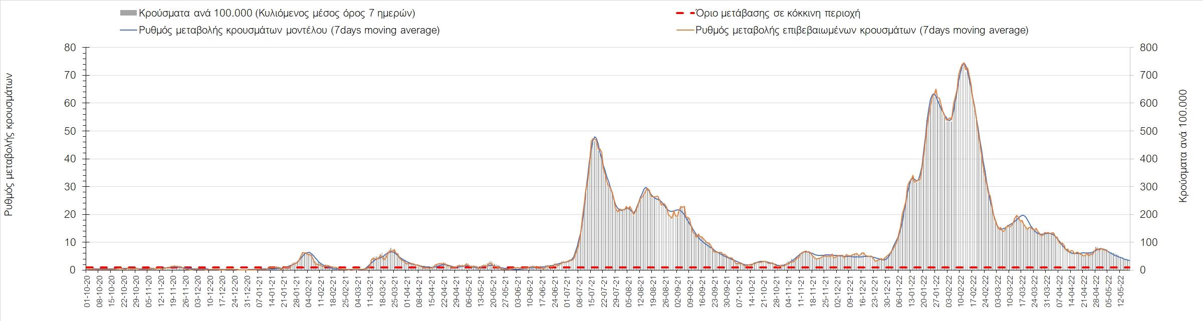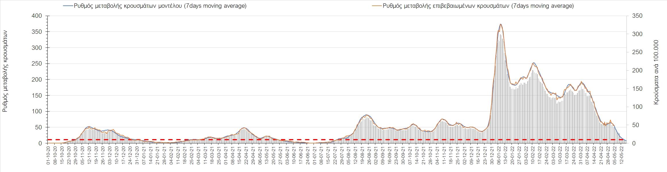 Η πτωτική πορεία των προηγούμενων δύο εβδομάδων έχει δώσει τη θέση της σε προσωρινή αναστροφή, η οποία όμως τώρα κάμπτεται και αυτό αντικατοπτρίζεται και στον ημερήσιο αριθμό των κρουσμάτων (κυλιόμενος μέσος όρος 7 ημερών), ο οποίος και την Πέμπτη εμφανίζει μείωση σε σχέση με την Τετάρτη, και πλέον βρίσκεται κάτω από τις 5.500 (5.880). Όπως είχαμε προβλέψει, η ανοδική διακύμανση σε όλες σχεδόν τις περιοχές ξεκίνησε να κάμπτεται αυτή την εβδομάδα, αλλά για να επανέλθει η συστηματική αποκλιμάκωση της πανδημίας, πέρα από την εφαρμογή των μέτρων (σε συνδυασμό με την σημαντική συνειδητοποίηση εκ μέρους του πληθυσμού ότι χρειάζεται προσοχή και σύνεση για την αντιμετώπιση της διασποράς της παραλλαγής Ο), θα πρέπει να στοχεύσουμε στη διατήρηση και την επέκταση της επίκτητης ανοσίας του πληθυσμού, αλλά και στον μεγάλο αριθμό των τεστ συνολικά (μοριακά, rapid και self-test) που πραγματοποιούνται καθημερινά. Για αυτό το λόγο και με δεδομένη τη μεγάλη διασπορά στα σχολεία θεωρούμε πρόωρη την κατάργηση των self-test στα παιδιά σχολικής ηλικίας με την επιστροφή τους μετά την Πρωτομαγιά, ειδικά σε συνδυασμό με την ανοδική διακύμανση που παρατηρήθηκε.